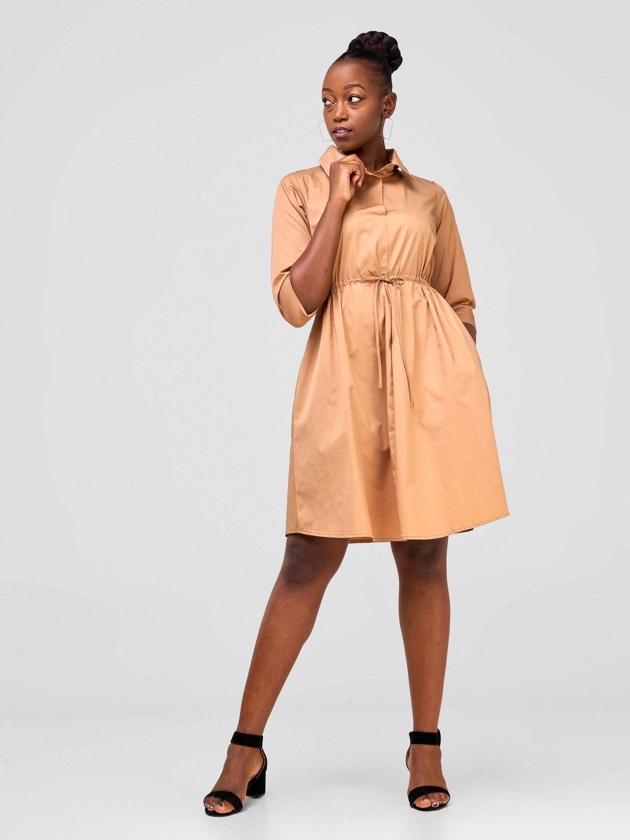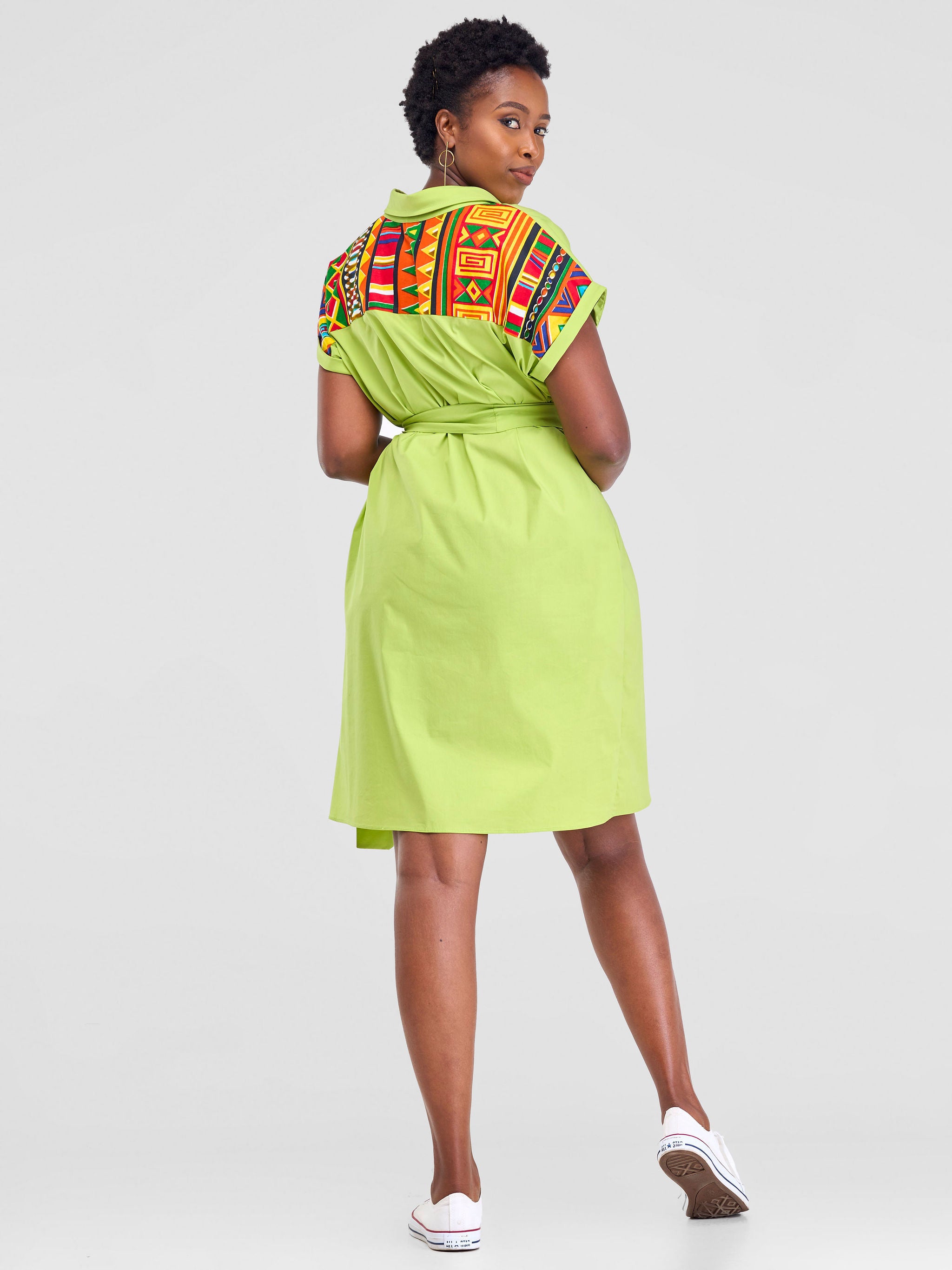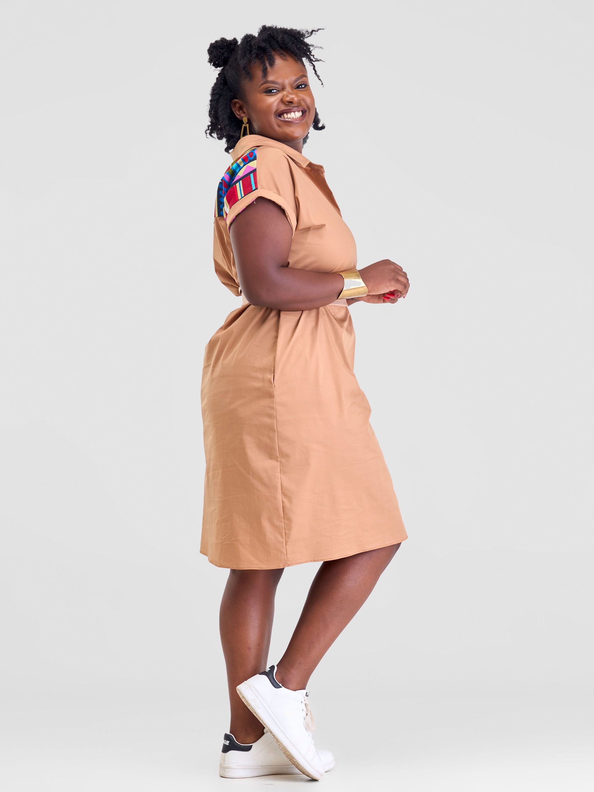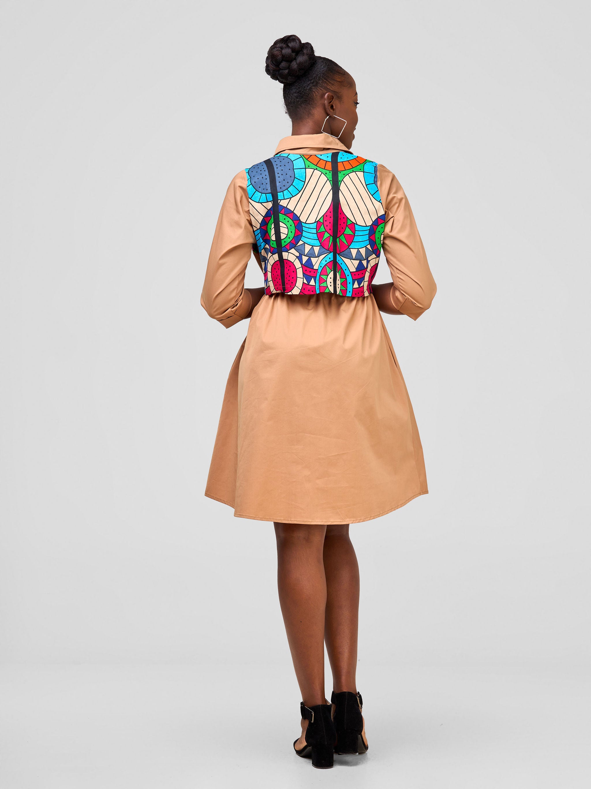 Safari Lira Drawstring Knee Length Dress MG - Hunters + Olive / Brown Khoi Print