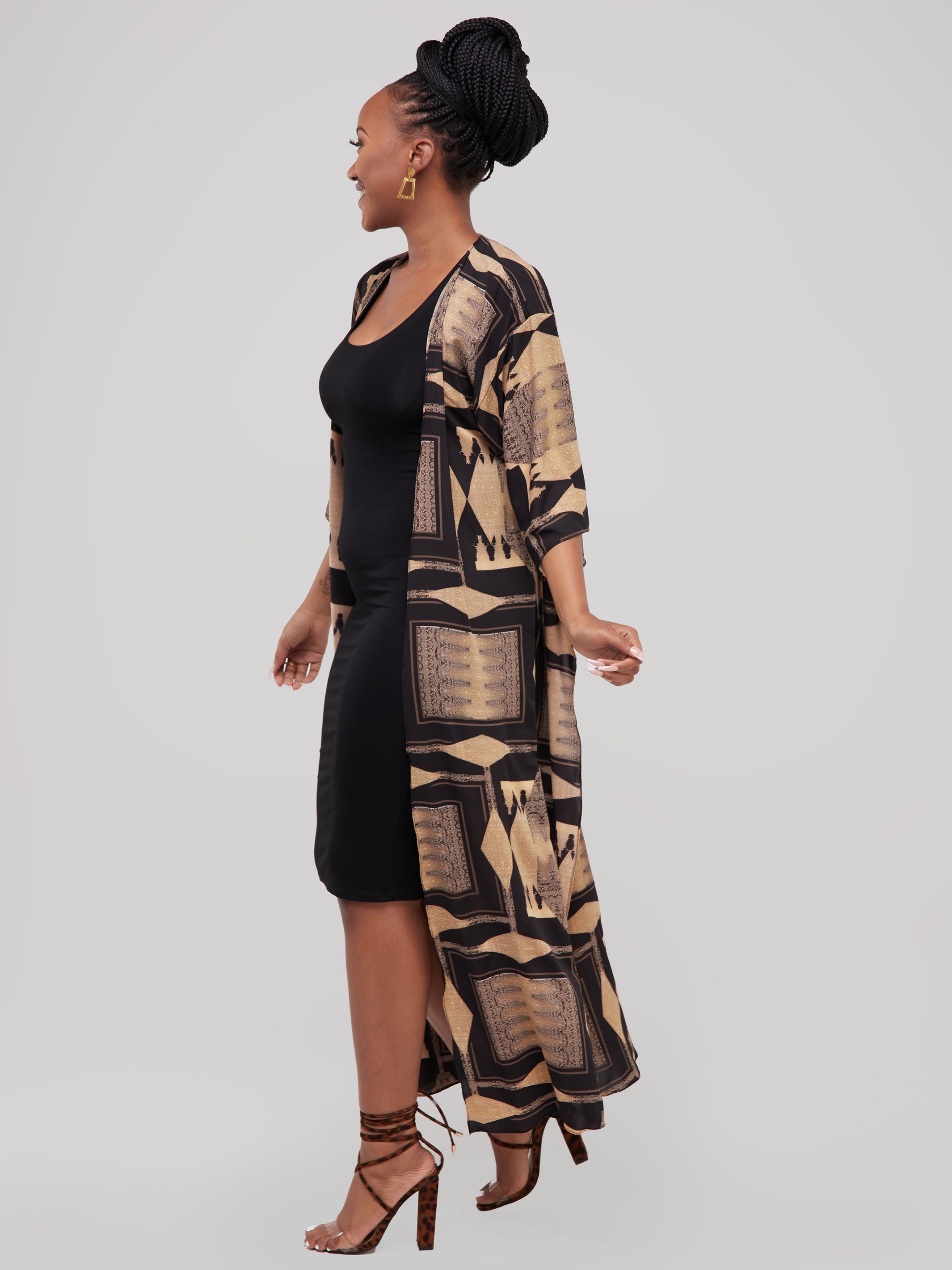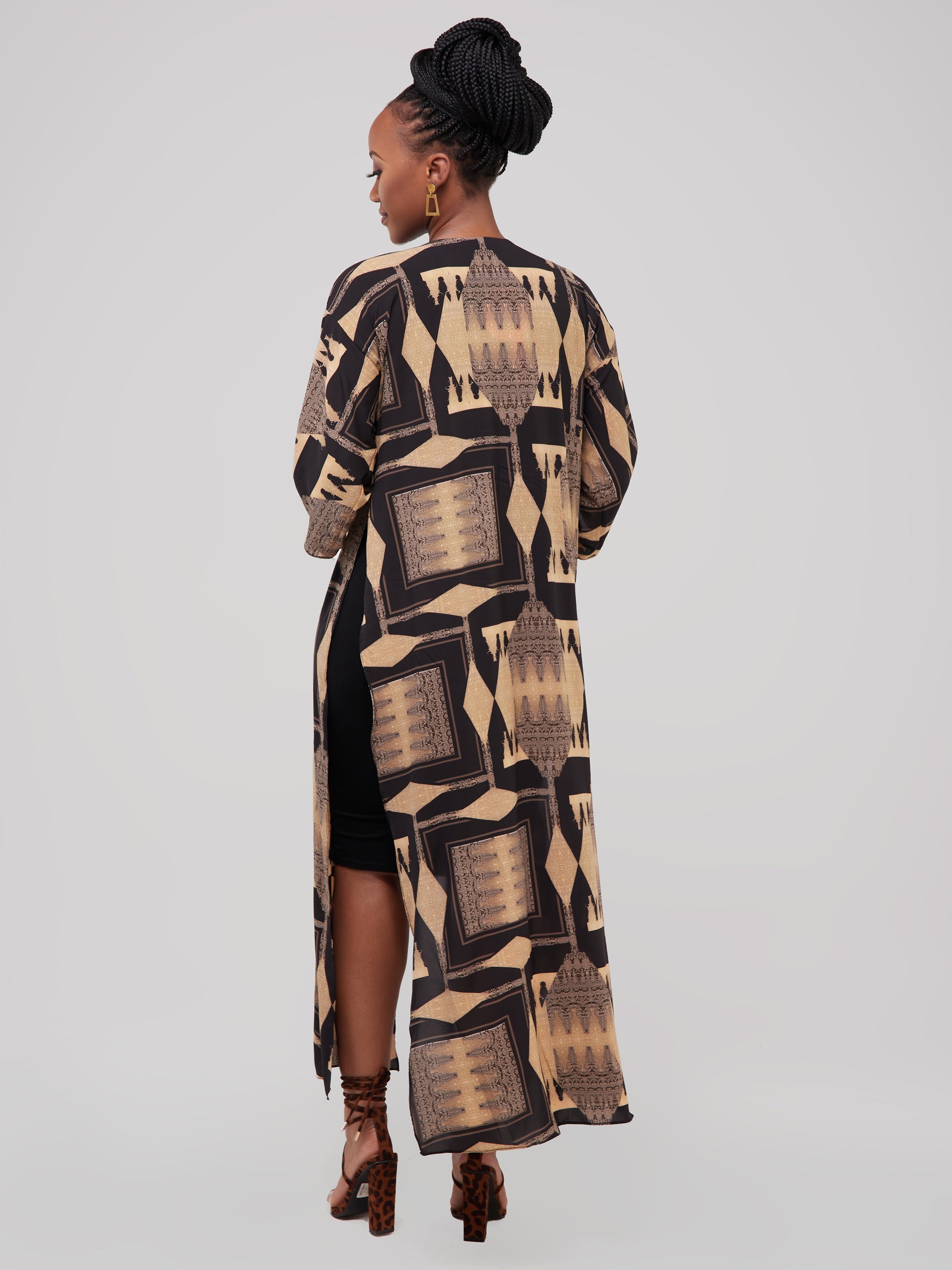 Safari Maisha High Slit Kimono - Black / Taupe Print