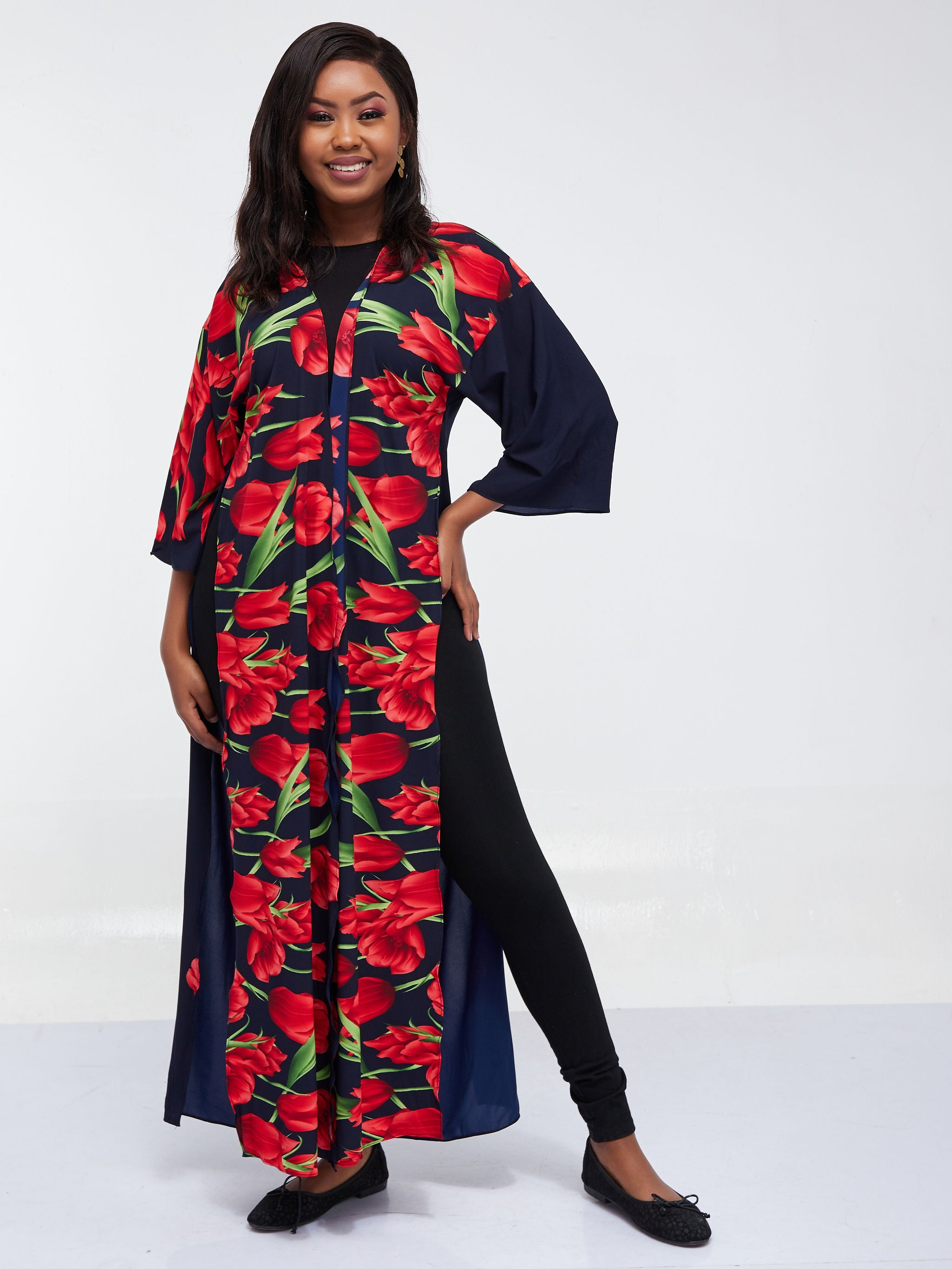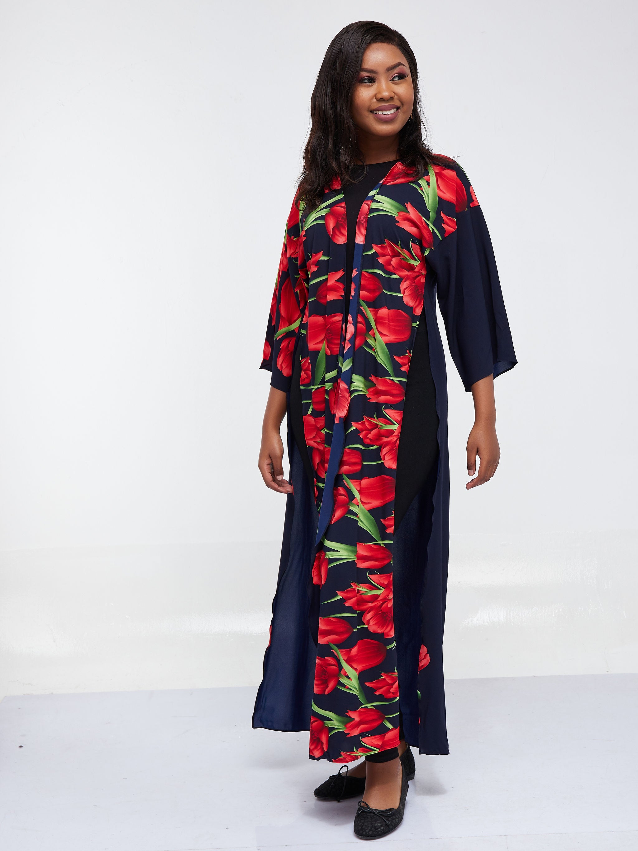 Safari Maisha High Slit Kimono - Navy Blue Floral Print
