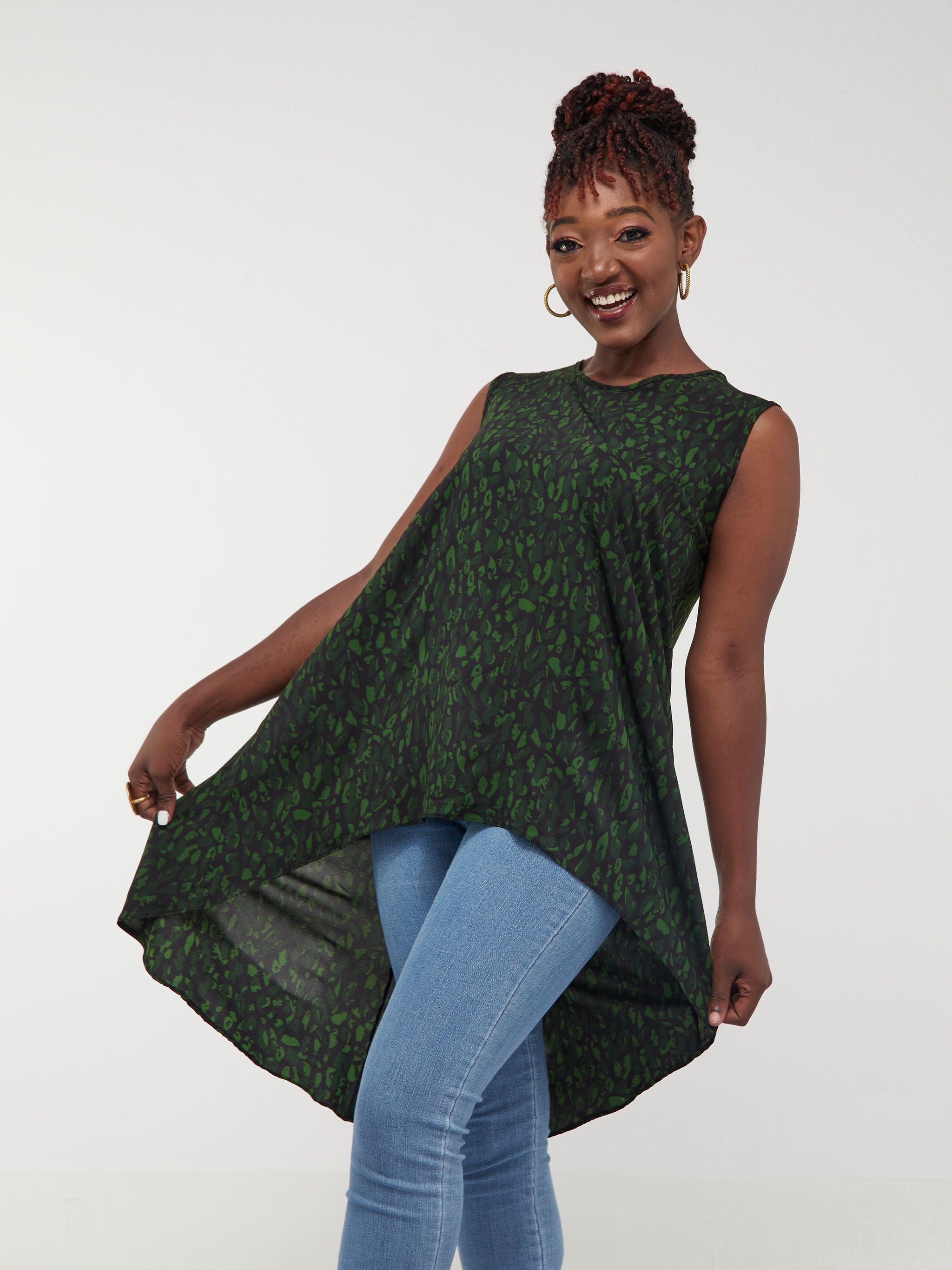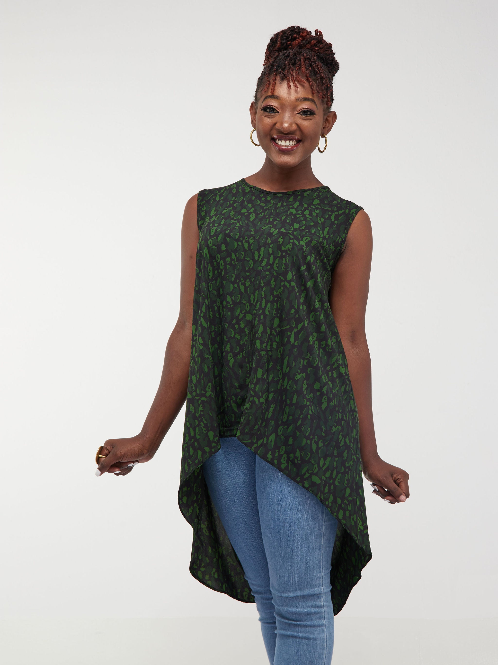 Safari Maisha Sleeveless Hi Low Top - Black / Green Print