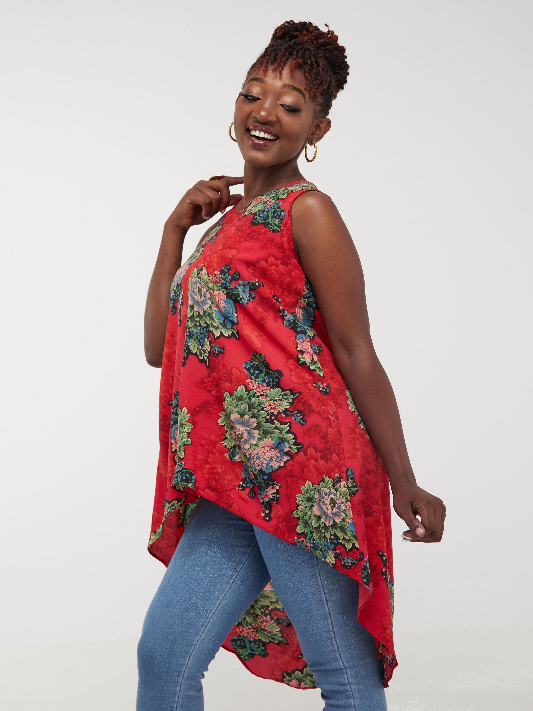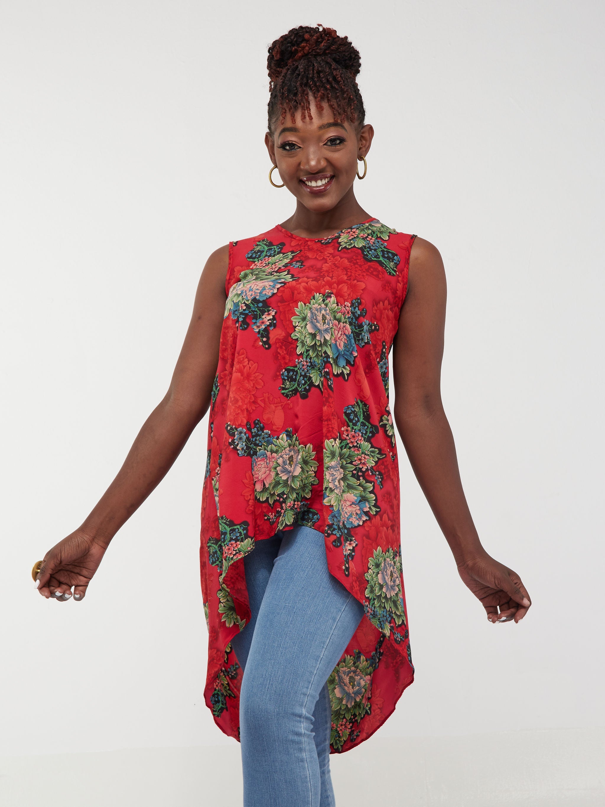 Safari Maisha Sleeveless Hi Low Top - Red / Green Floral Print