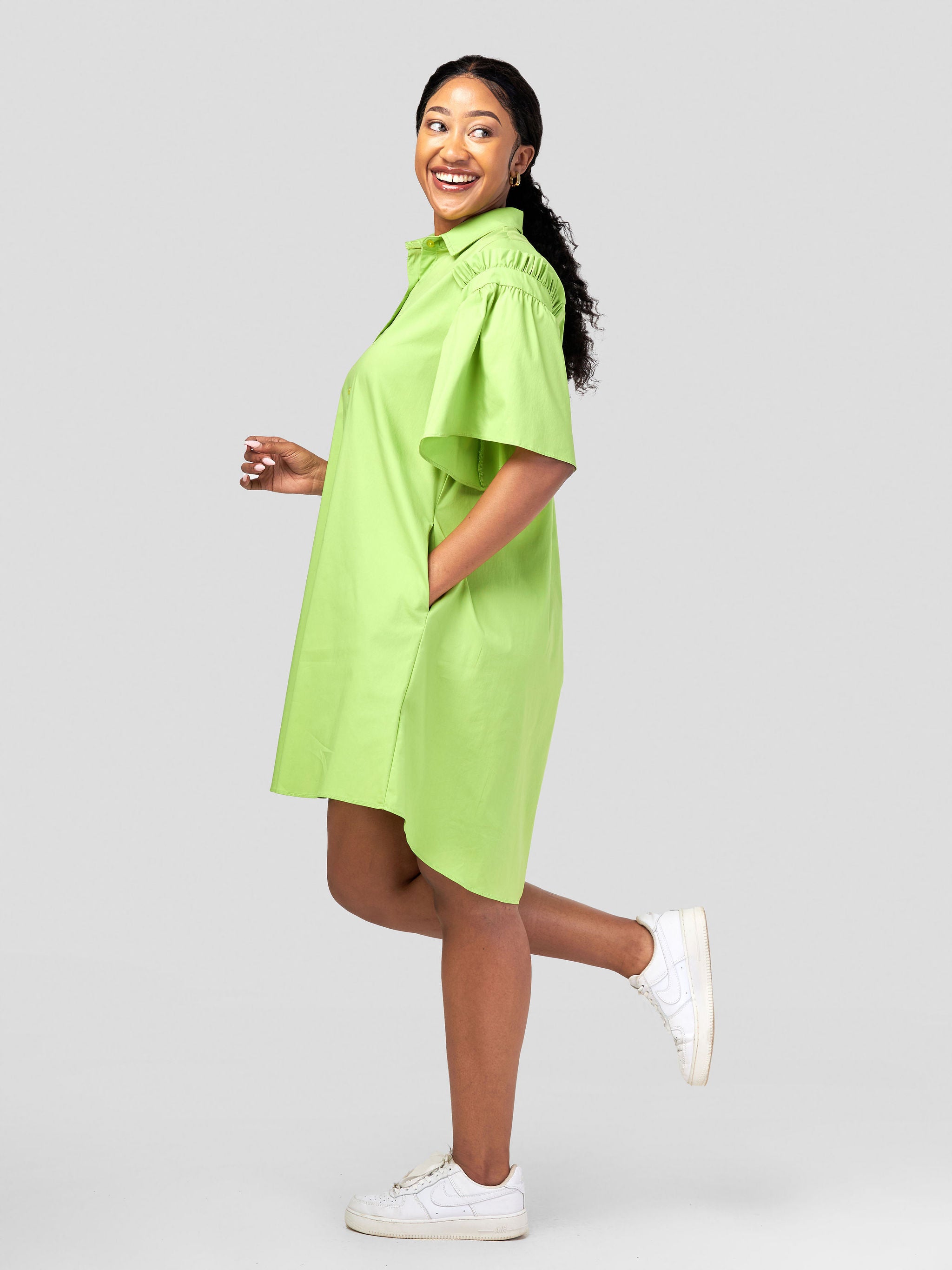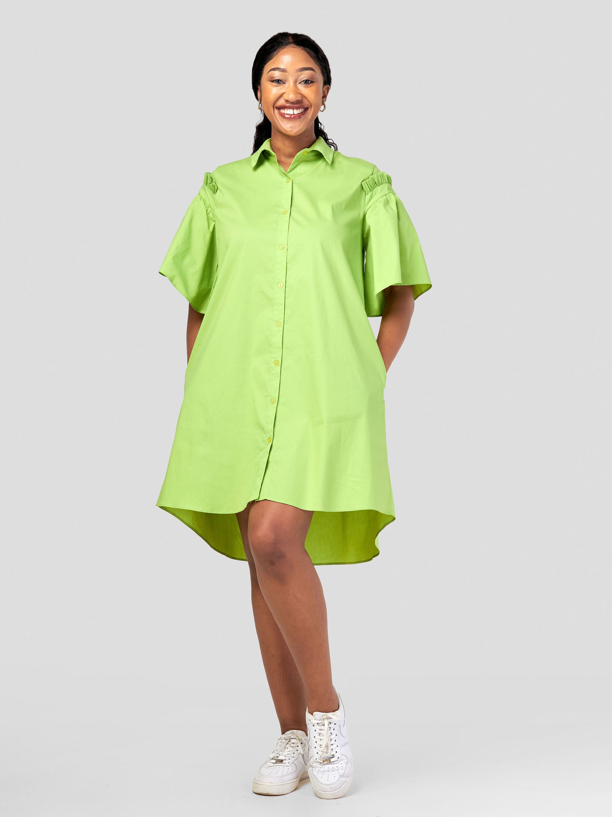 Safari Mali Gathered Flounce Sleeve Shirt Dress - Lime Green