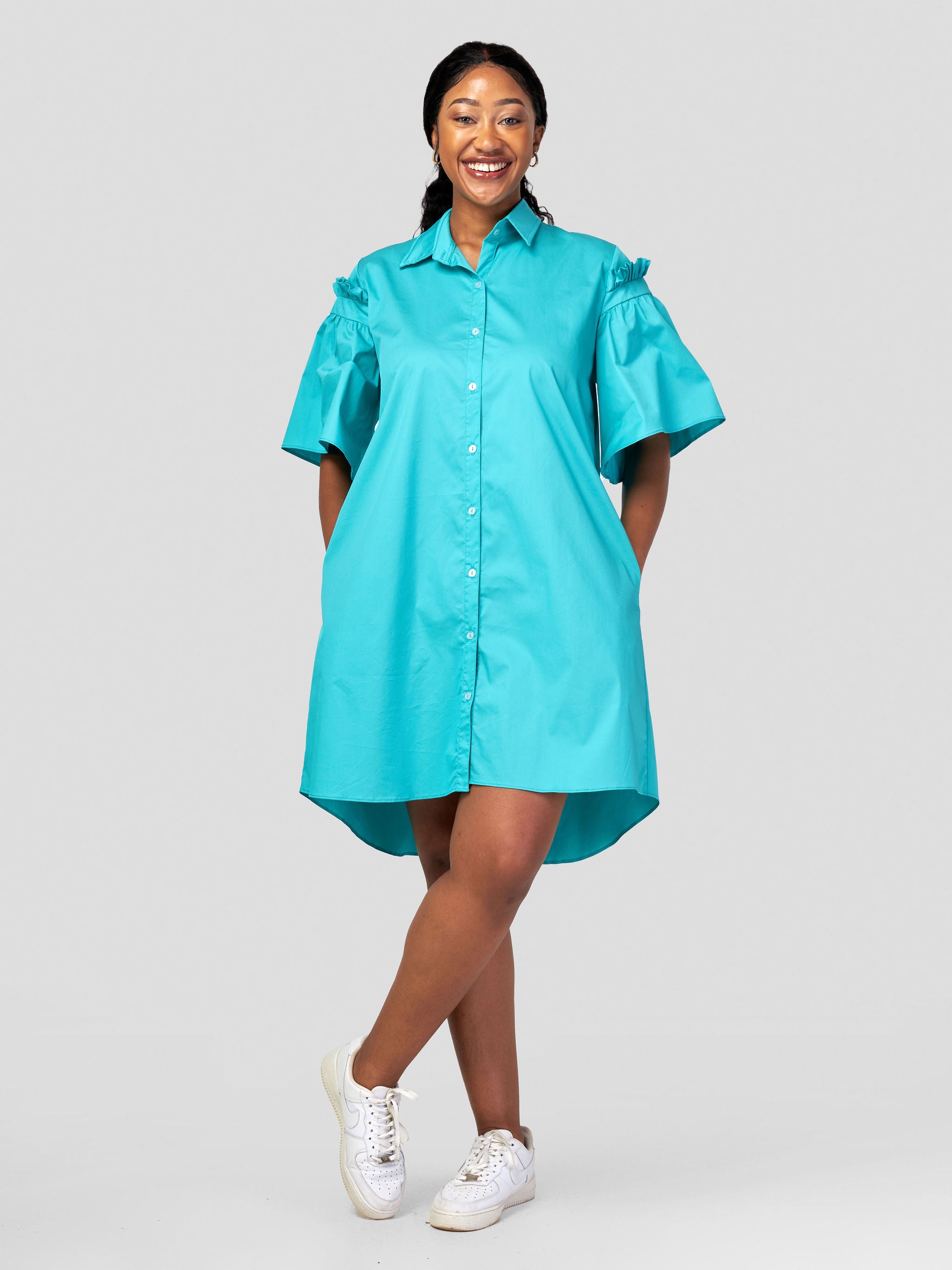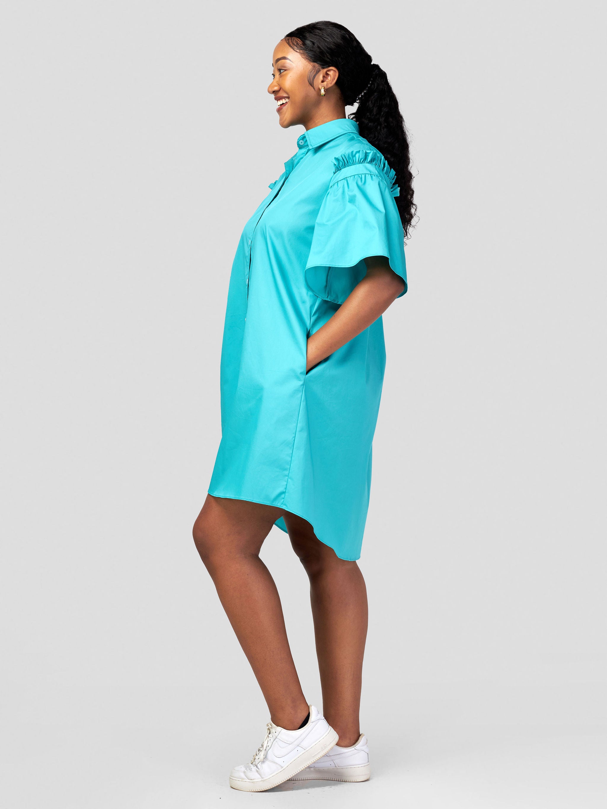 Safari Mali Gathered Flounce Sleeve Shirt Dress - Light Teal