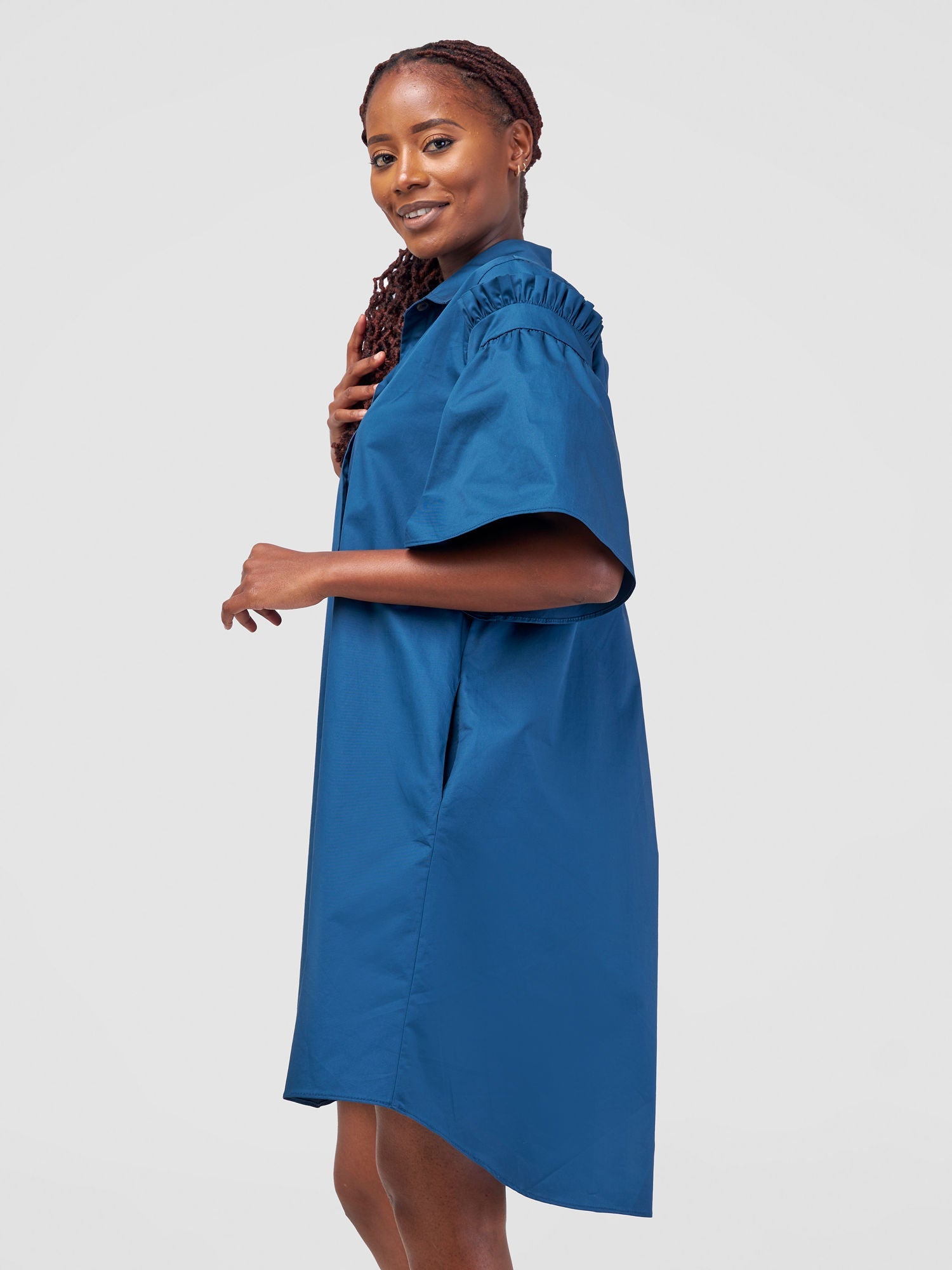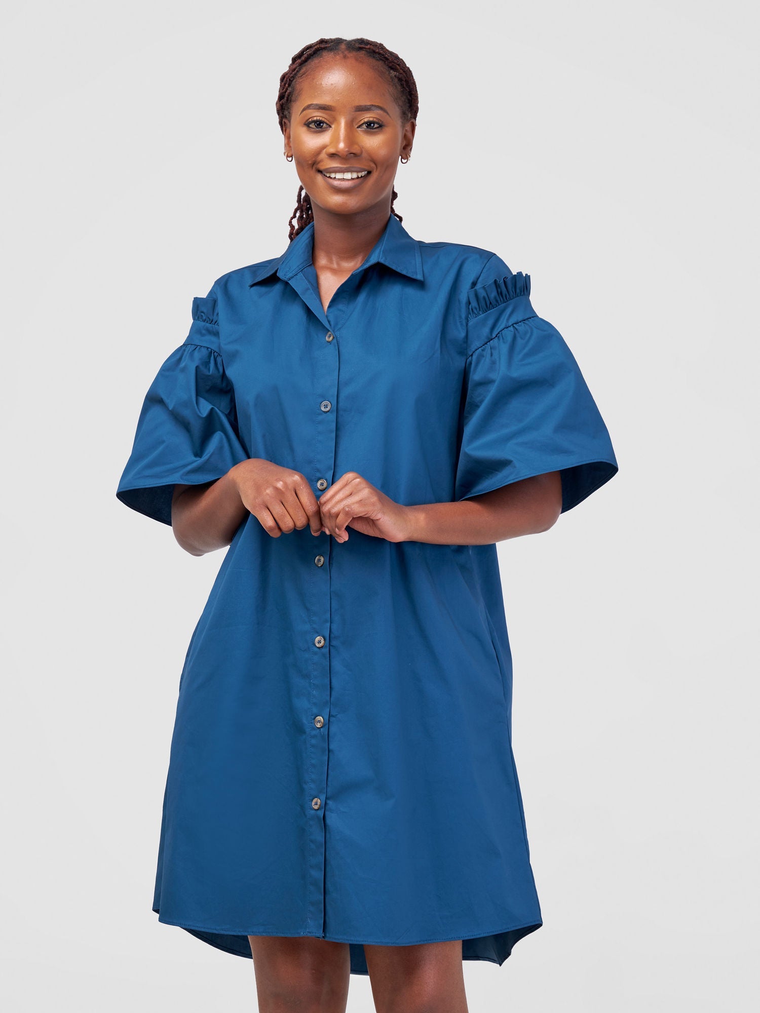 Safari Mali Gathered Flounce Sleeve Shirt Dress - Navy Blue