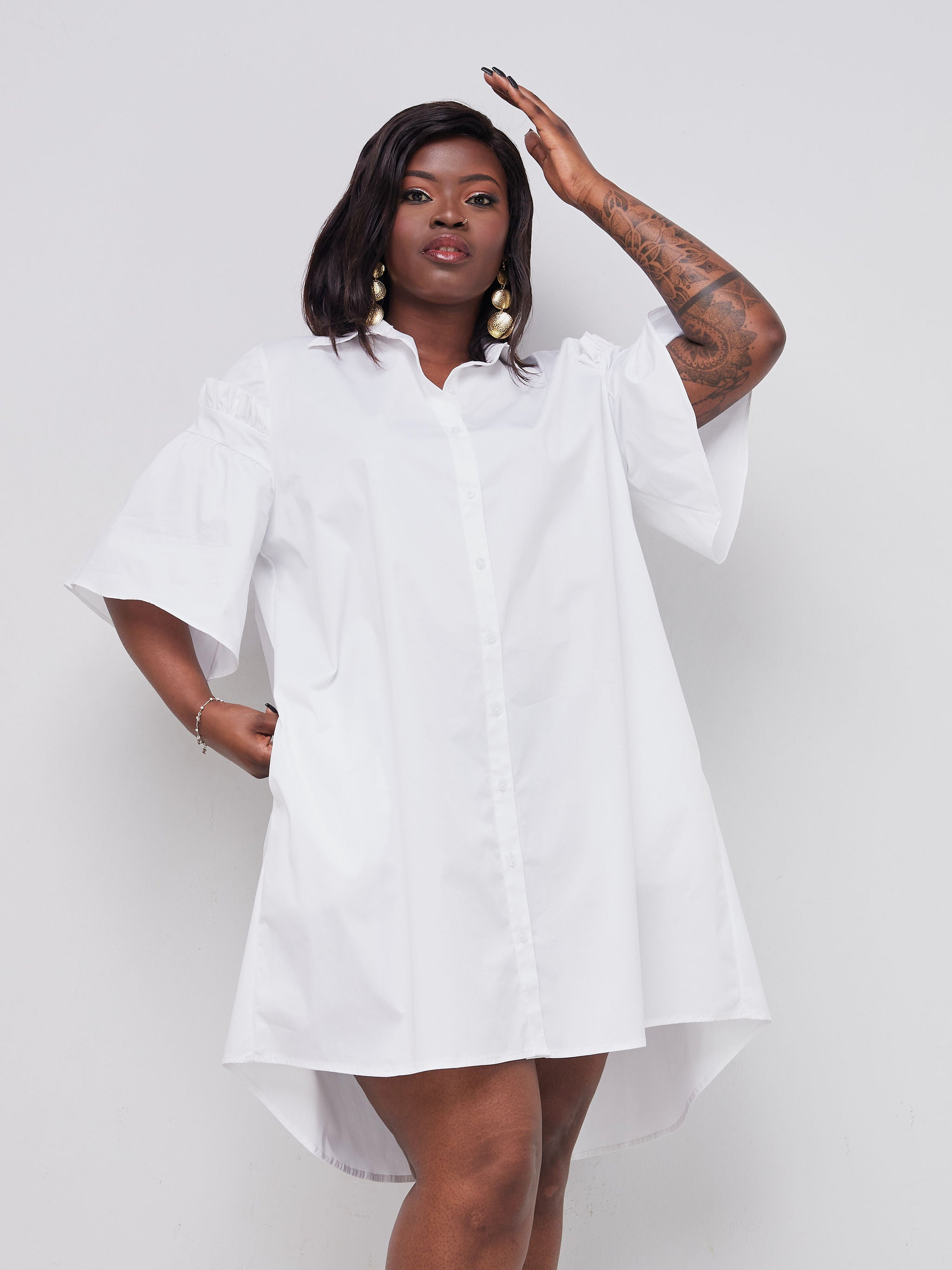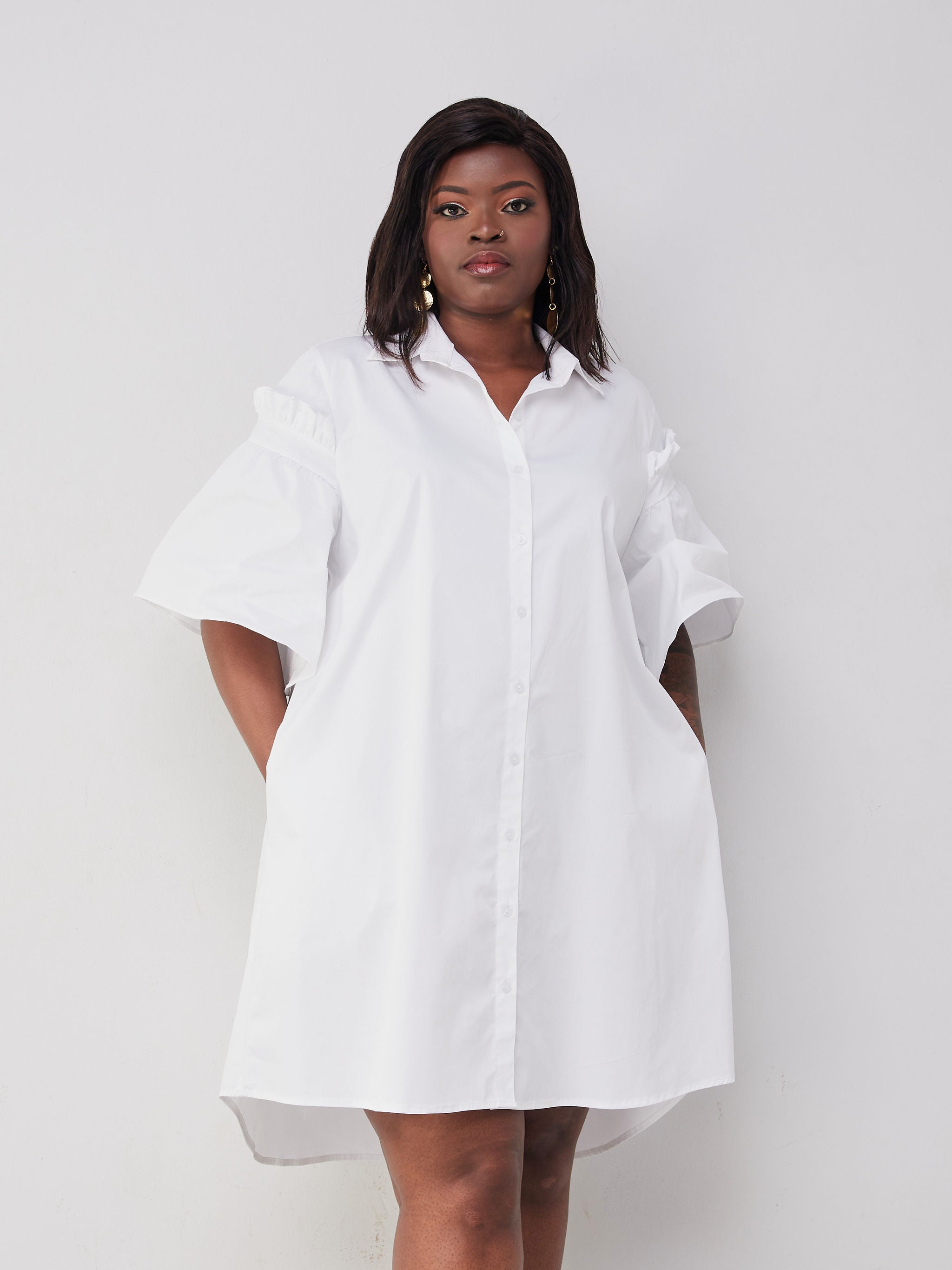 Safari Mali Gathered Flounce Sleeve Shirt Dress - White