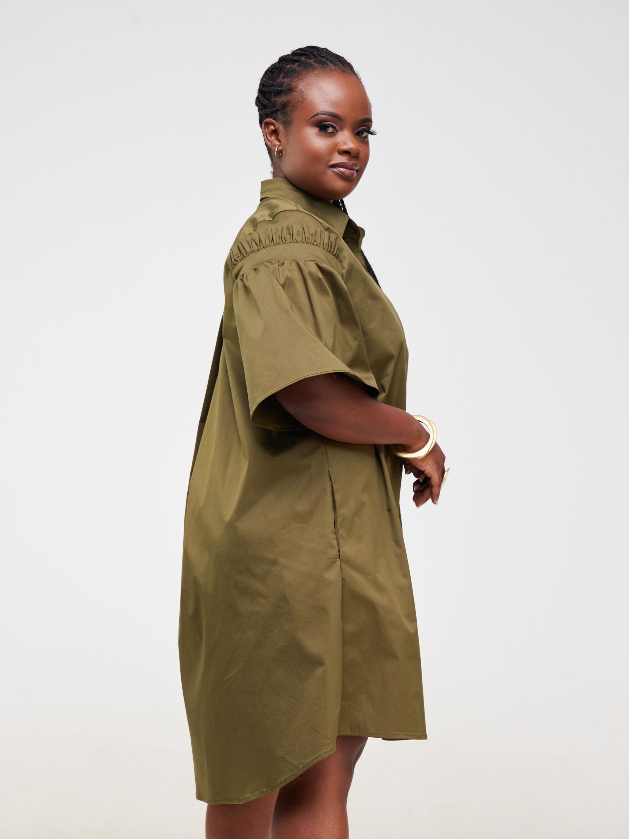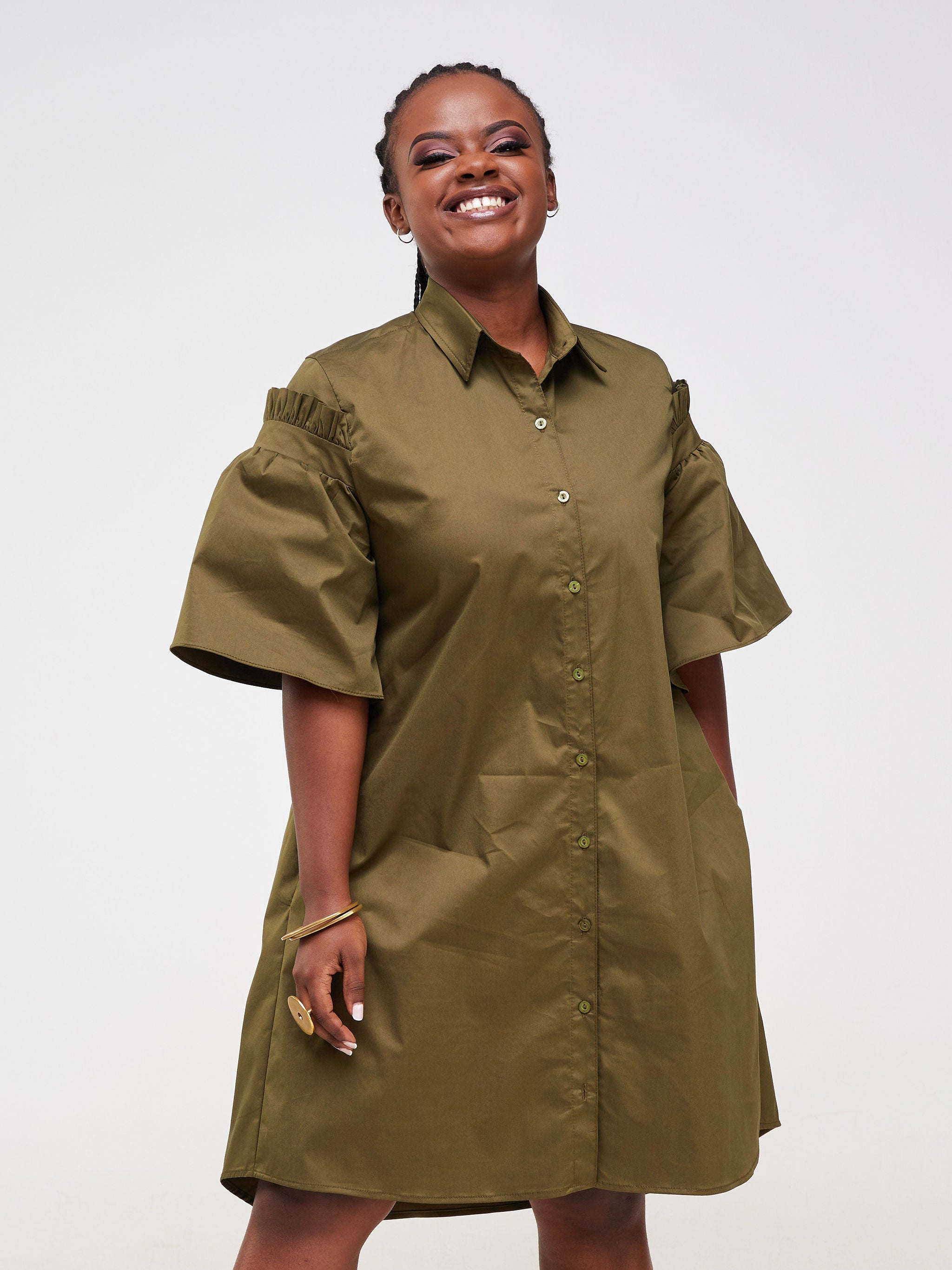 Safari Mali Gathered Flounce Sleeve Shirt Dress - Hunters Green