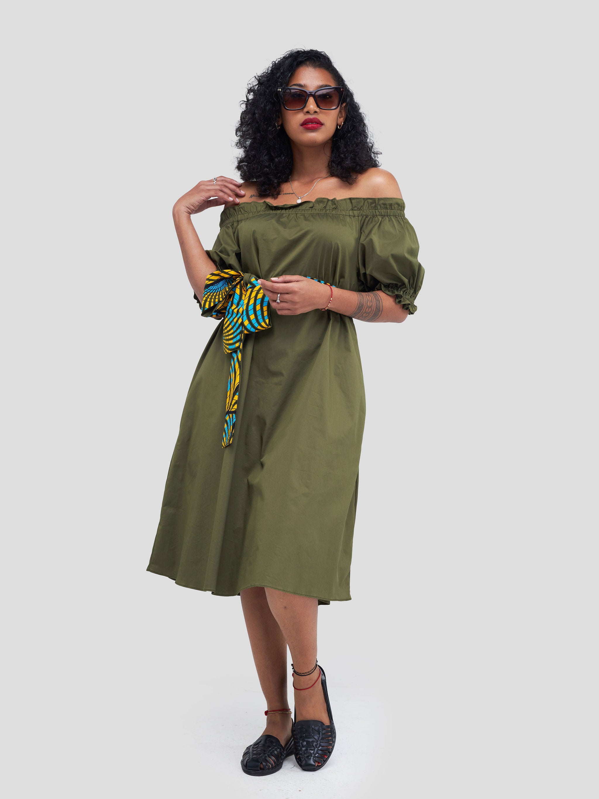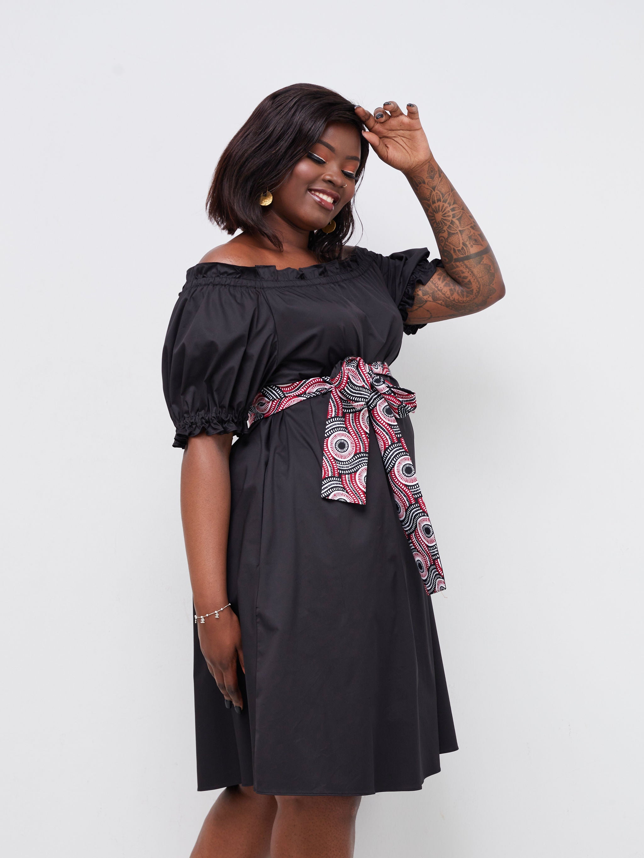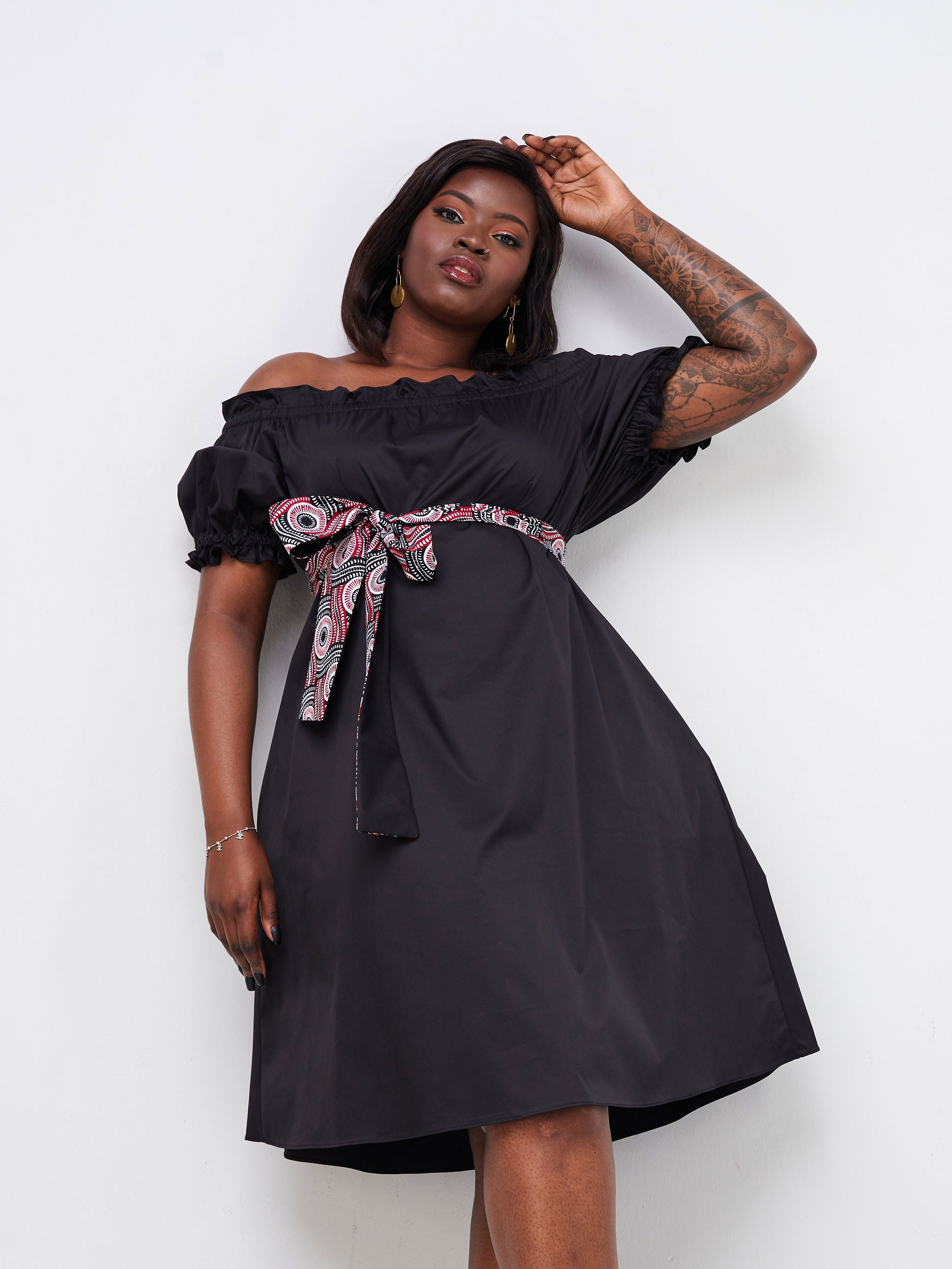 Safari Mali Off - Shoulder Ruffle Knee Length Dress - Coral (Navy / Yellow Print Belt)