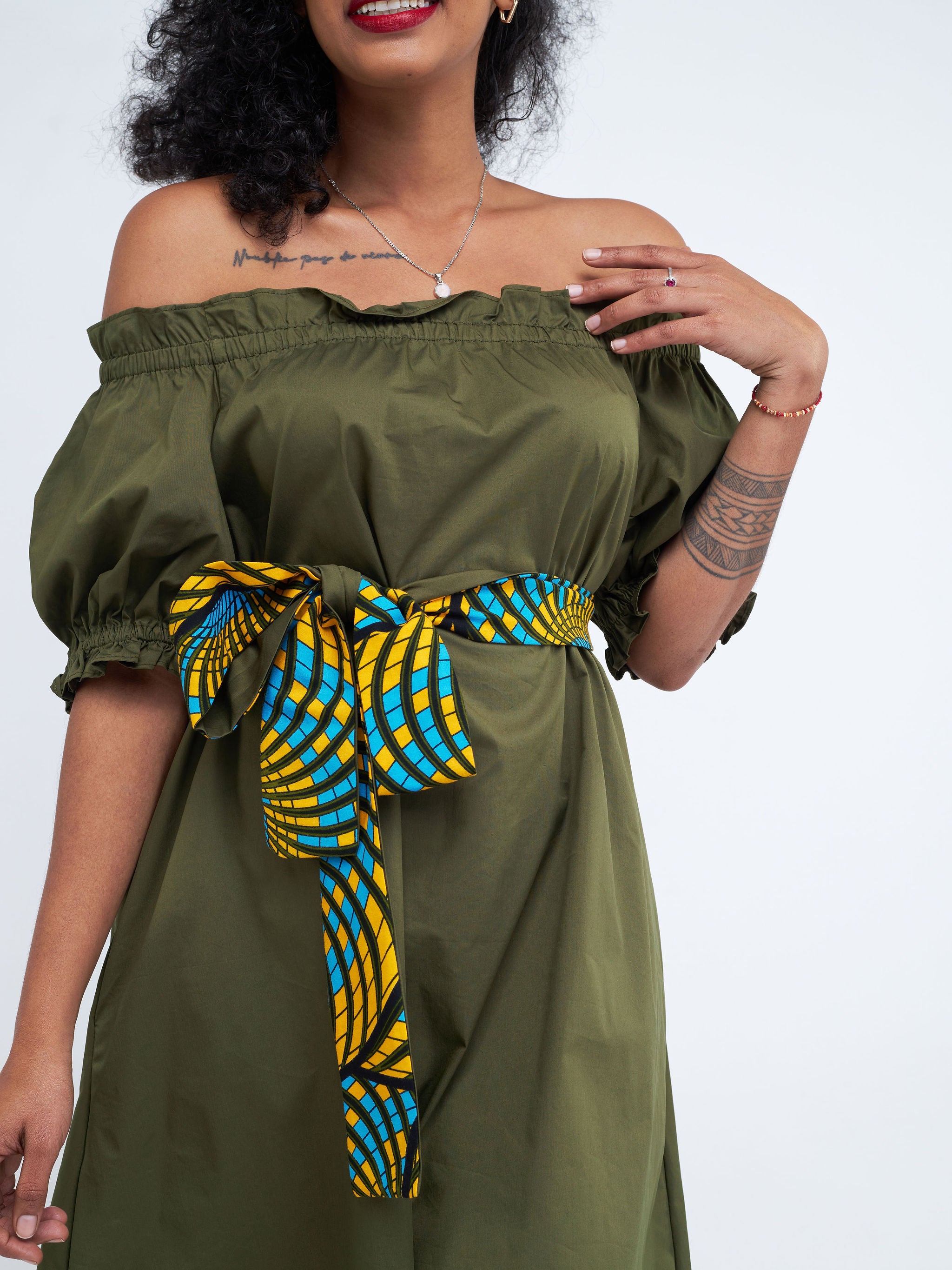 Safari Mali Off - Shoulder Ruffle Knee Length Dress - Baby Blue (Navy / Yellow Print Belt)