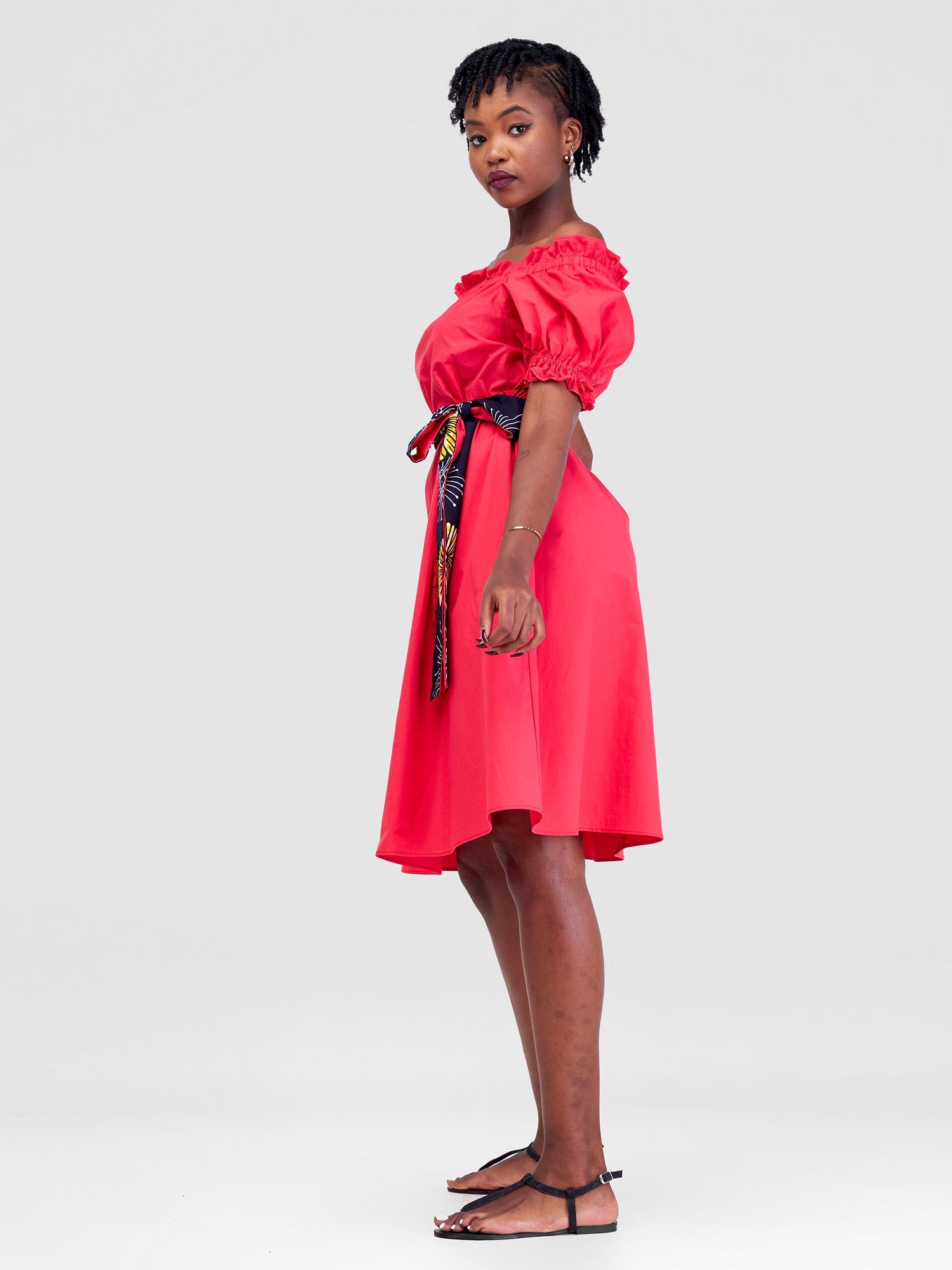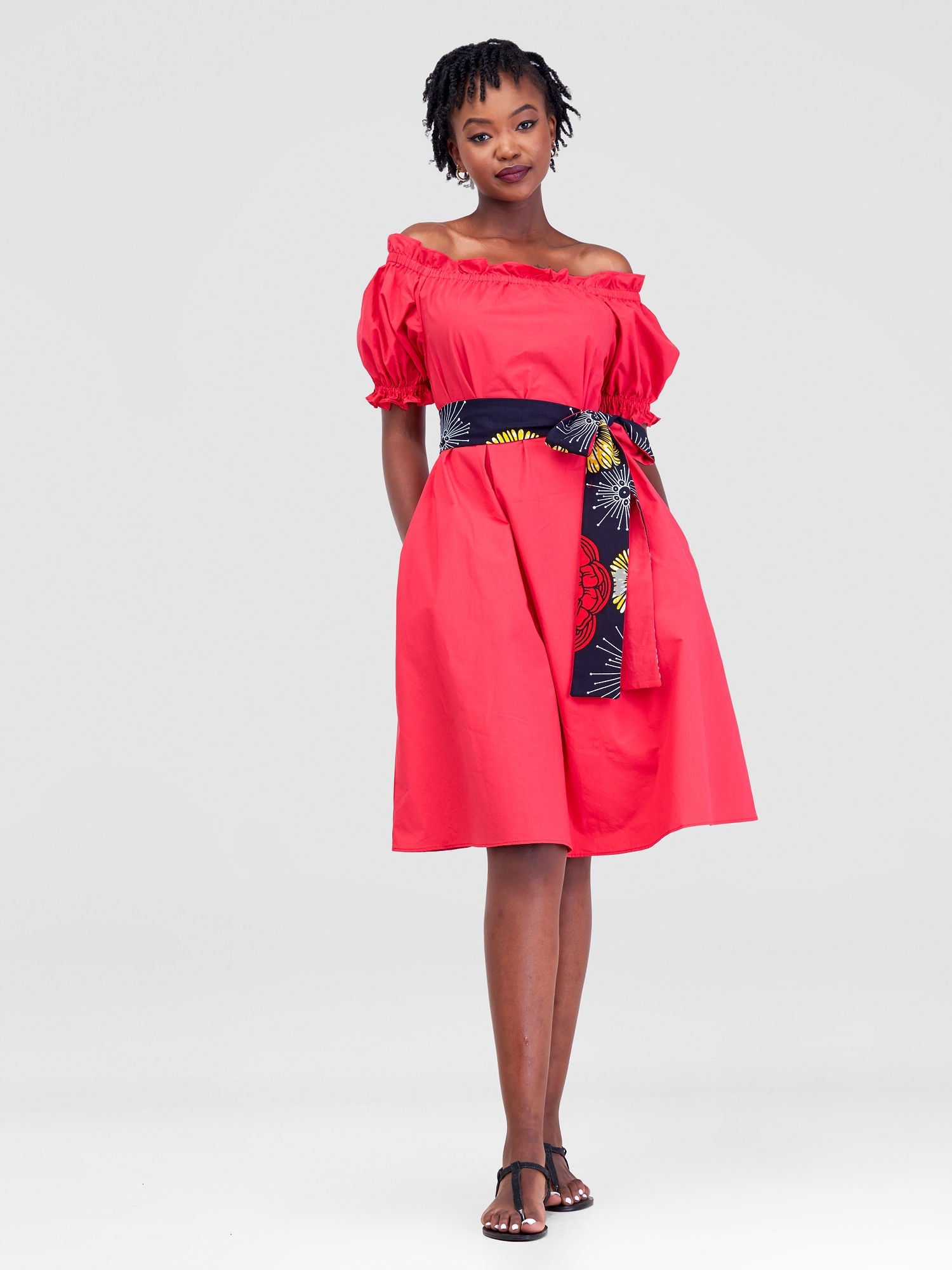 Safari Mali Off - Shoulder Ruffle Knee Length Dress - Coral (Blue / Maroon Print Belt)
