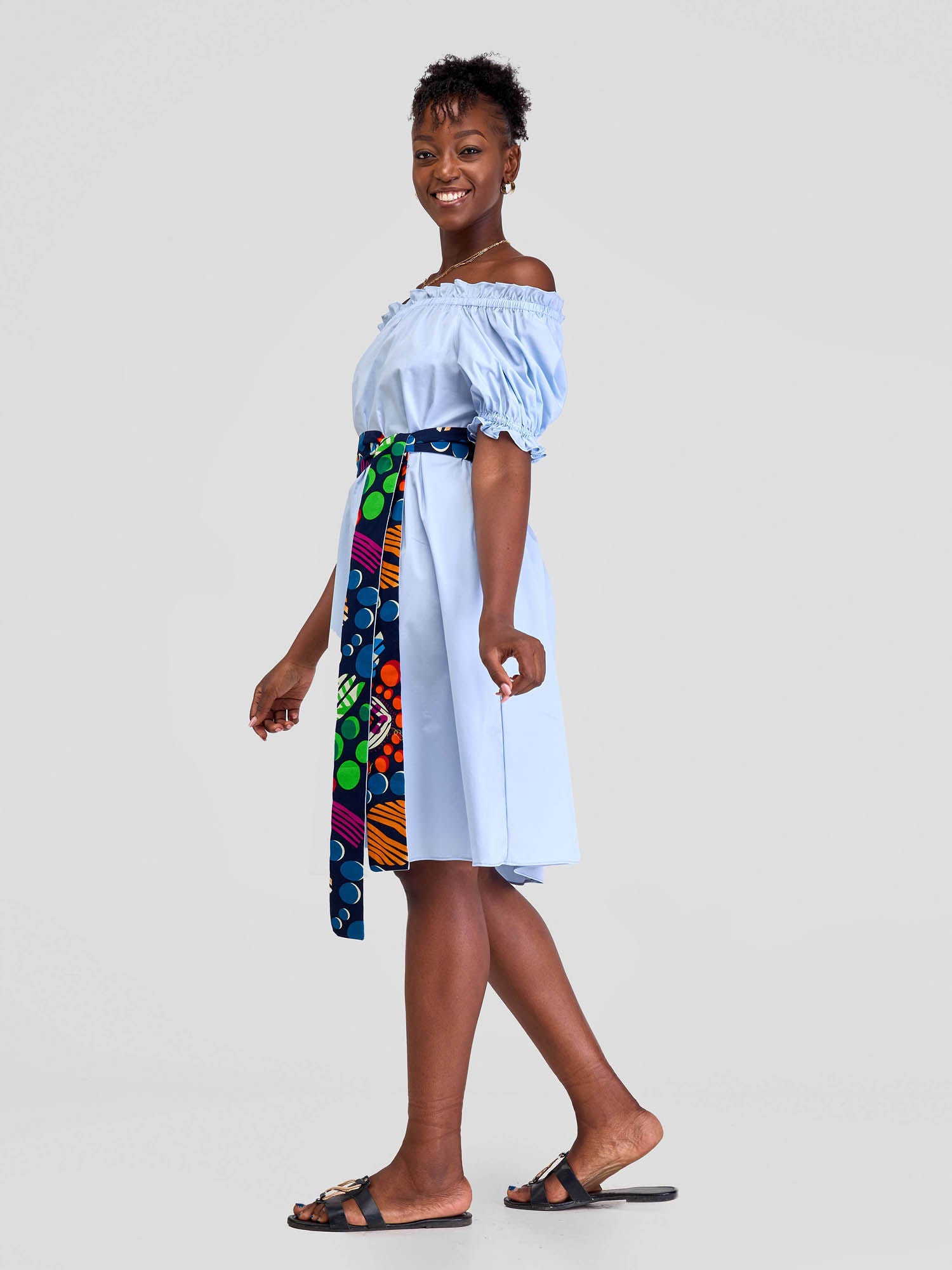 Safari Mali Off - Shoulder Ruffle Knee Length Dress - Baby Blue (Blue Print Belt)