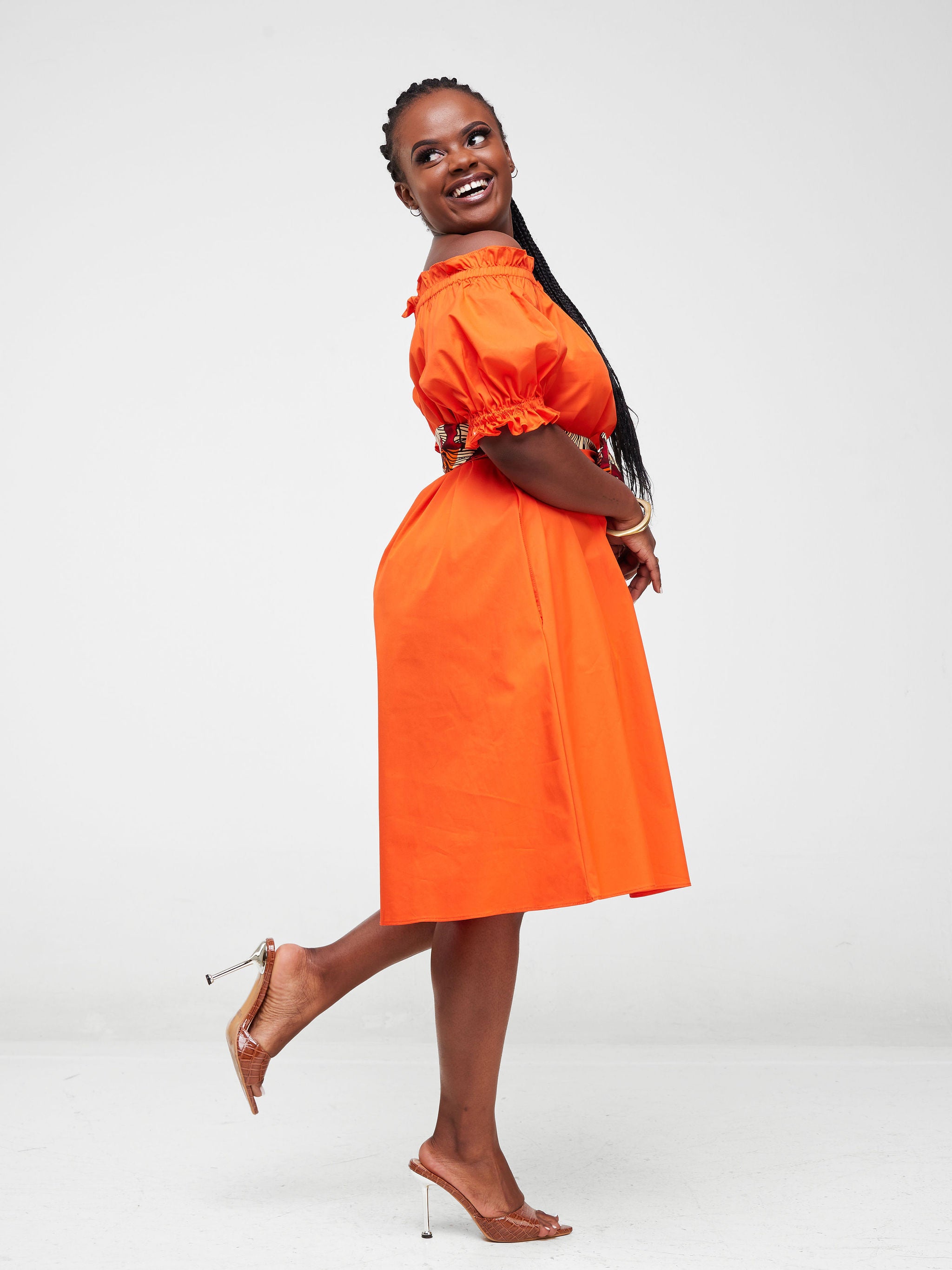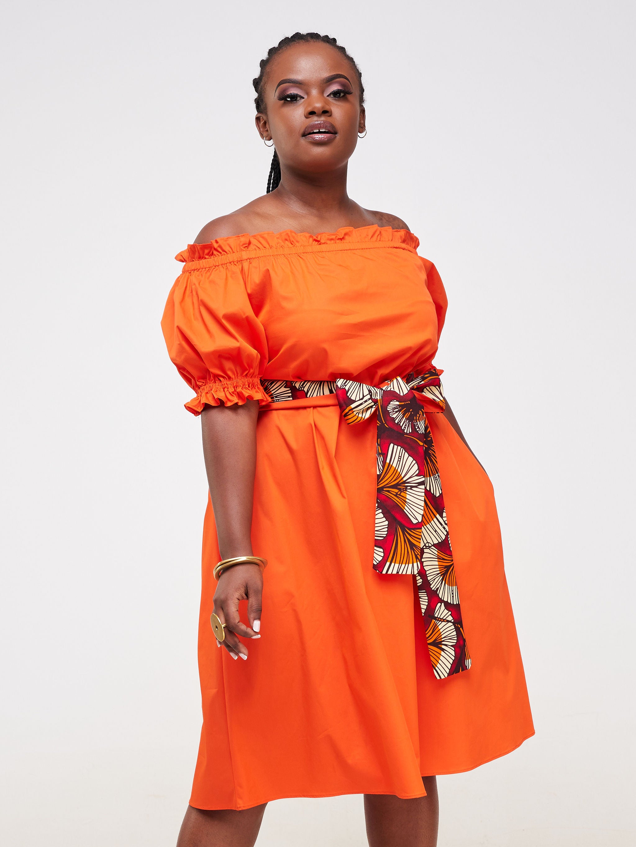 Safari Mali Off - Shoulder Ruffle Knee Length Dress - Orange
