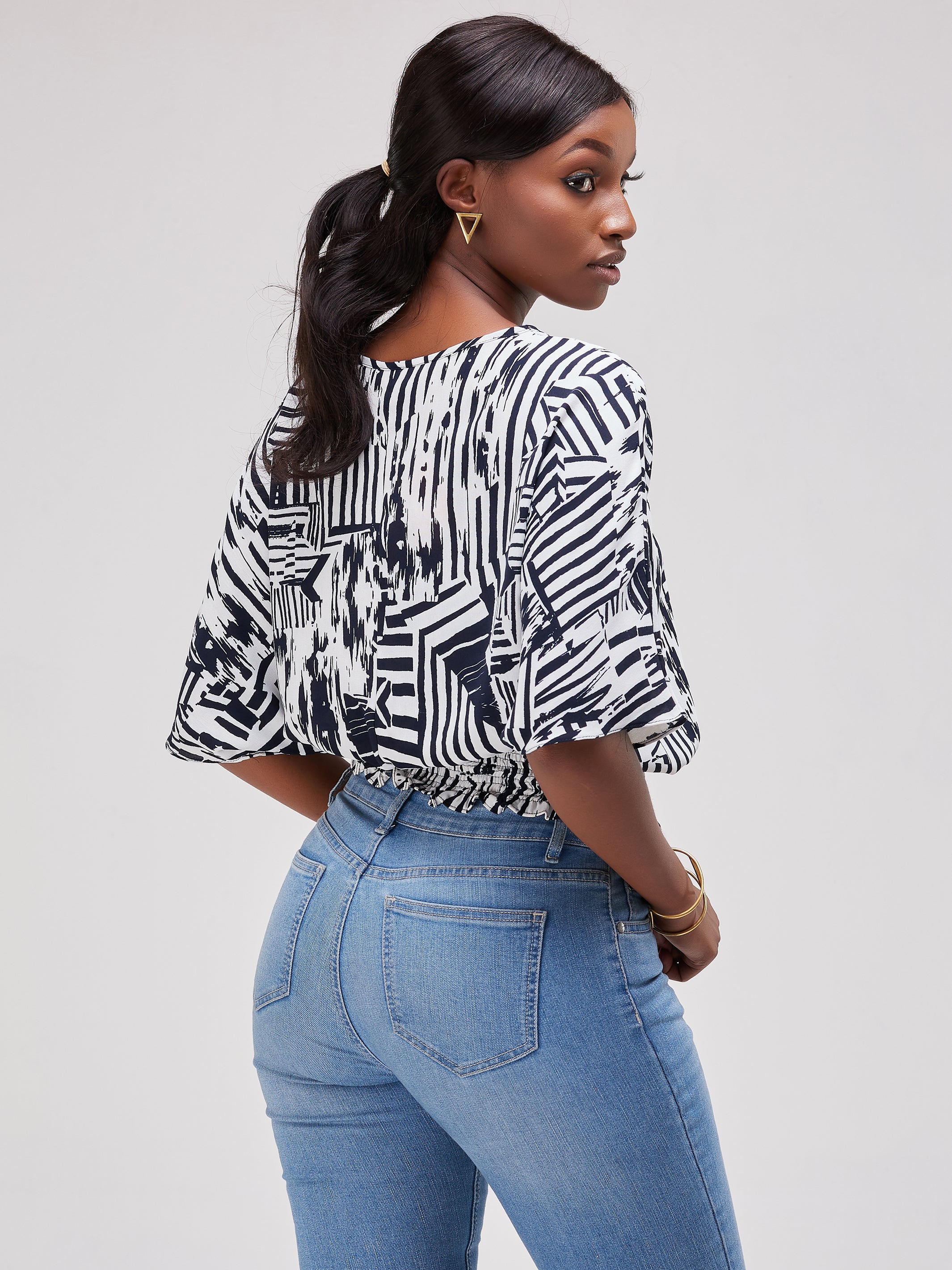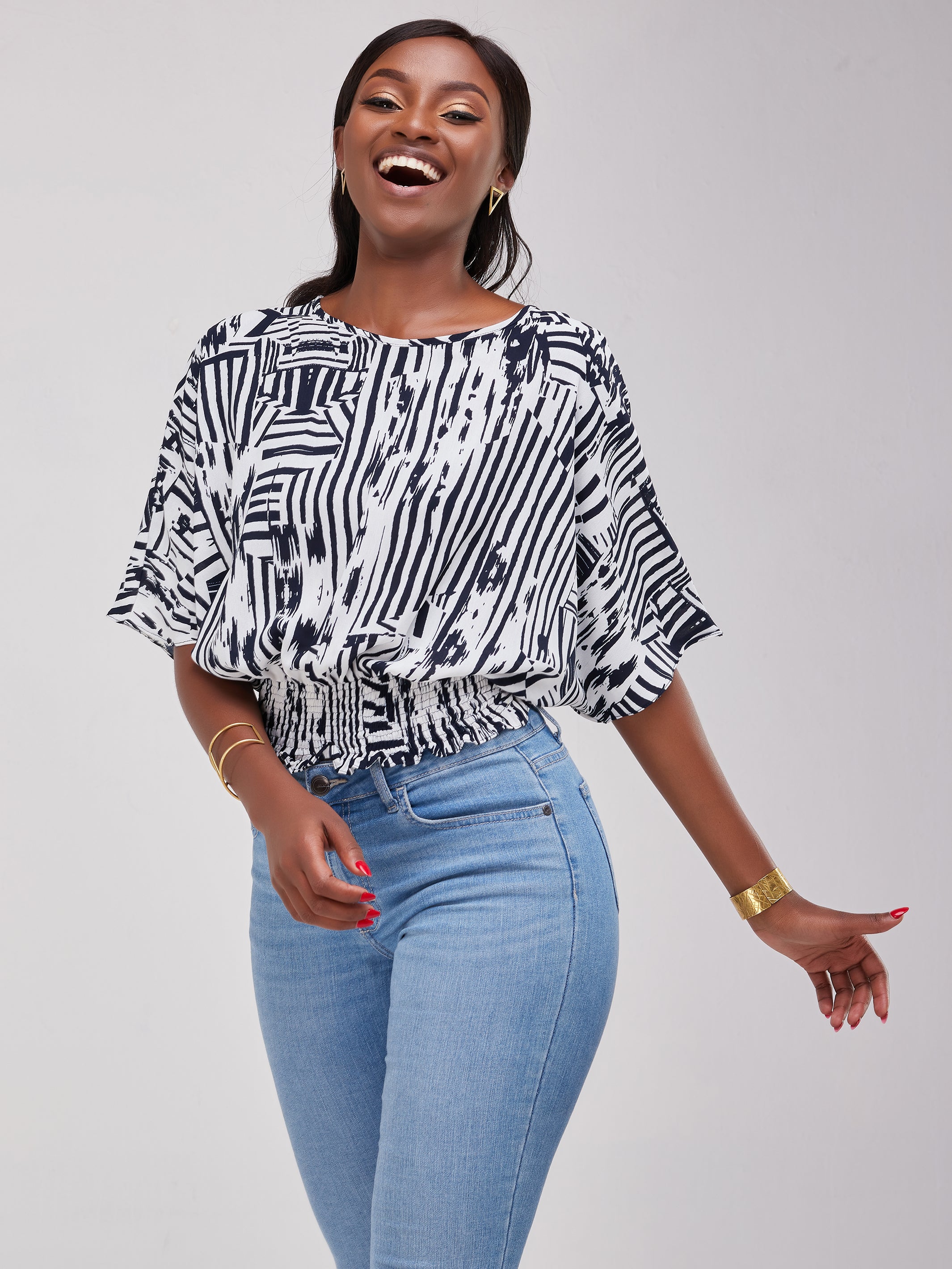 Safari Naima Shirred Waist Chiffon Top - Navy / White Print