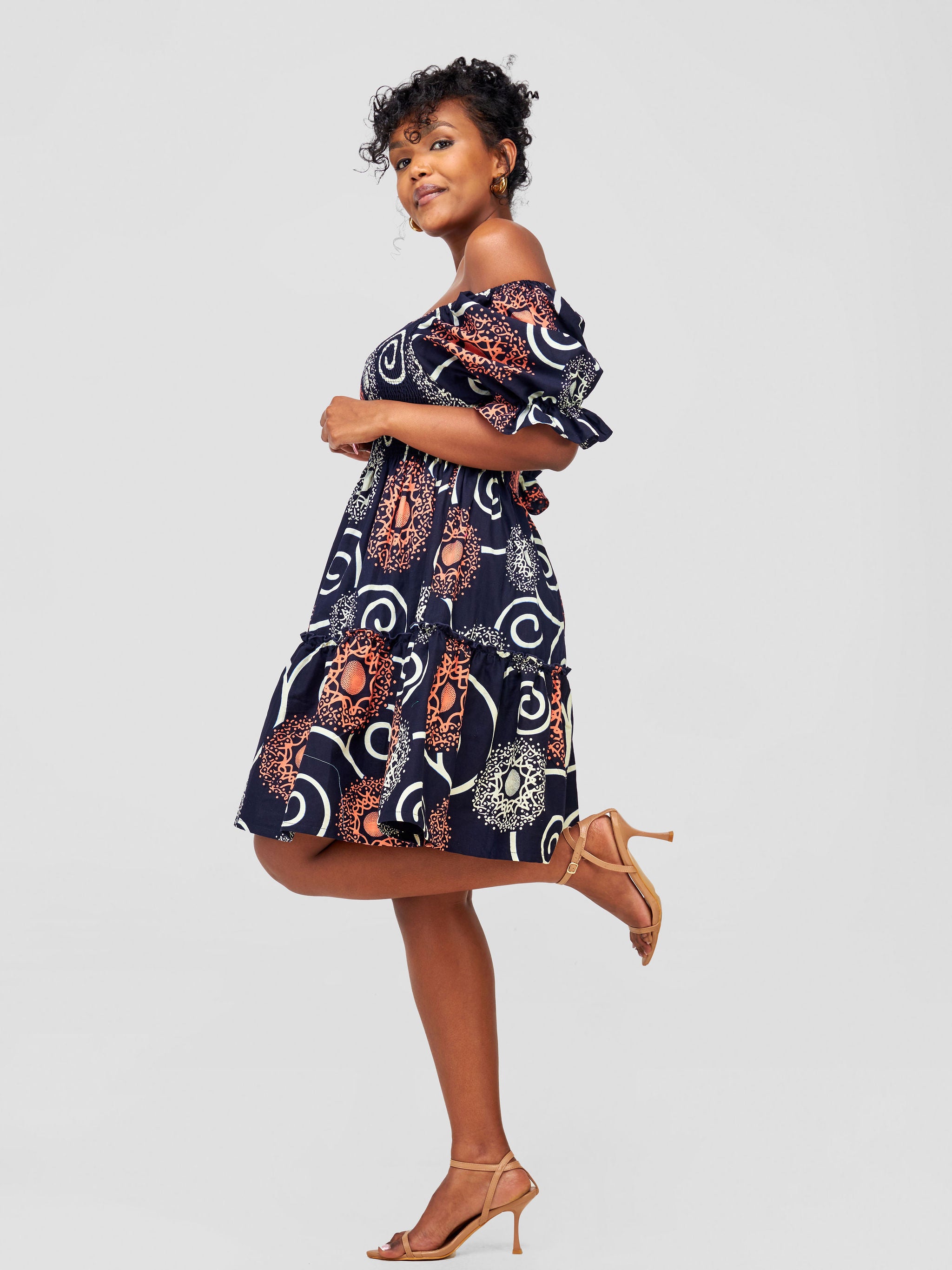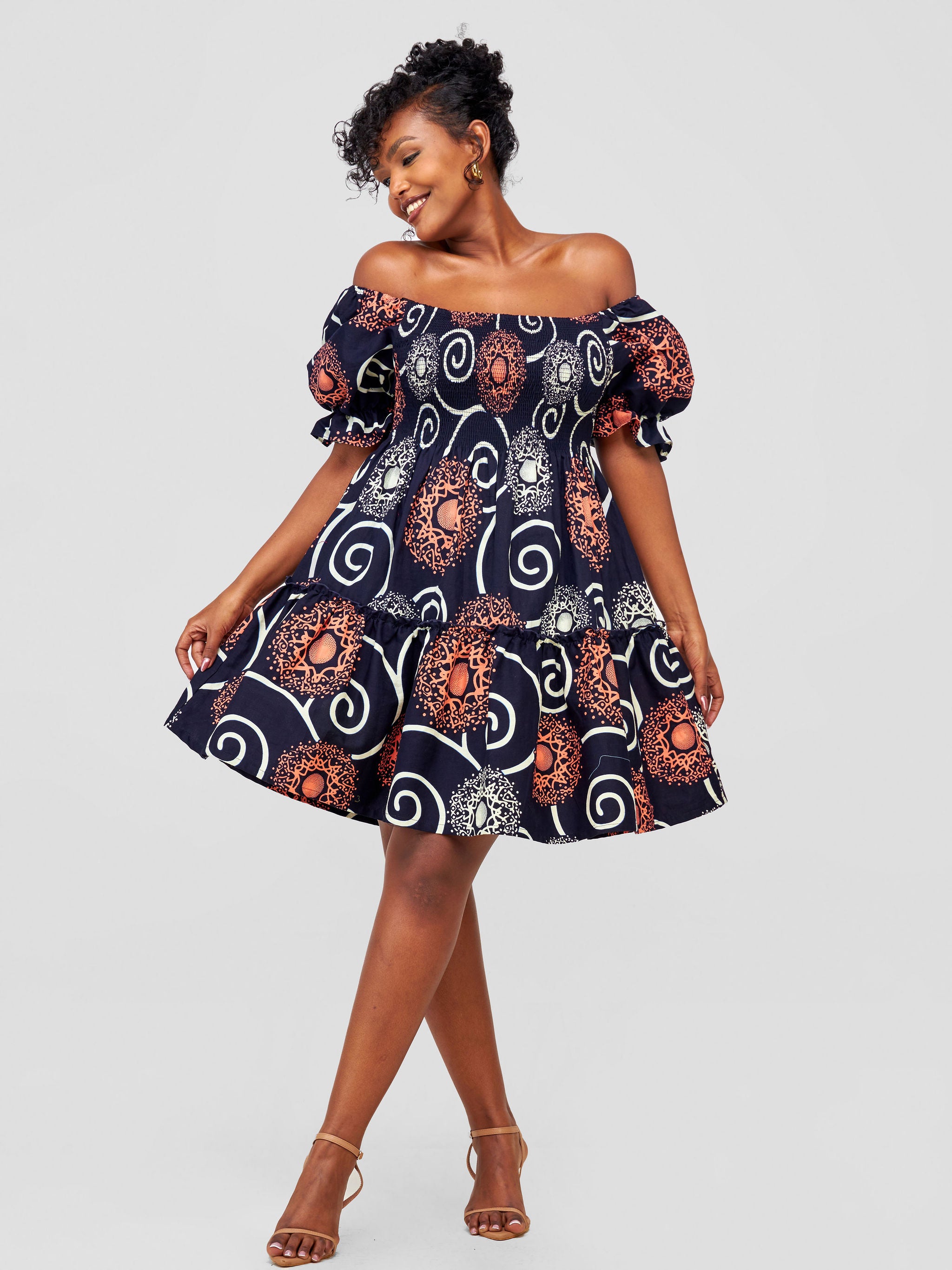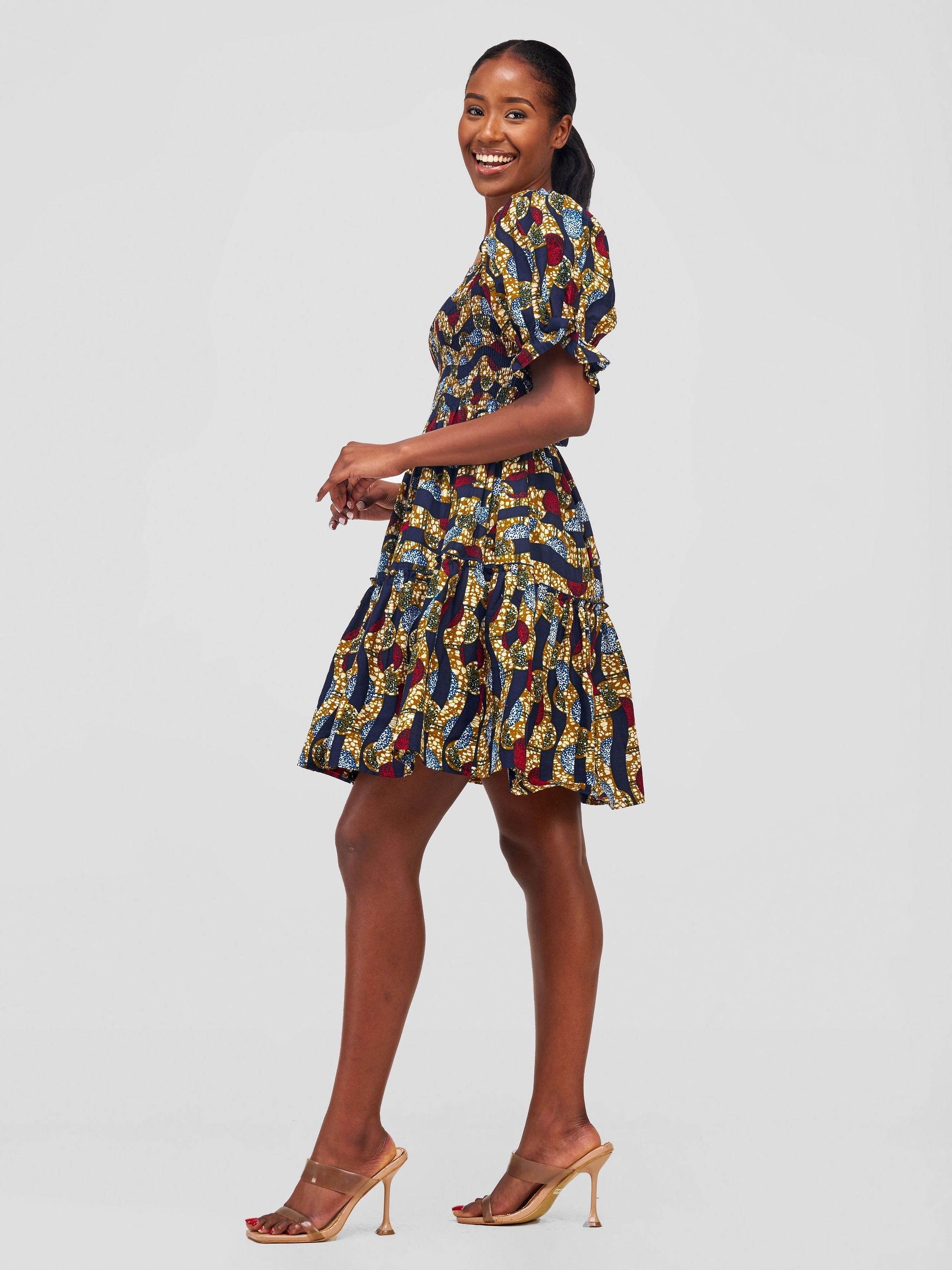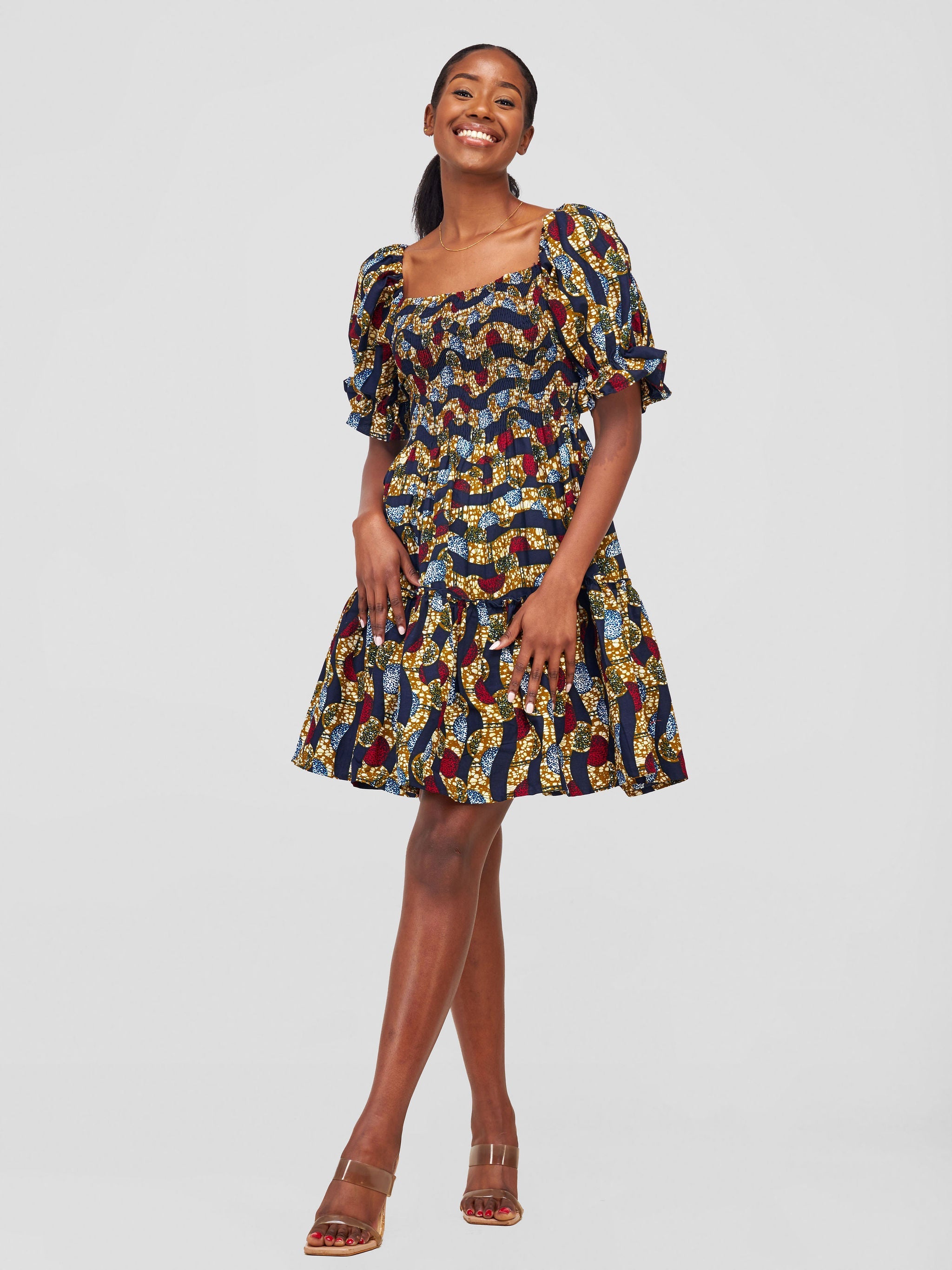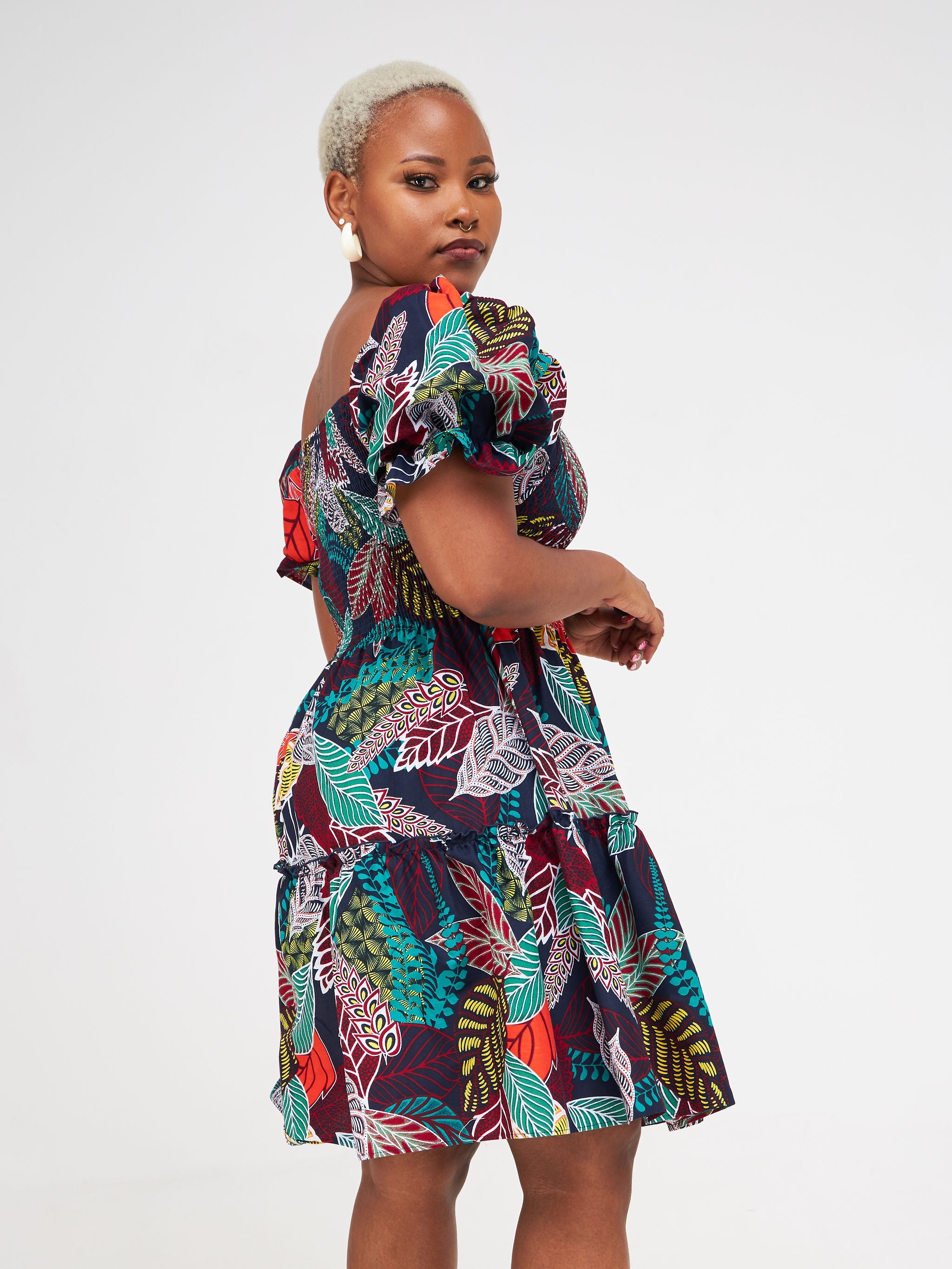 Safari Nimali Bustier Knee Length Dress - Navy Blue / Green Ankara Print