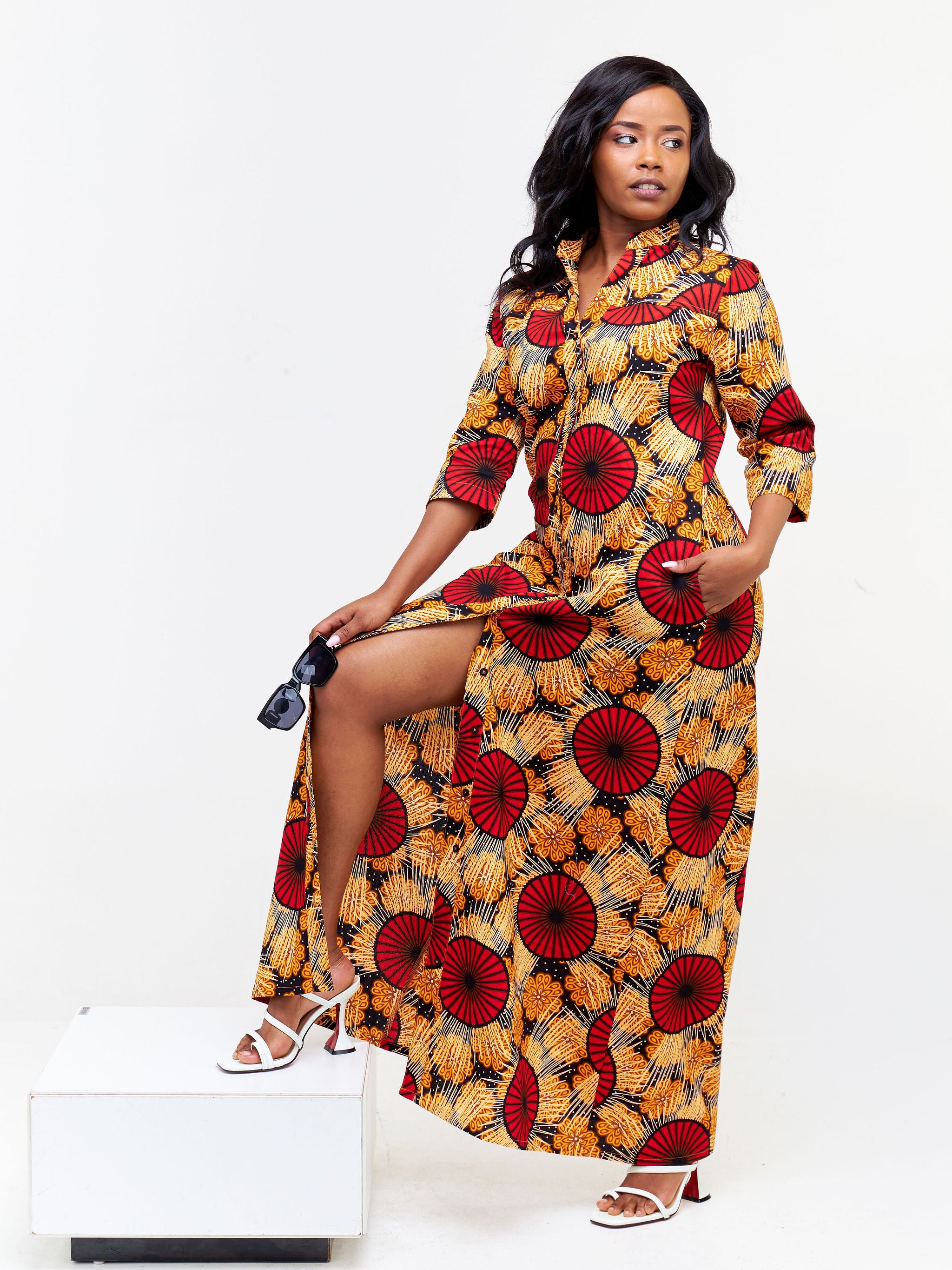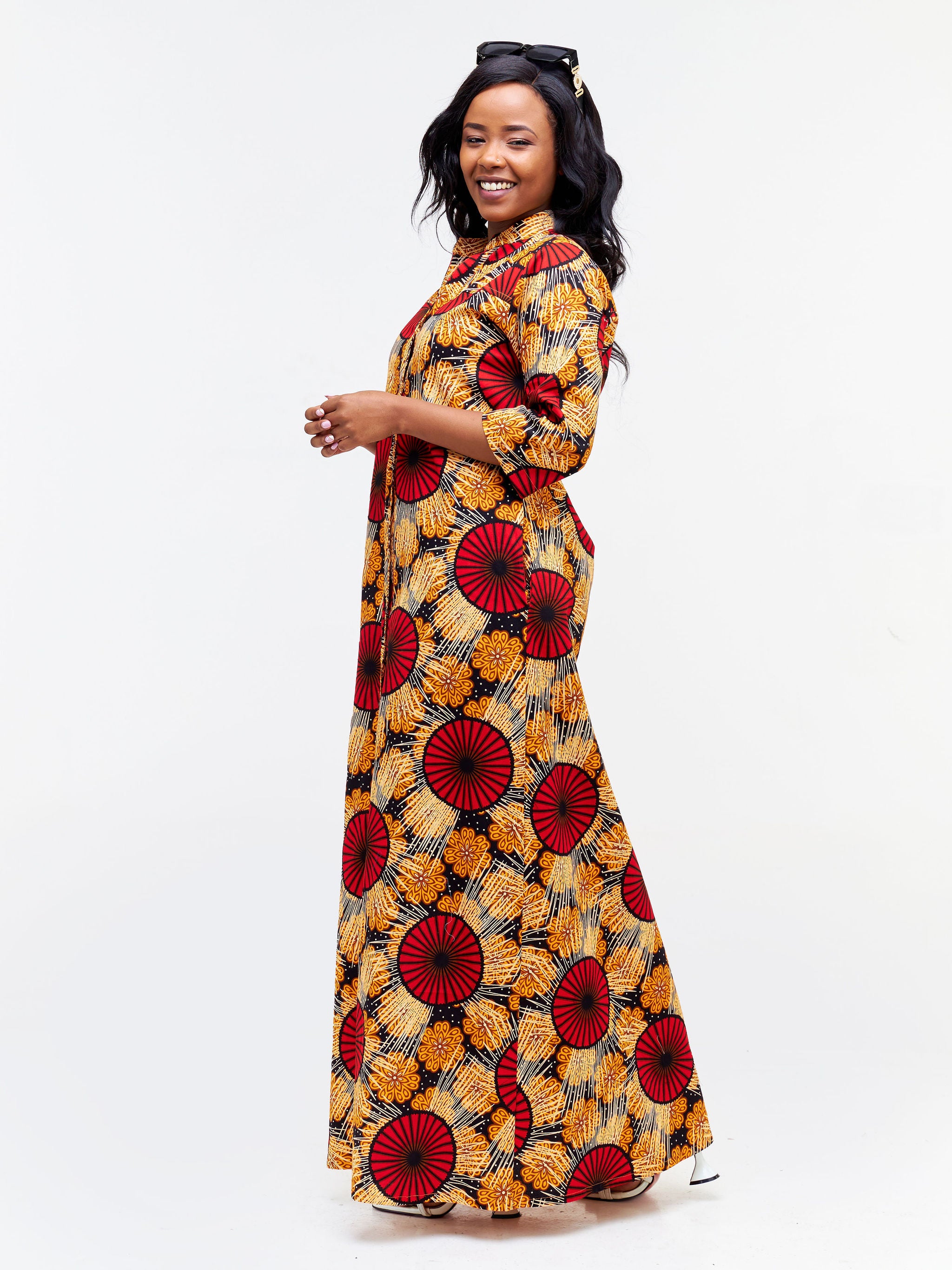 Safari Nimali 3/4 Sleeve Maxi Dress - Red / Mustard Ankara Print