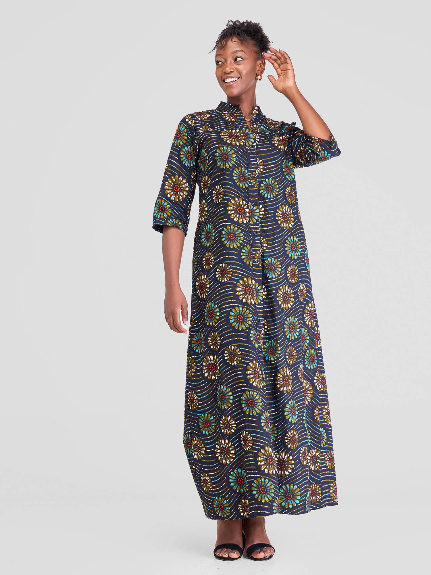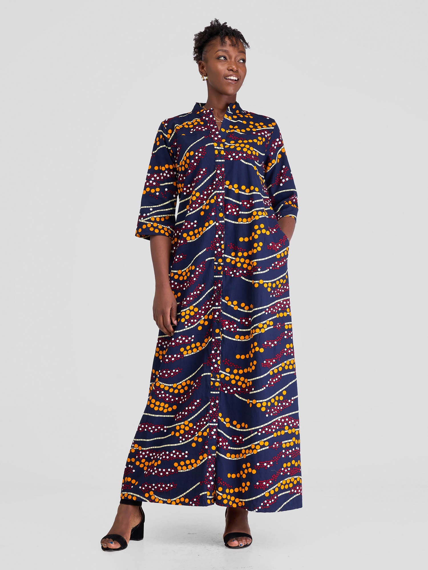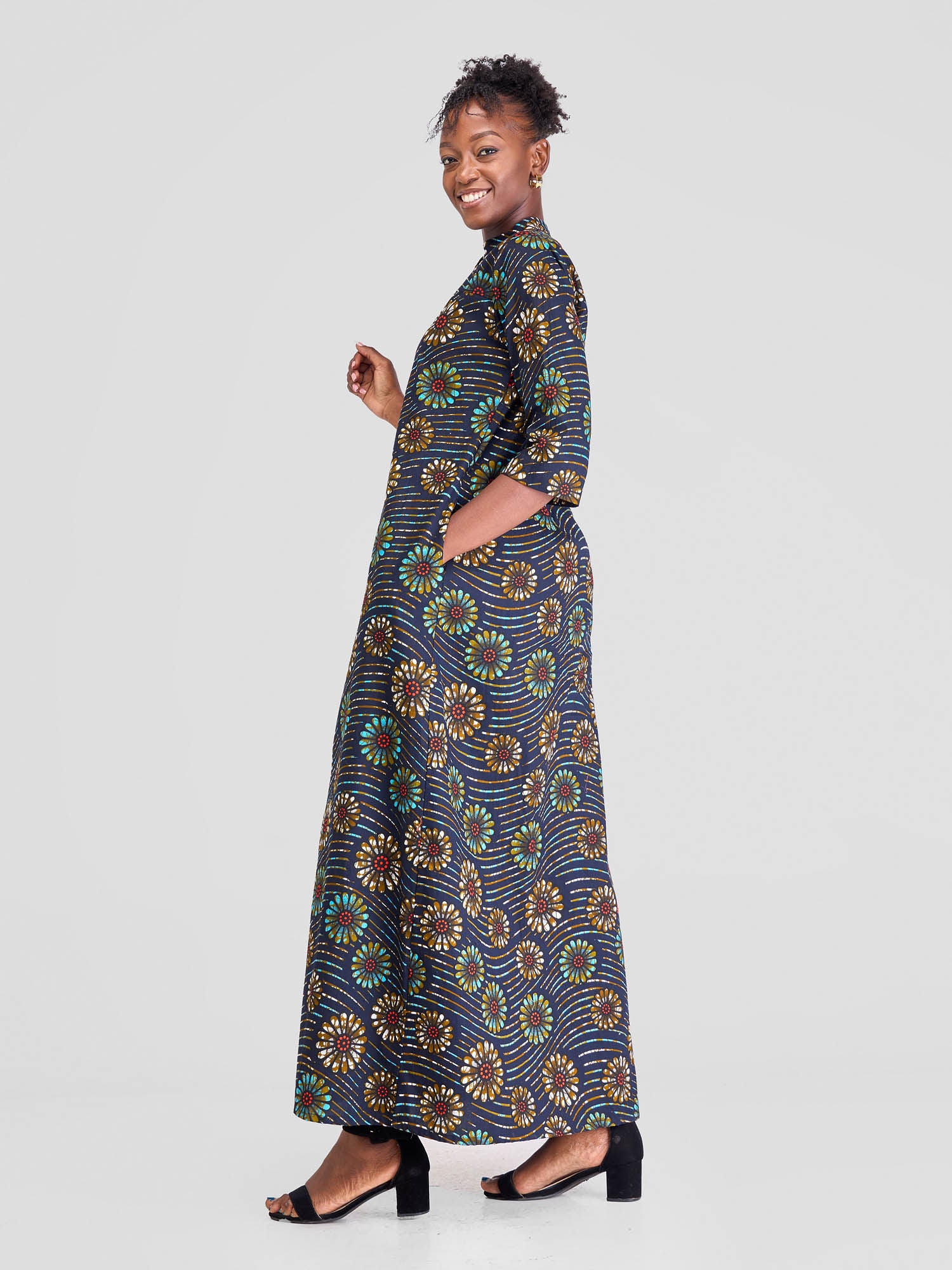 Safari Nimali 3/4 Sleeve Maxi Dress - Blue / Yellow Ankara Print