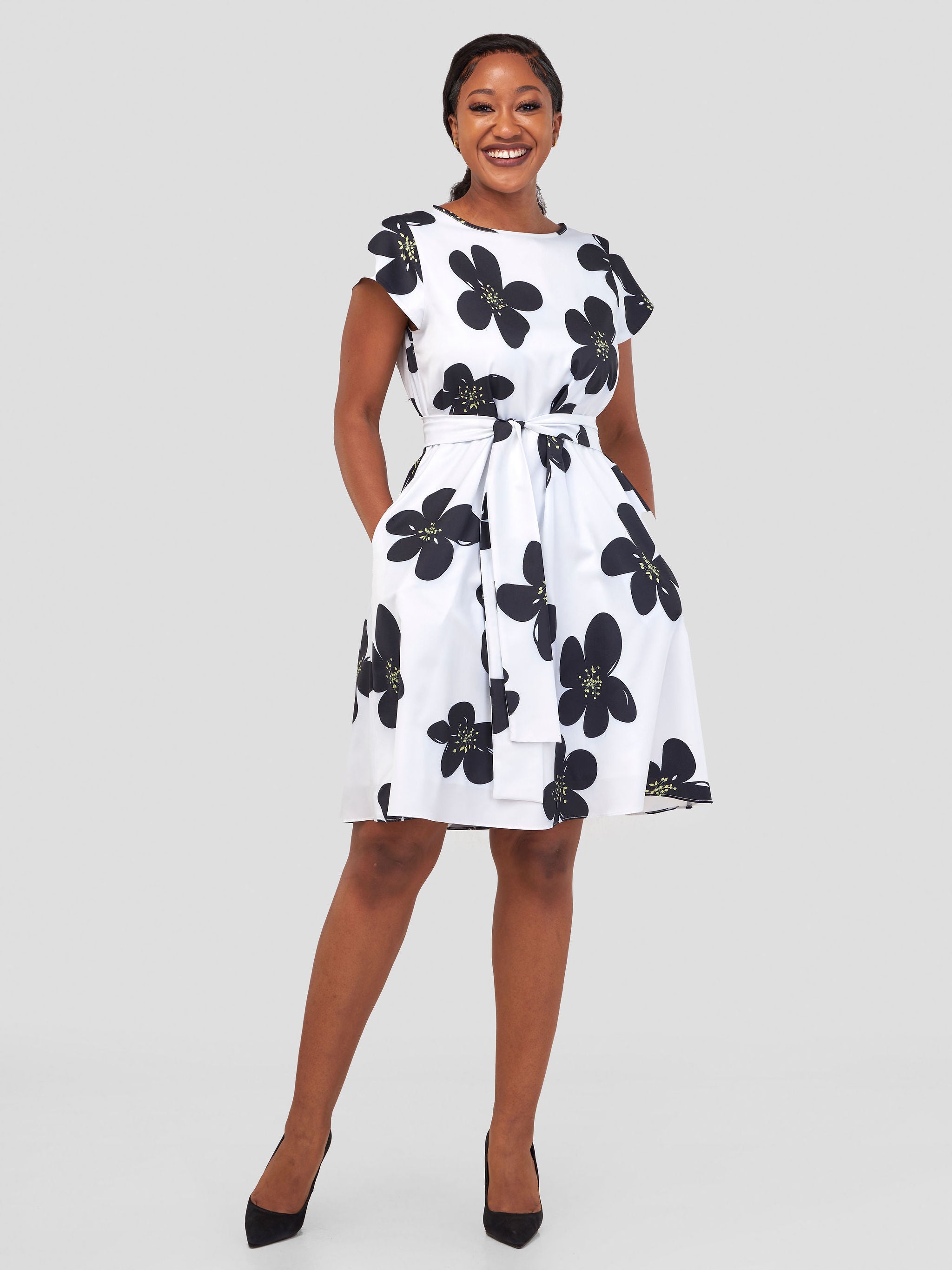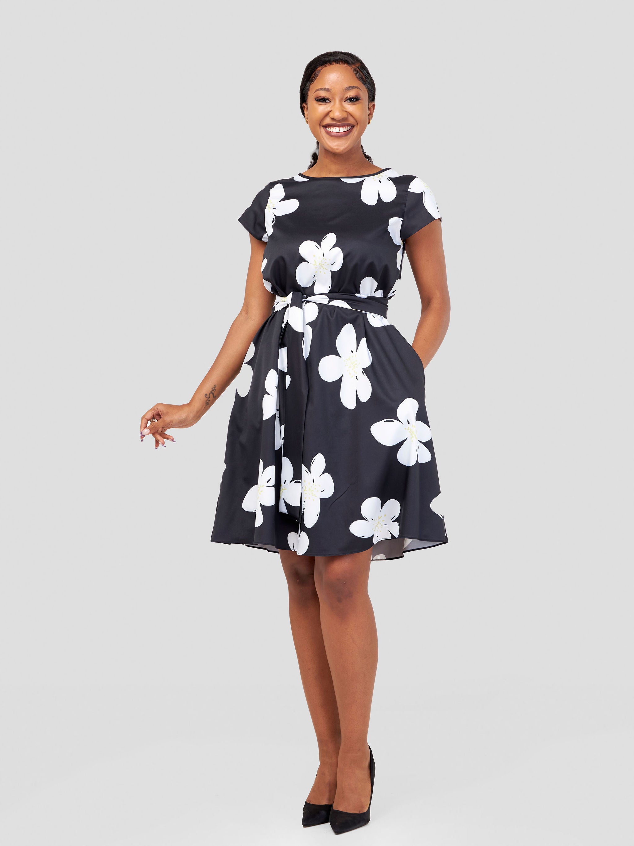 Vivo Basic Cap Sleeve Knee Length Dress - Black / White Floral Print