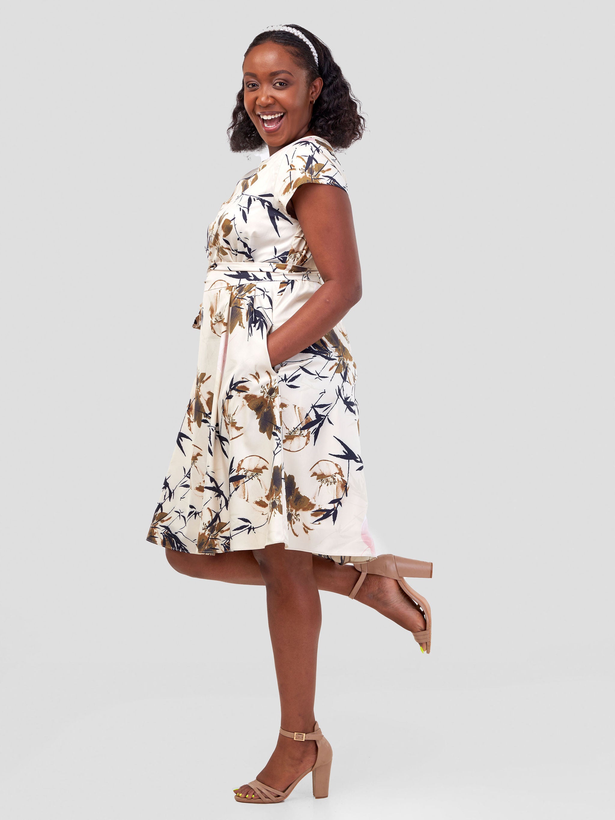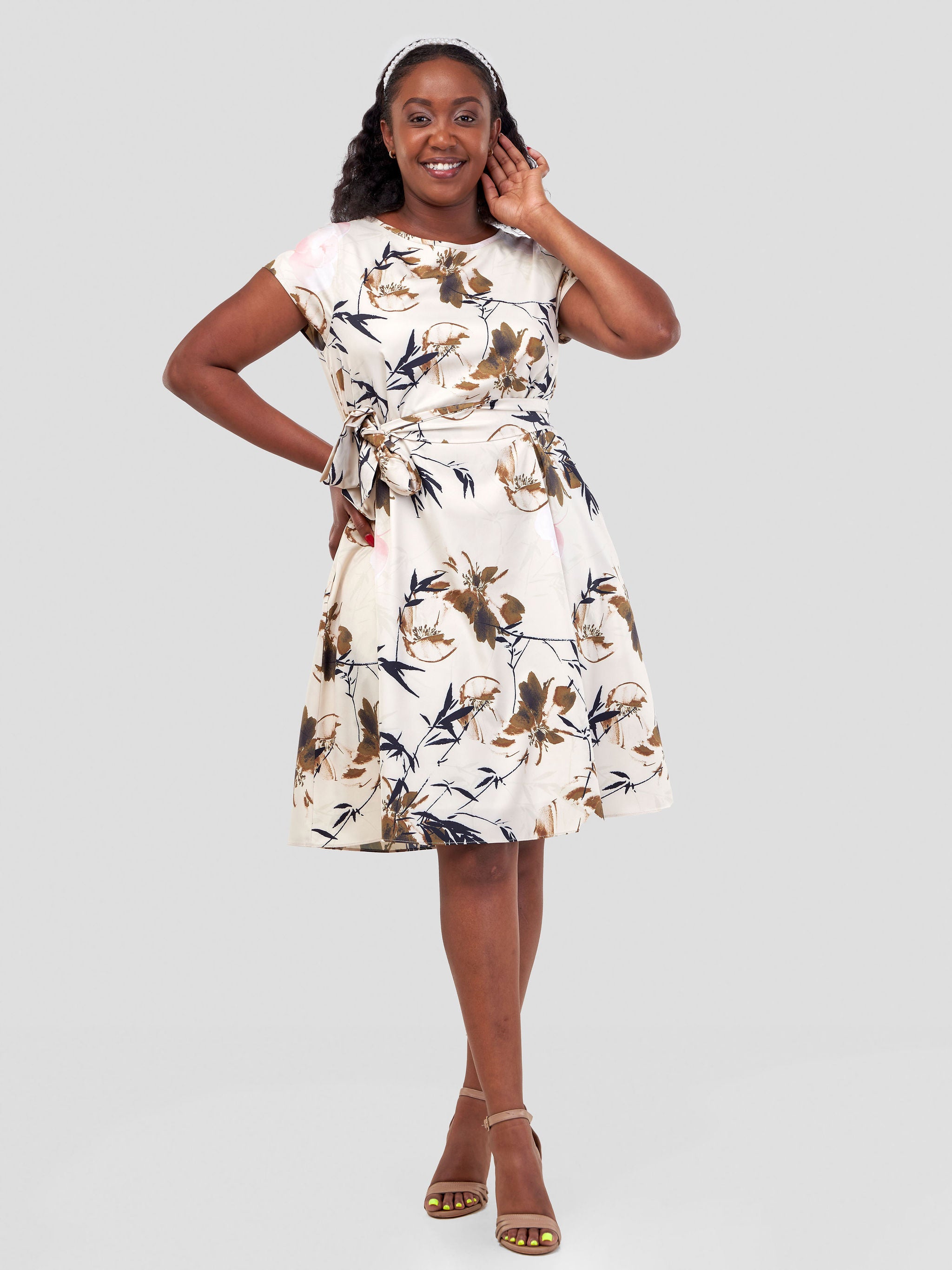 Vivo Basic Cap Sleeve Knee Length Dress - Beige / Brown Abstract Print