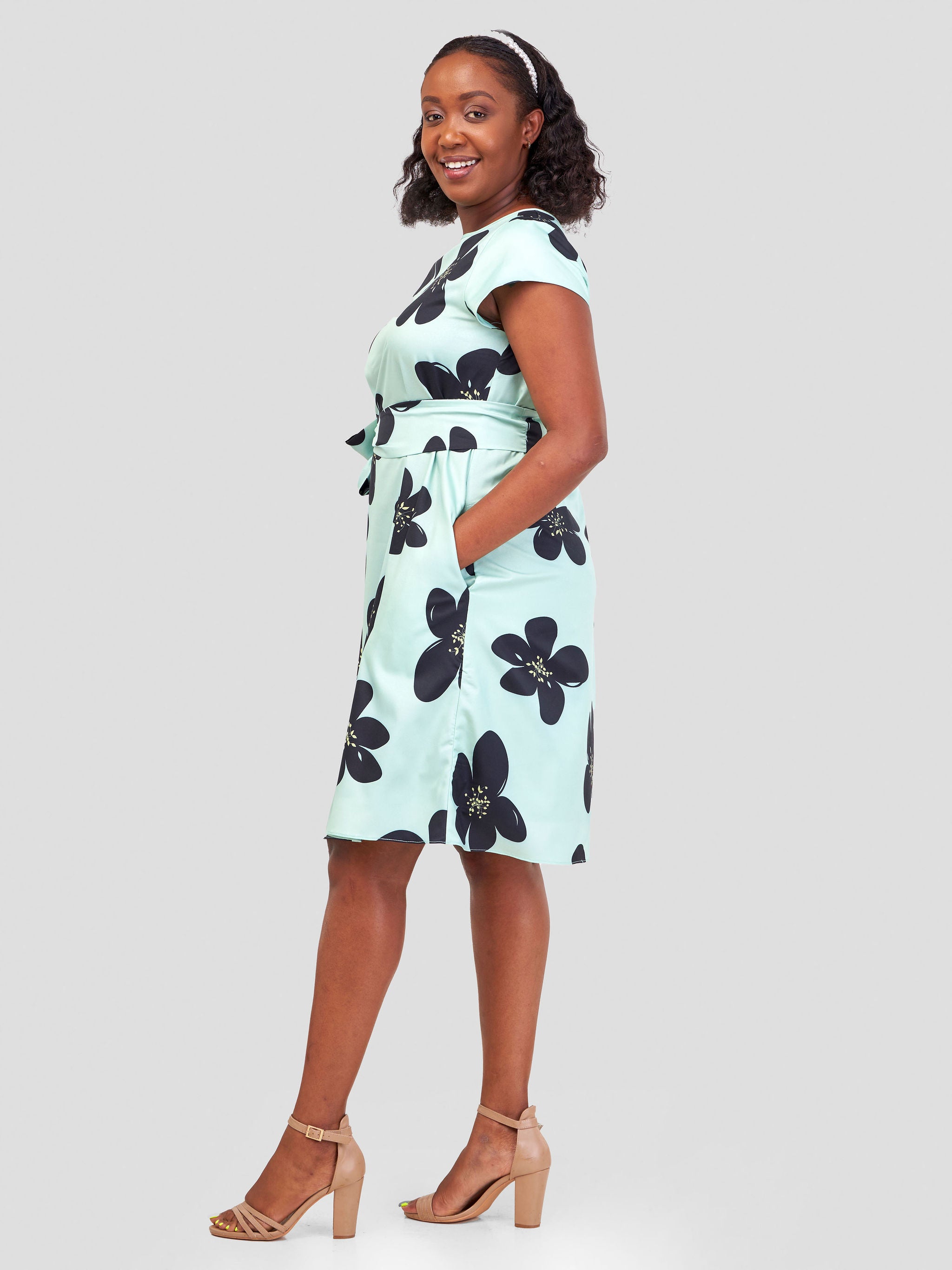 Vivo Basic Cap Sleeve Knee Length Dress - Mint Green / Black Floral Print
