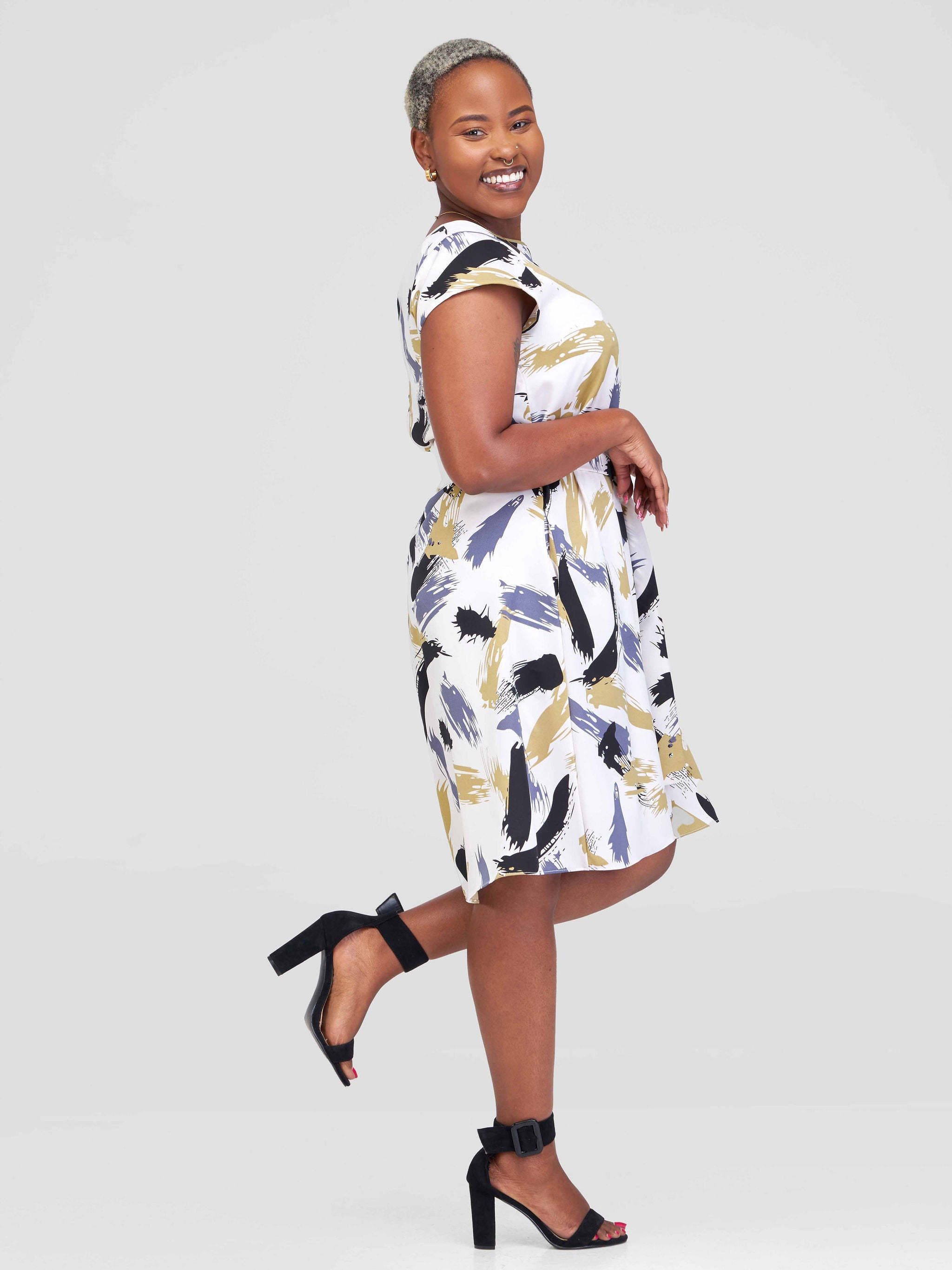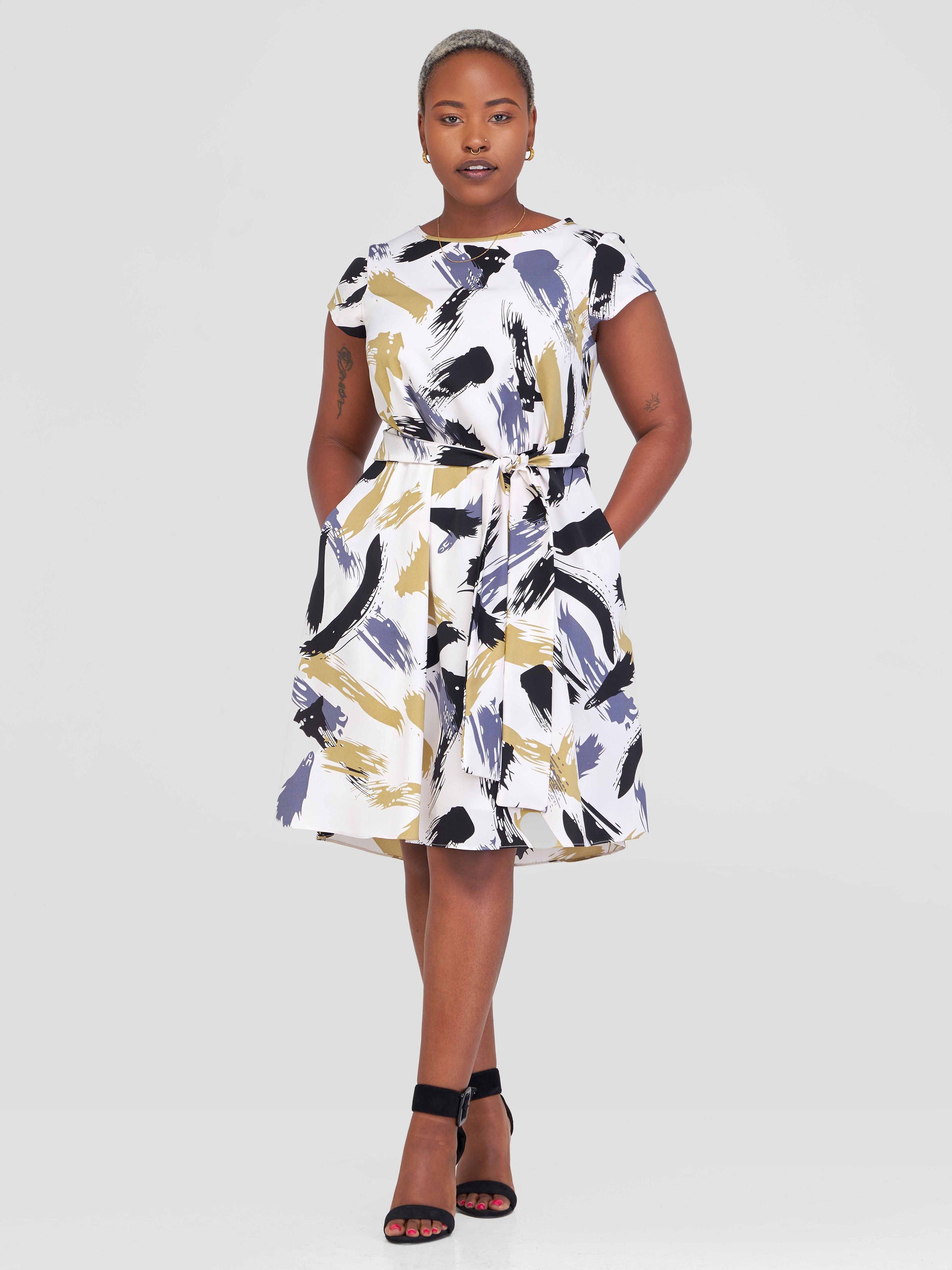 Vivo Basic Cap Sleeve Knee Length Dress - White / Sand Abi Print