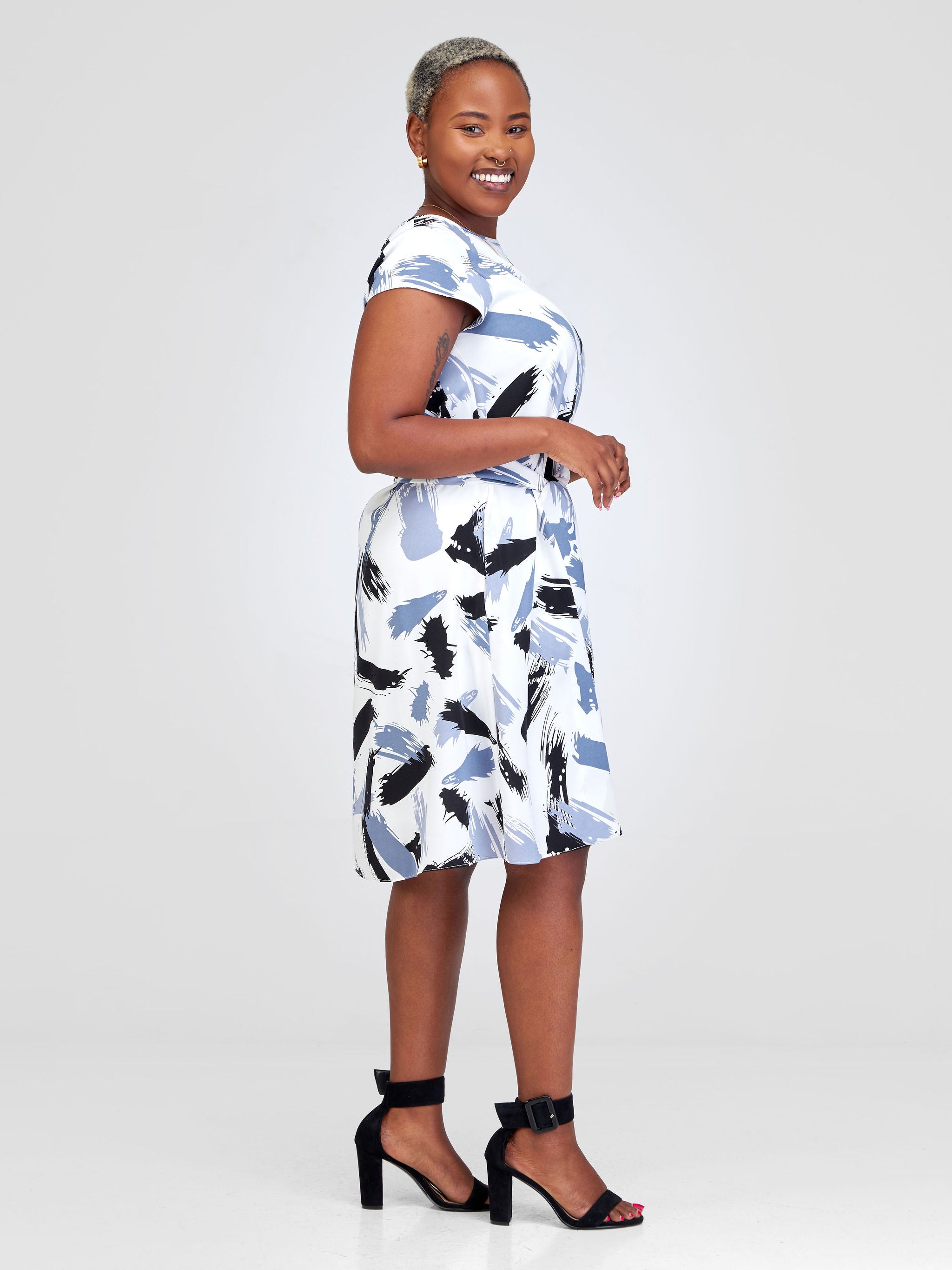 Vivo Basic Cap Sleeve Knee Length Dress - Black / Blue Abstract Print