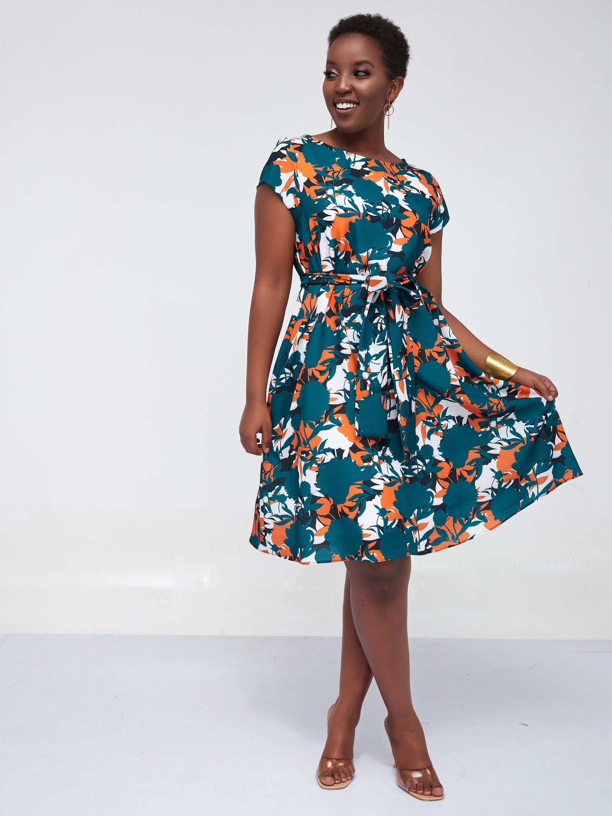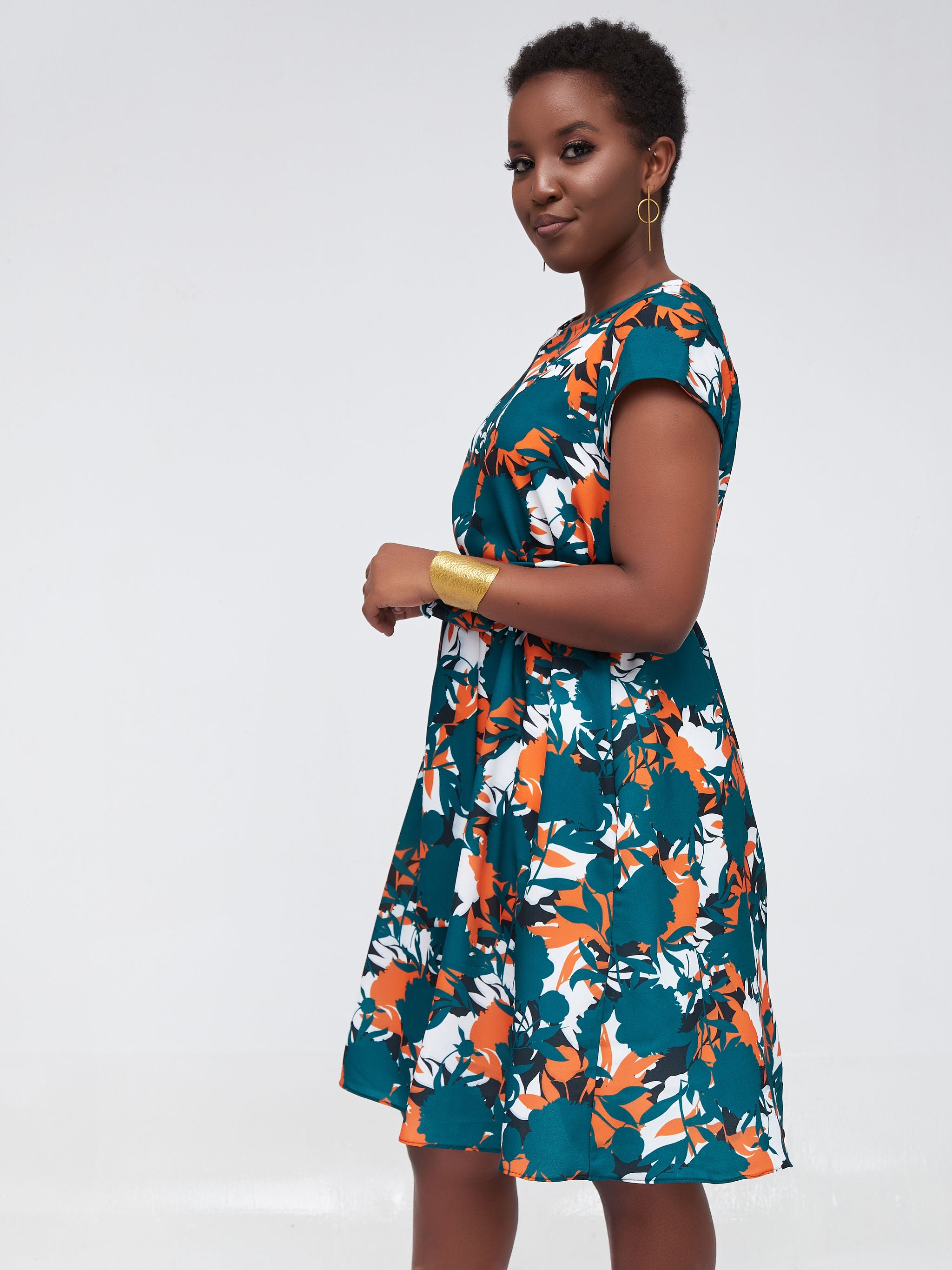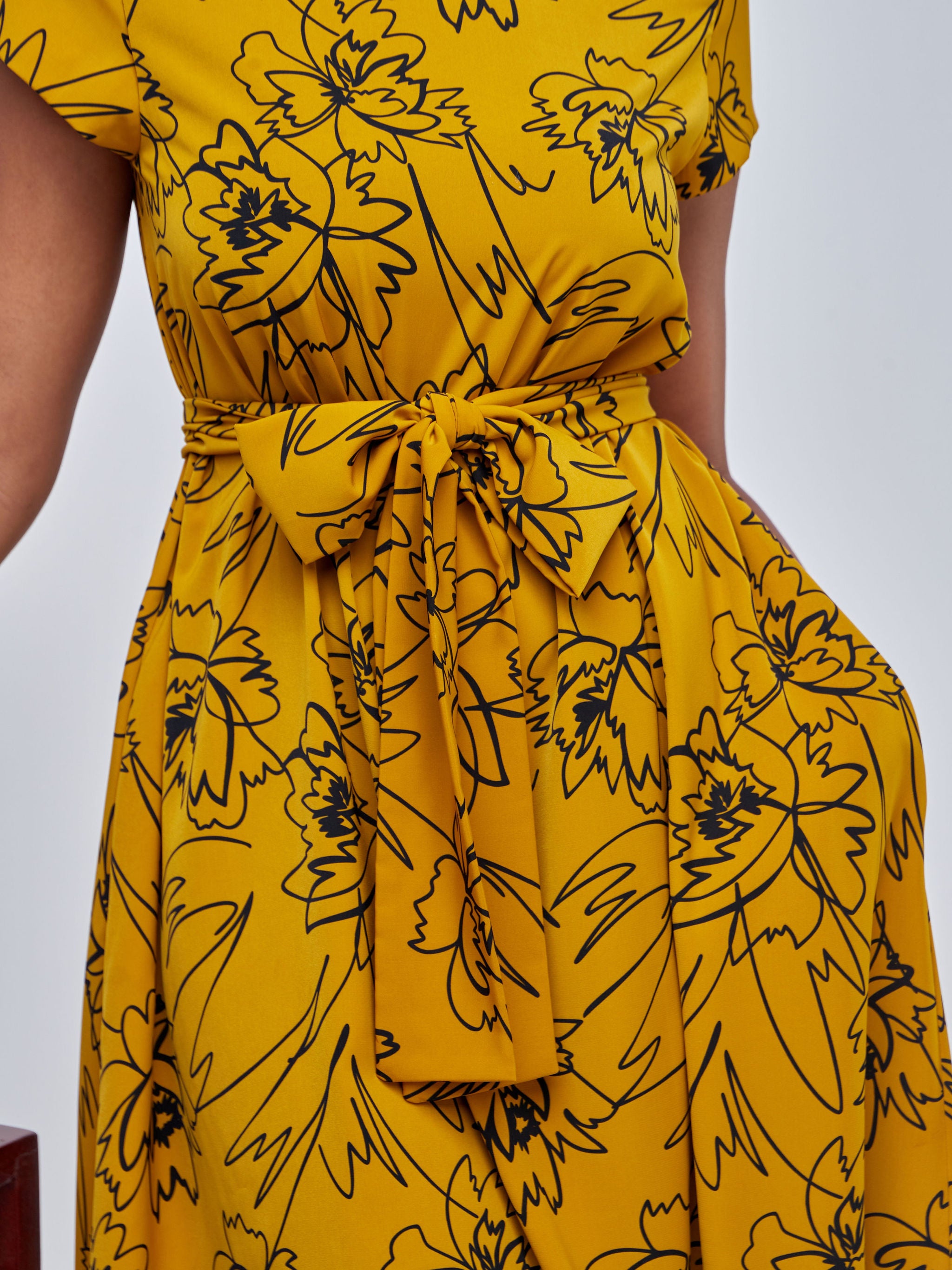 Vivo Basic Cap Sleeve Knee Length Tent Dress - Dark Mustard / Black Floral Print