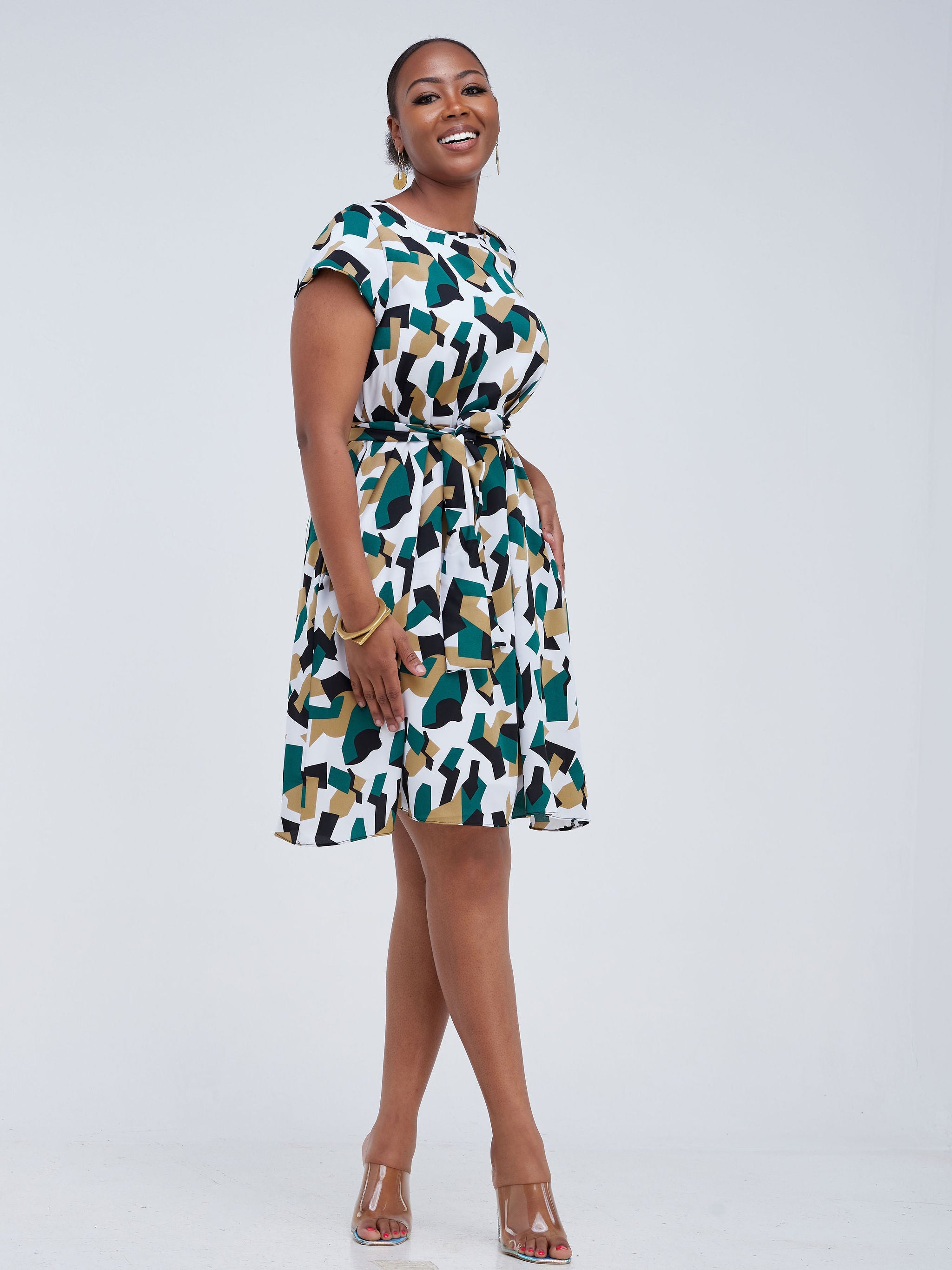 Vivo Basic Cap Sleeve Knee Length Tent Dress - Cream / Brown Abstract Print