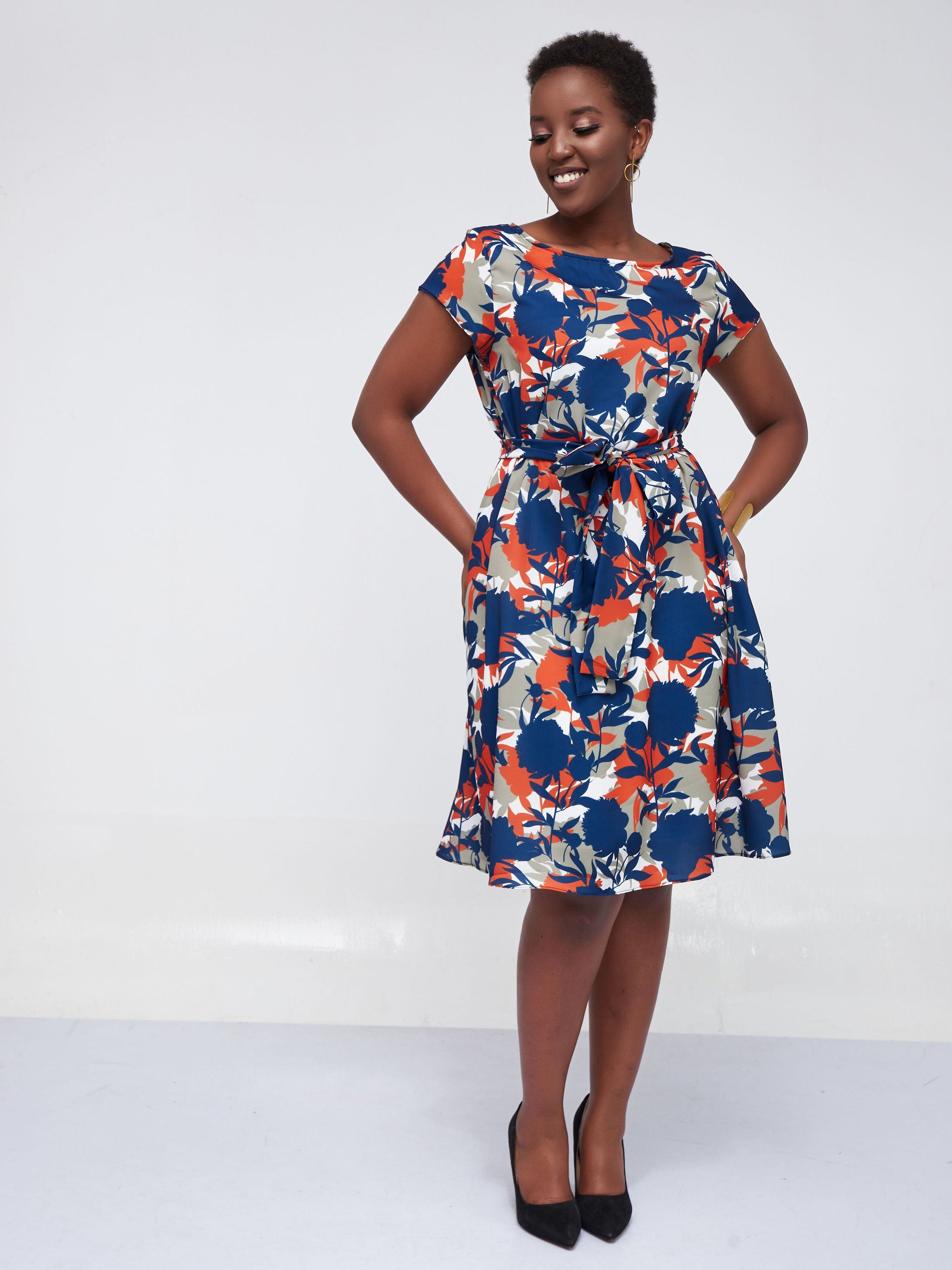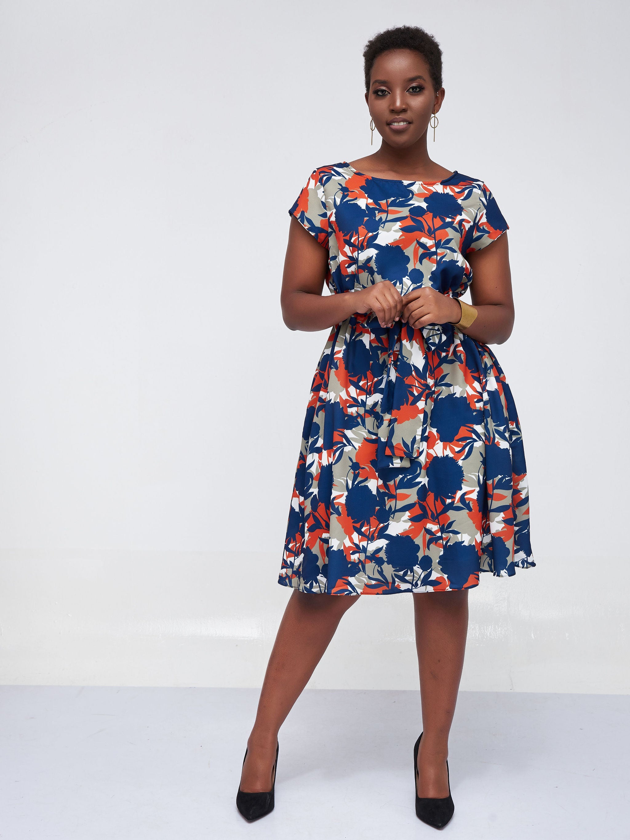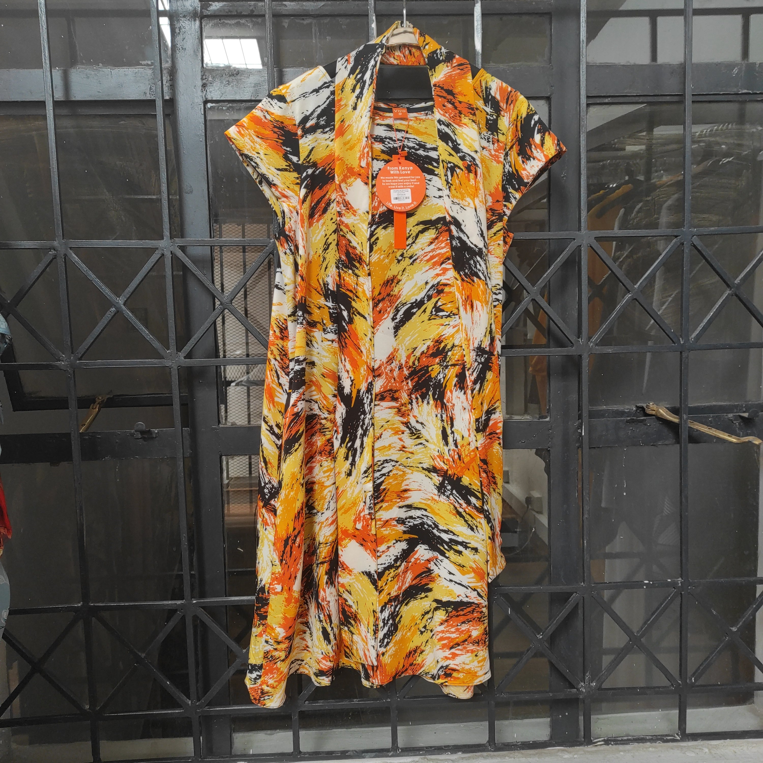 Vivo Basic Cap Sleeve Knee Length Tent Dress - Orange / Black Abstract Print