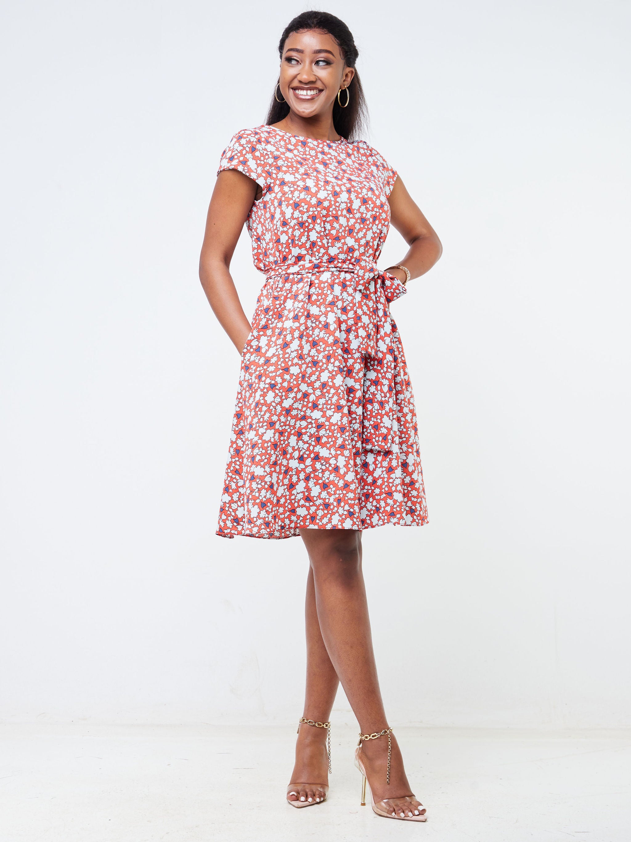 Vivo Basic Cap Sleeve Knee Length Tent Dress - Off White / Orange Floral Print