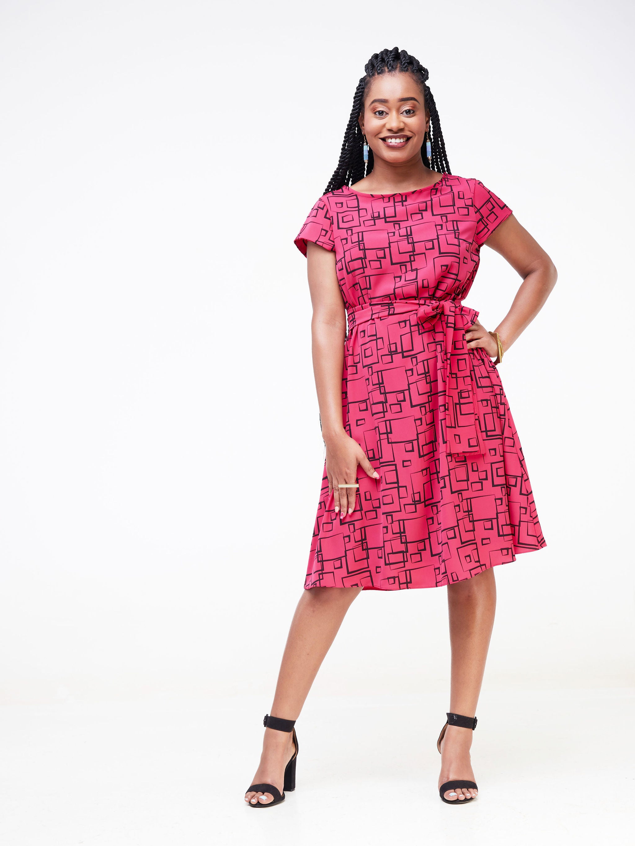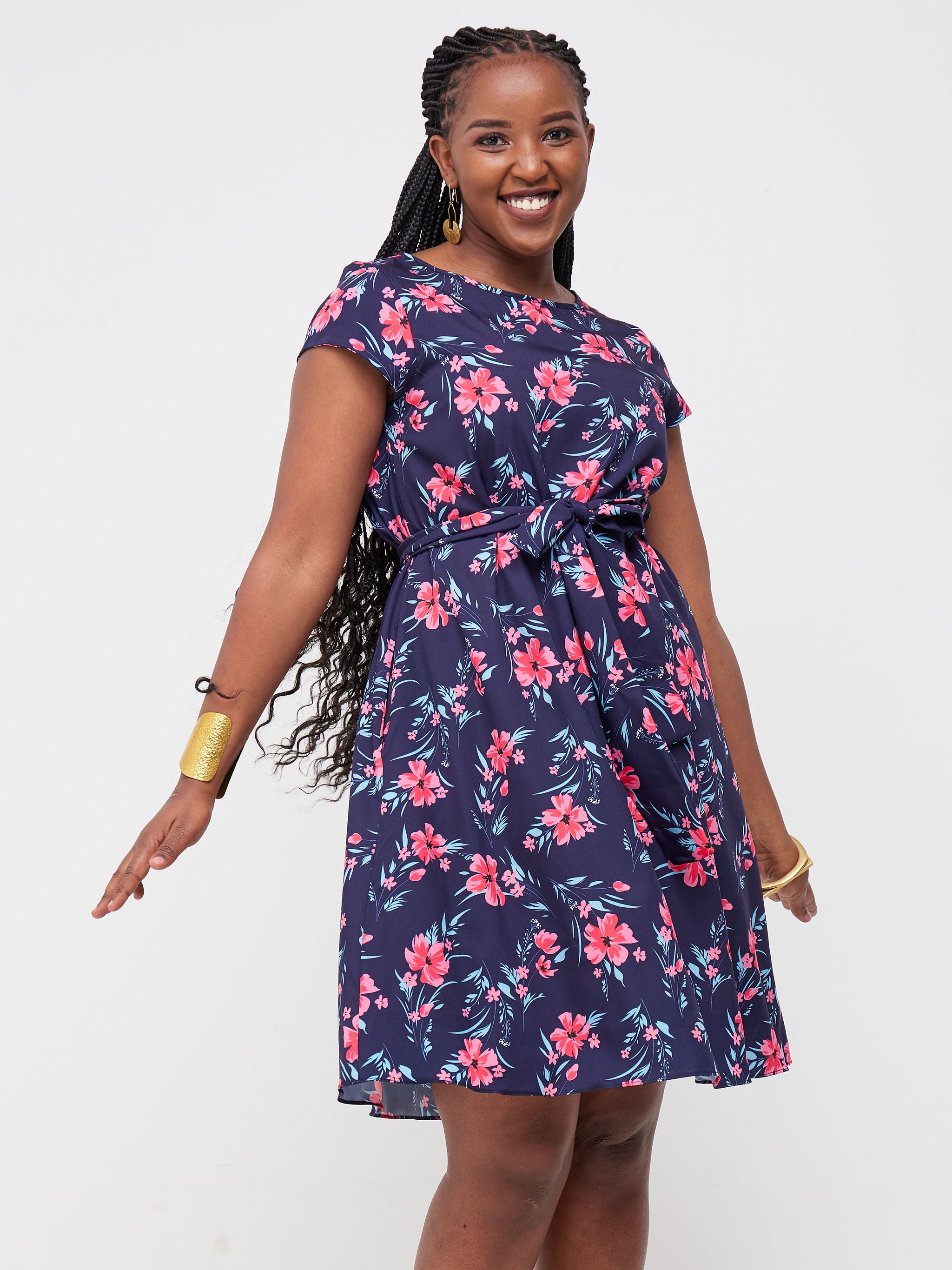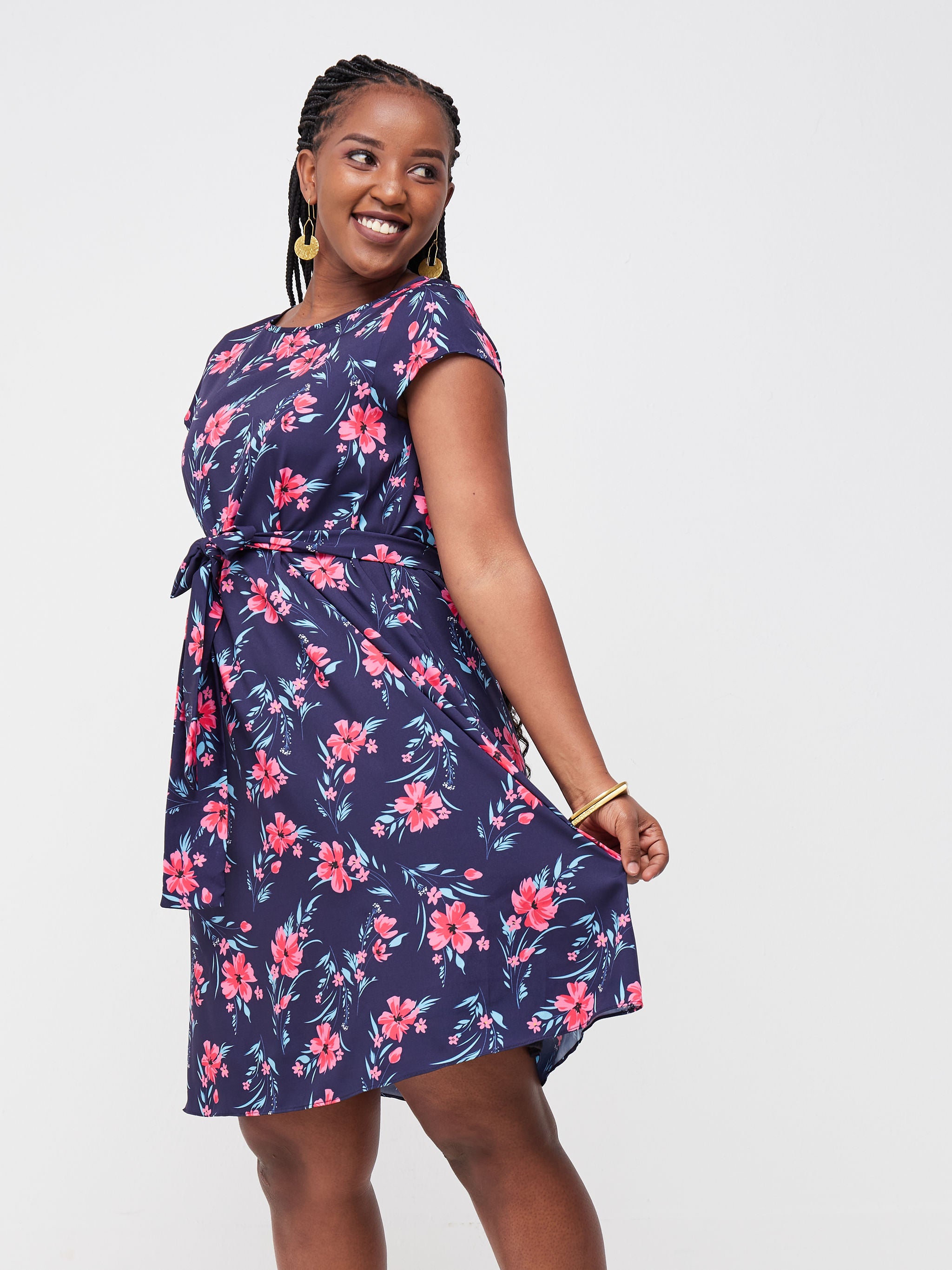 Vivo Basic Cap Sleeve Knee Length Tent Dress - Navy Blue / Pink Floral Print