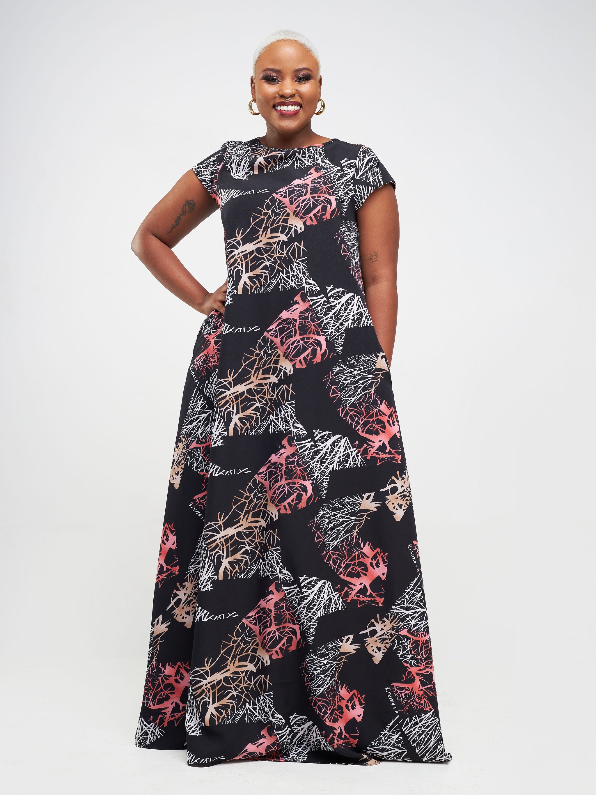 Vivo Basic Cap Sleeve Maxi Tent Dress - Black / White Esna Print