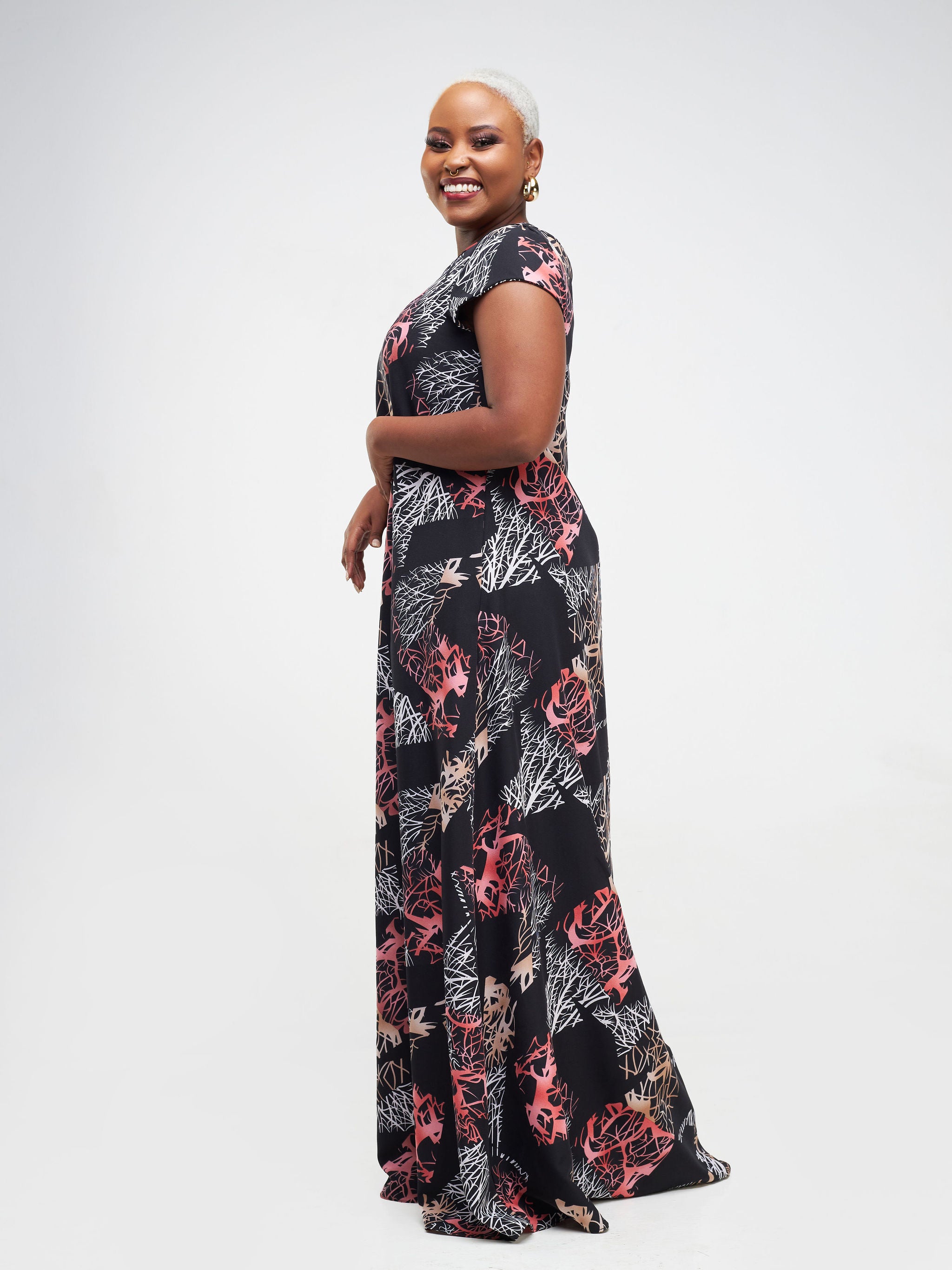 Vivo Basic Cap Sleeve Maxi Tent Dress - Black / Peach Print