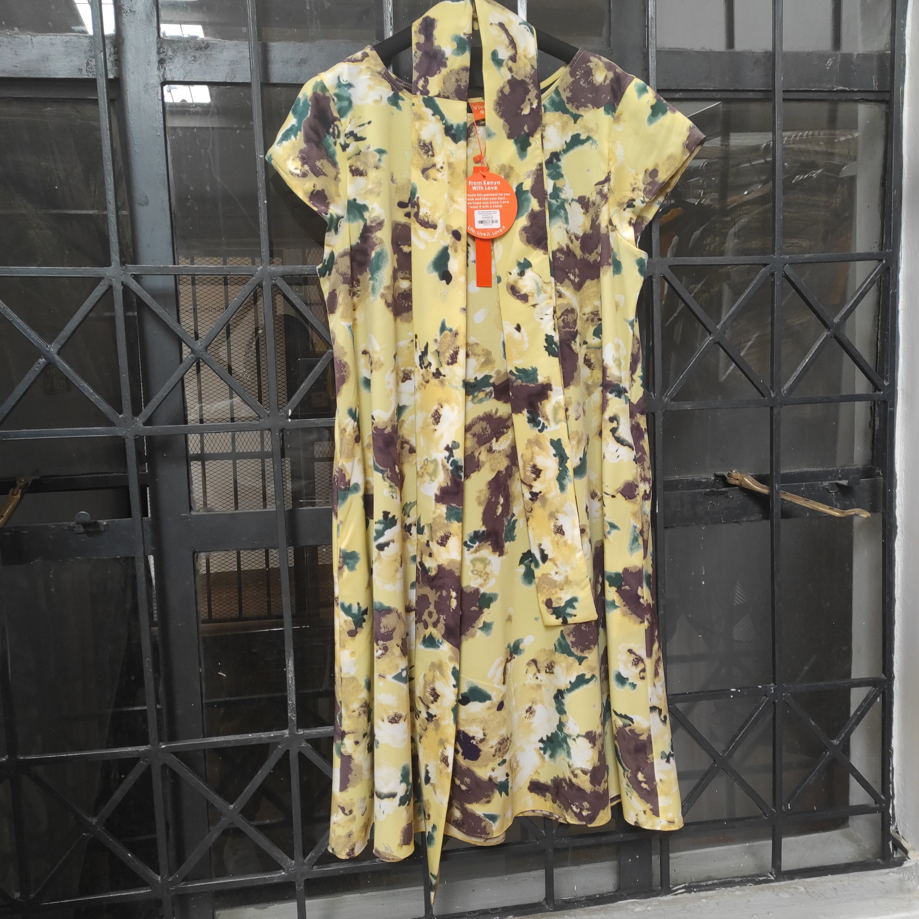 Vivo Basic Cap Sleeve Knee Length Tent Dress - Yellow Abstract Print