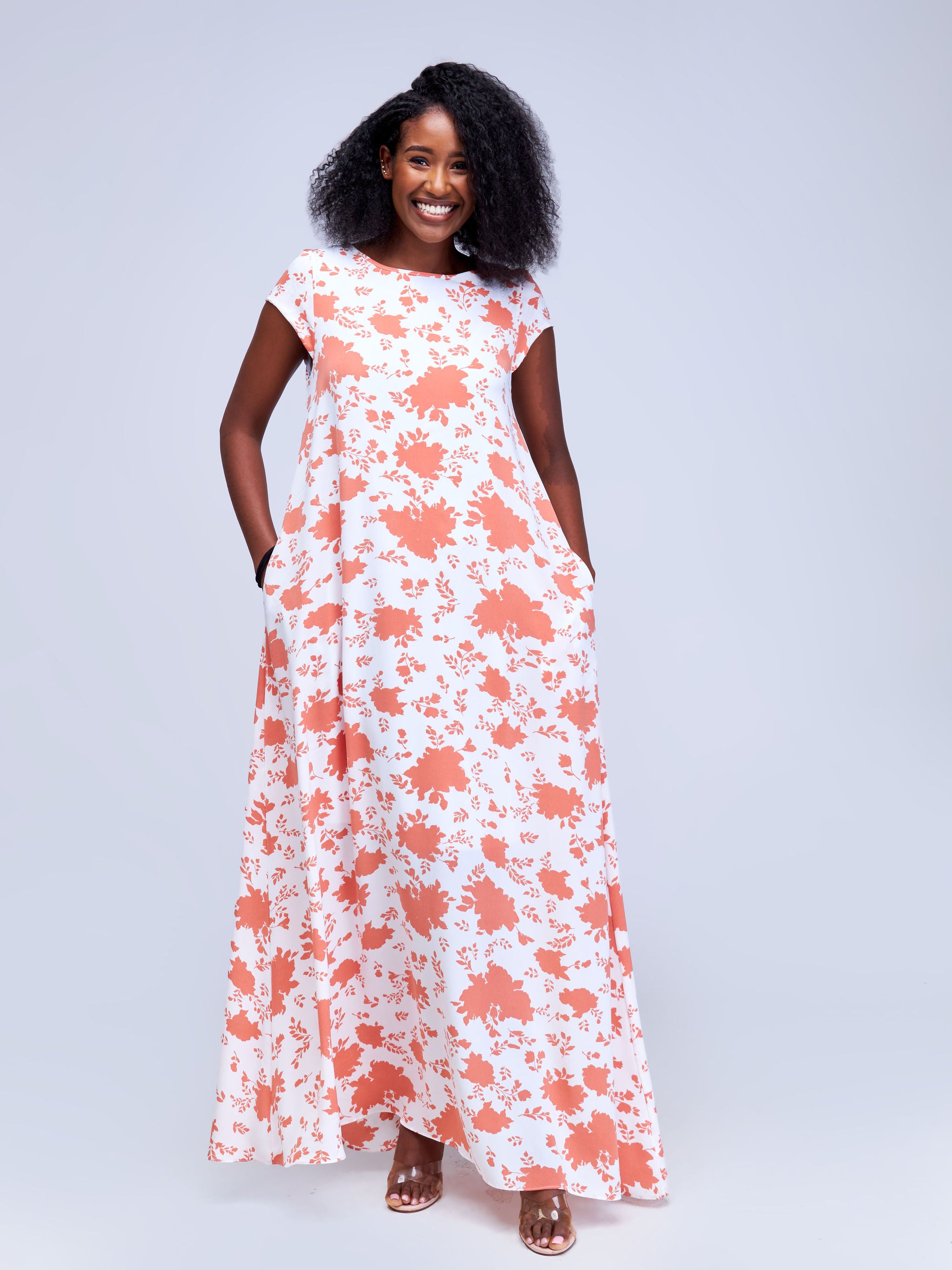 Vivo Basic Cap Sleeve Maxi Tent Dress - White / Peach Floral Print