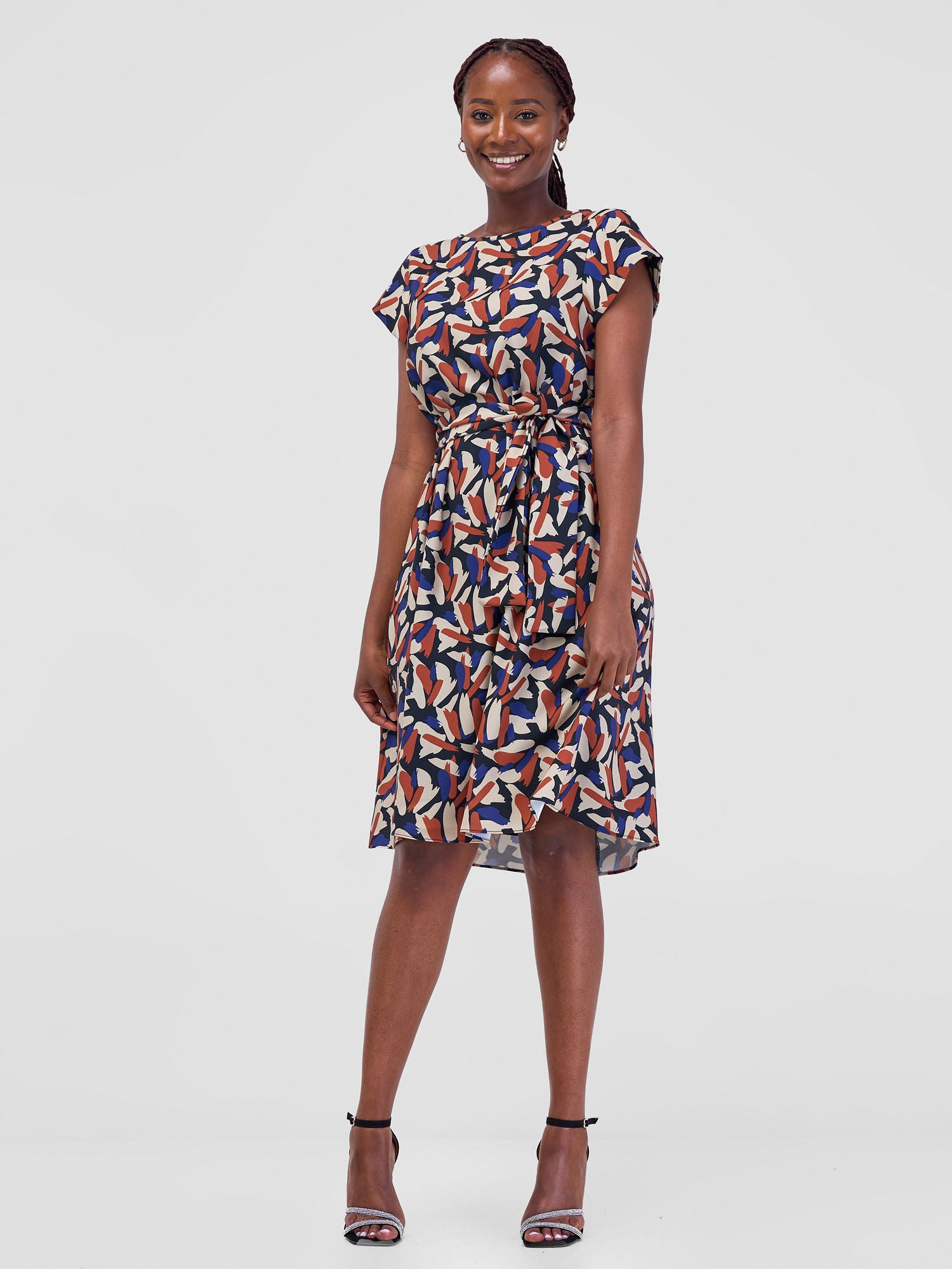 Vivo Basic Cap Sleeve Tent Knee Length Dress - Beige / Brown Mawi Print