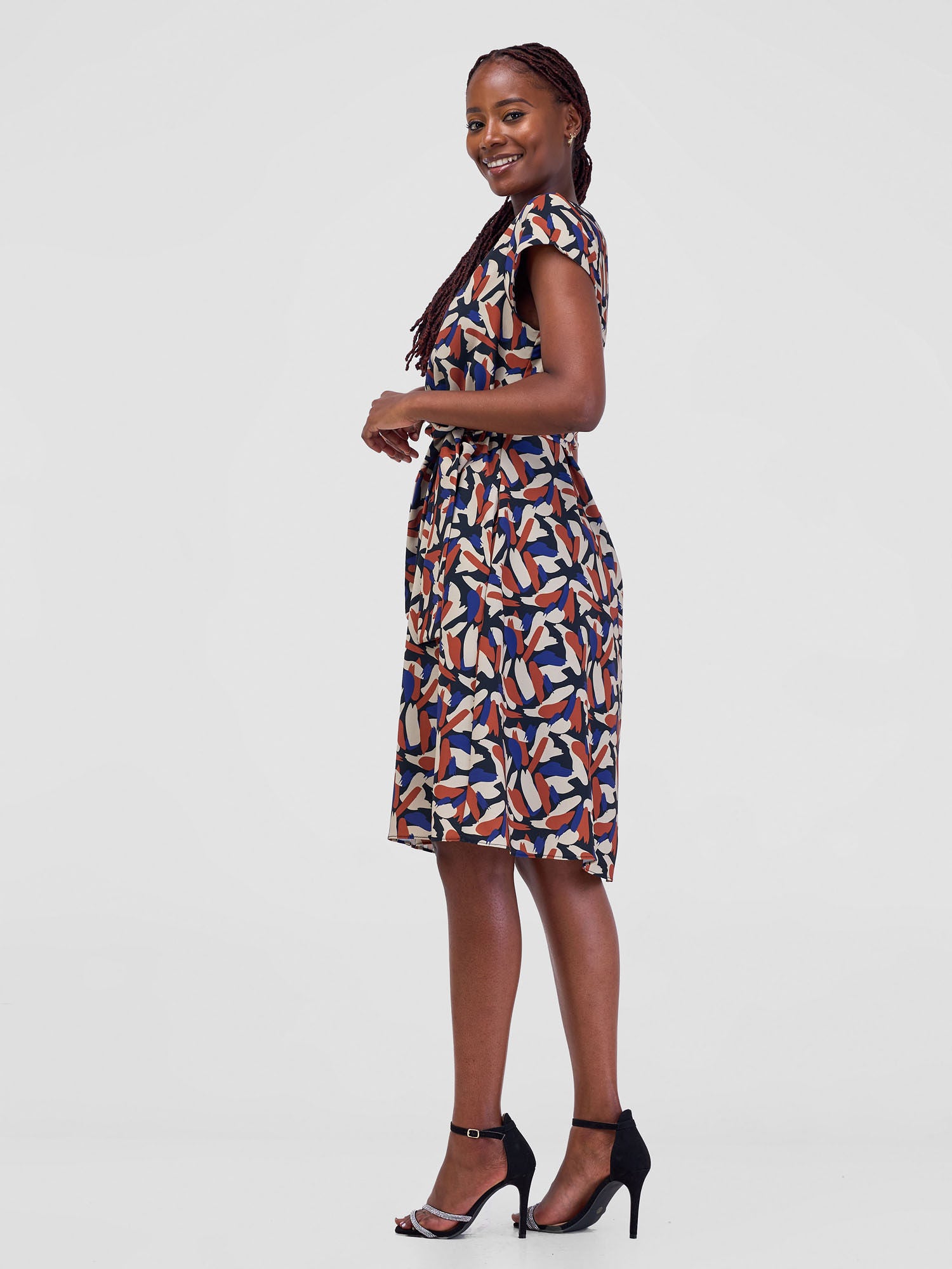 Vivo Basic Cap Sleeve Tent Knee Length Dress - Black / Brown Mawi Print