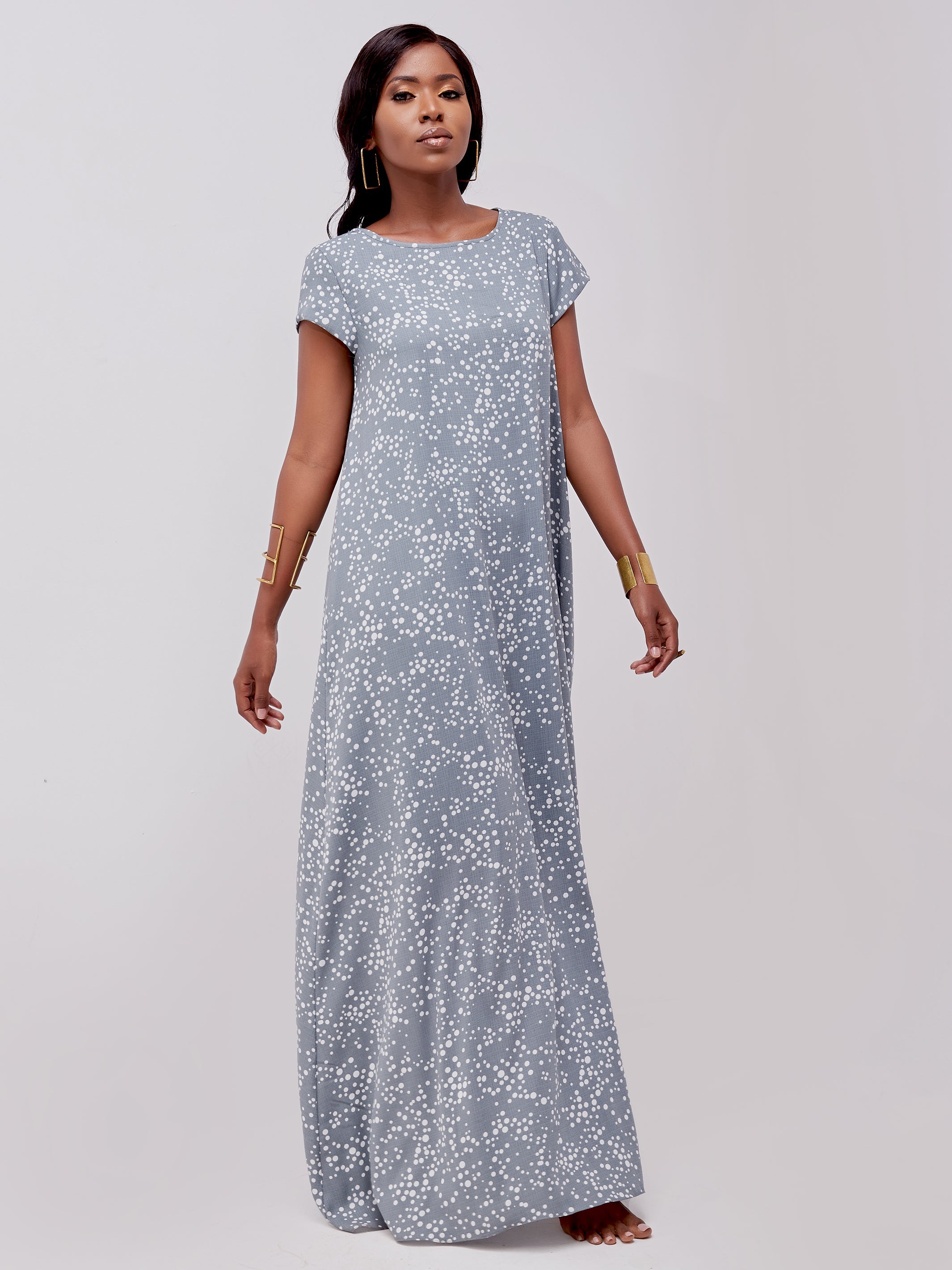 Vivo Basic Cap Sleeved Tent Maxi Dress - Grey / White Print