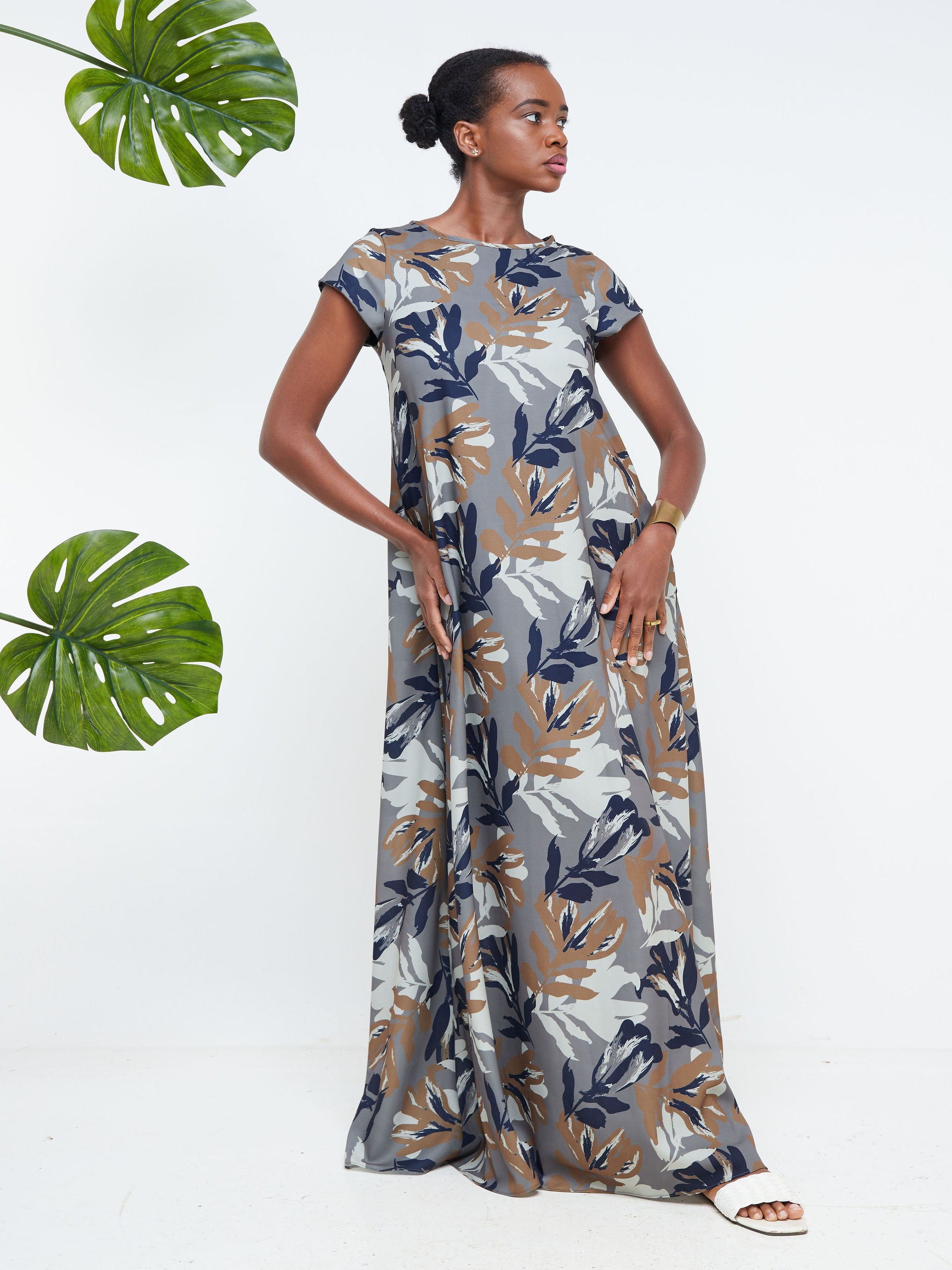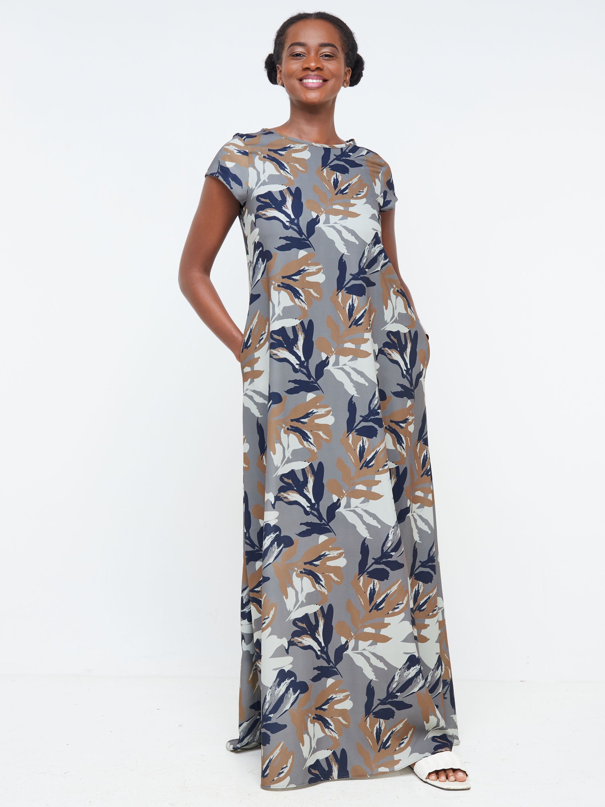 Vivo Basic Cap Sleeved Tent Maxi Dress - Grey / Navy Blue Floral Print