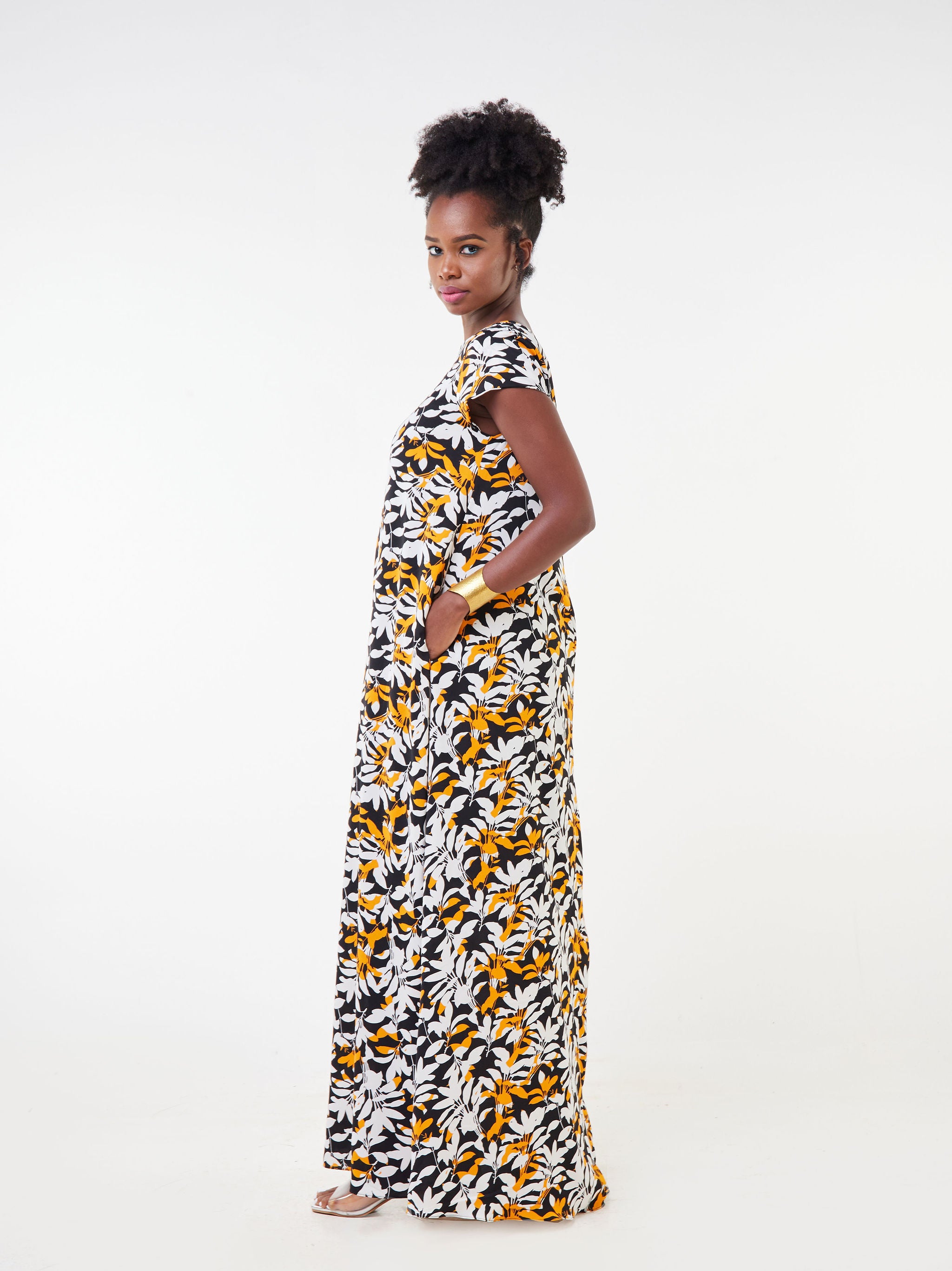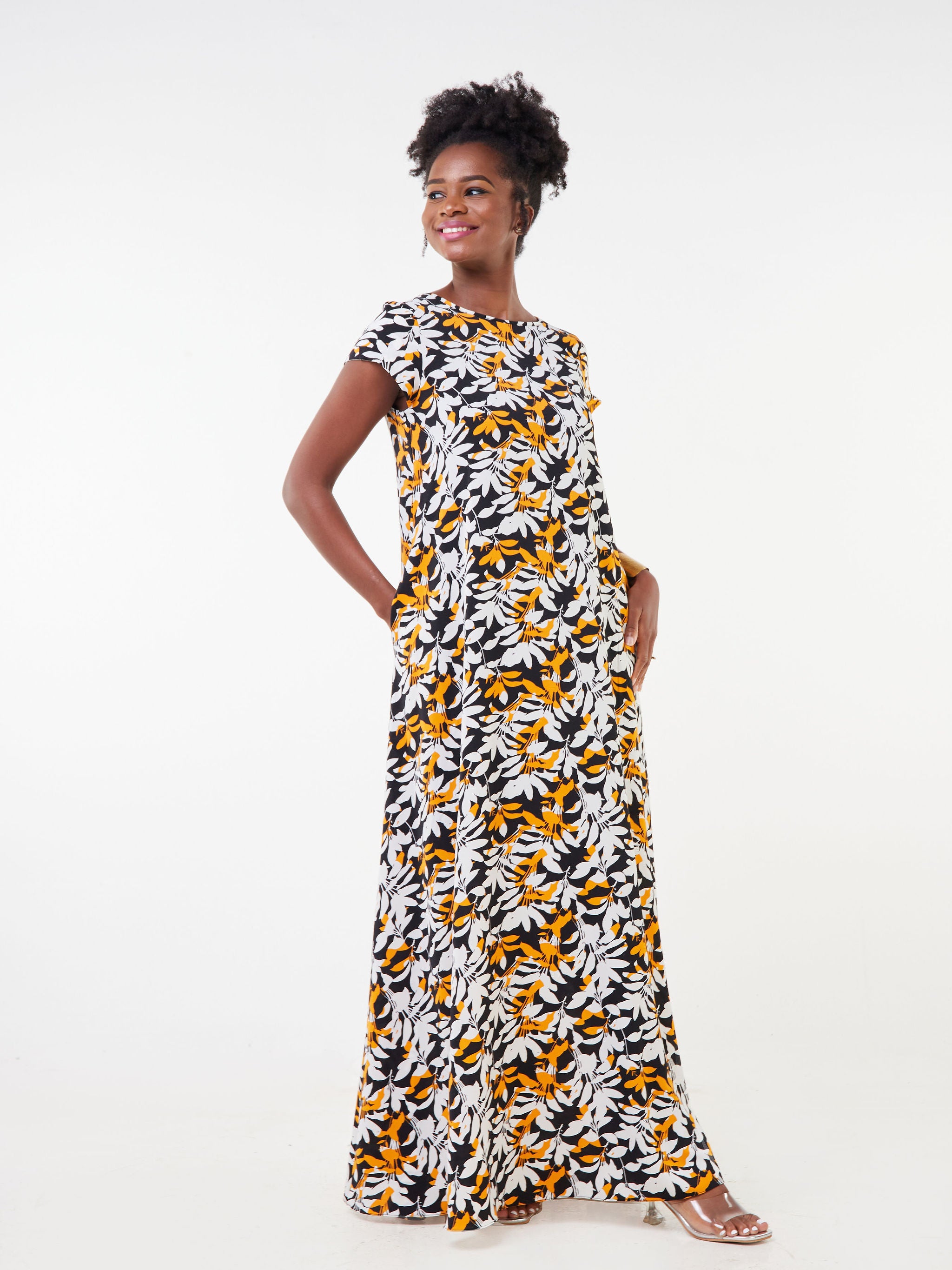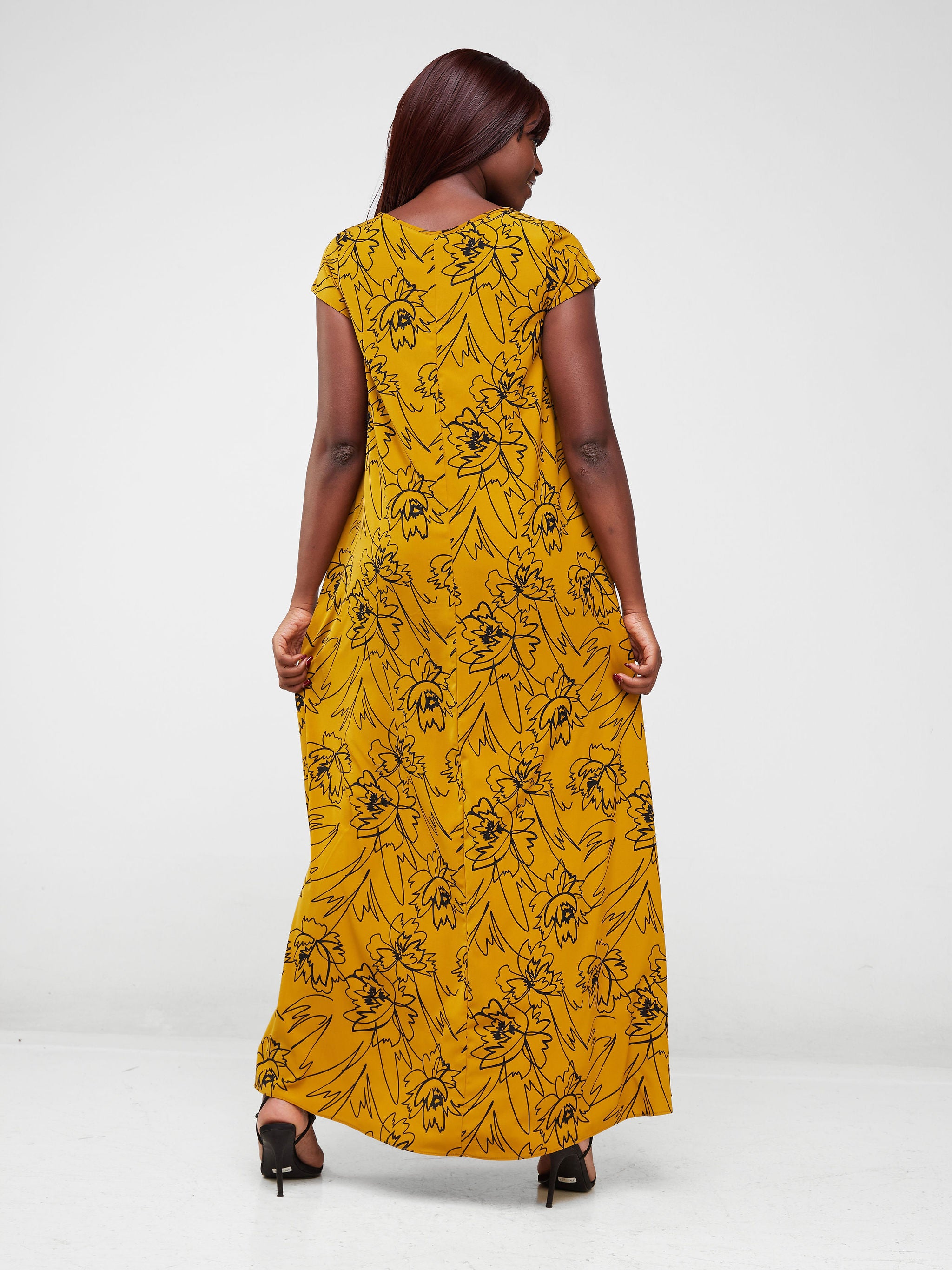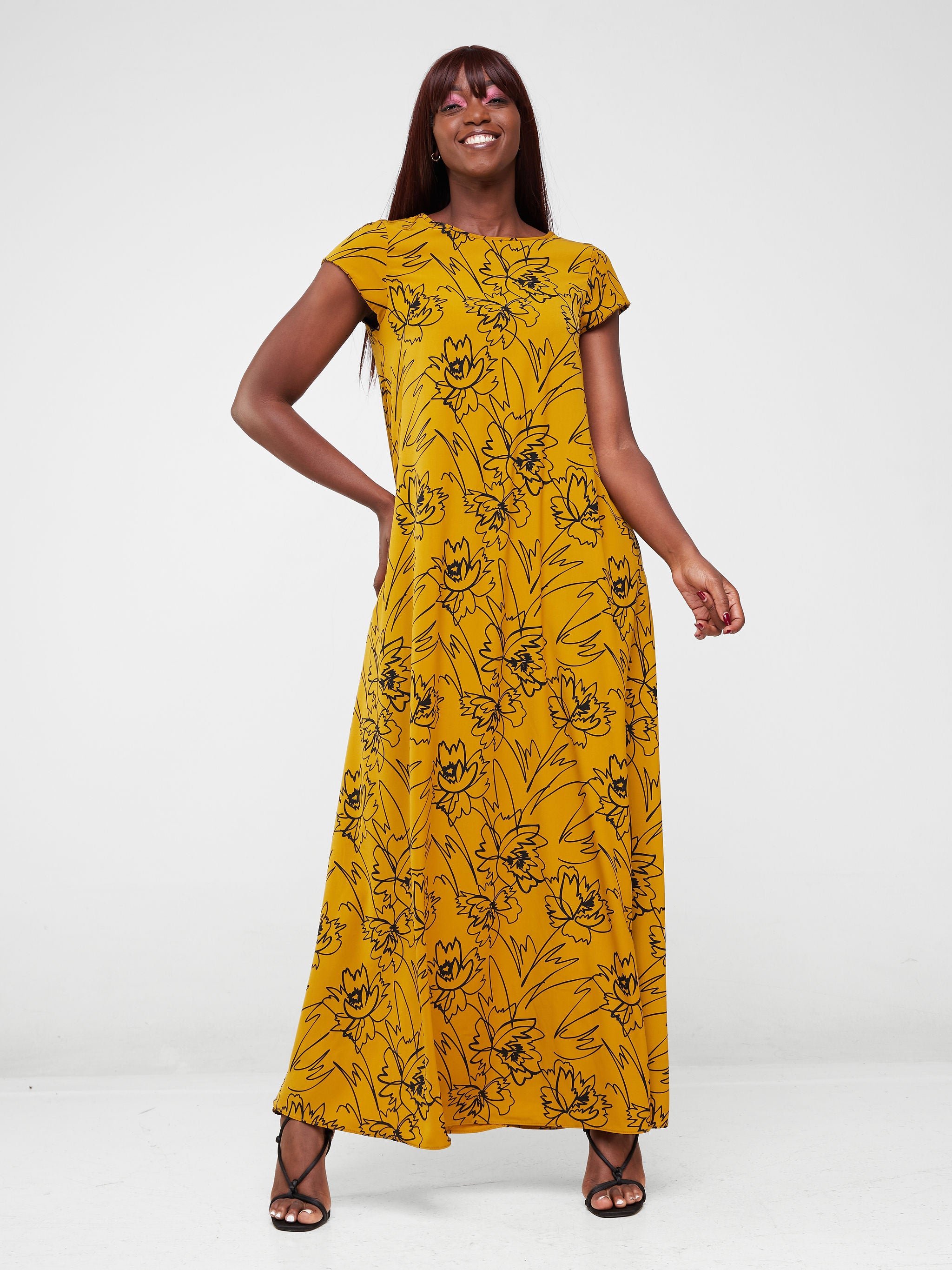 Vivo Basic Cap Sleeved Tent Maxi Dress - Mustard / Black Floral Print