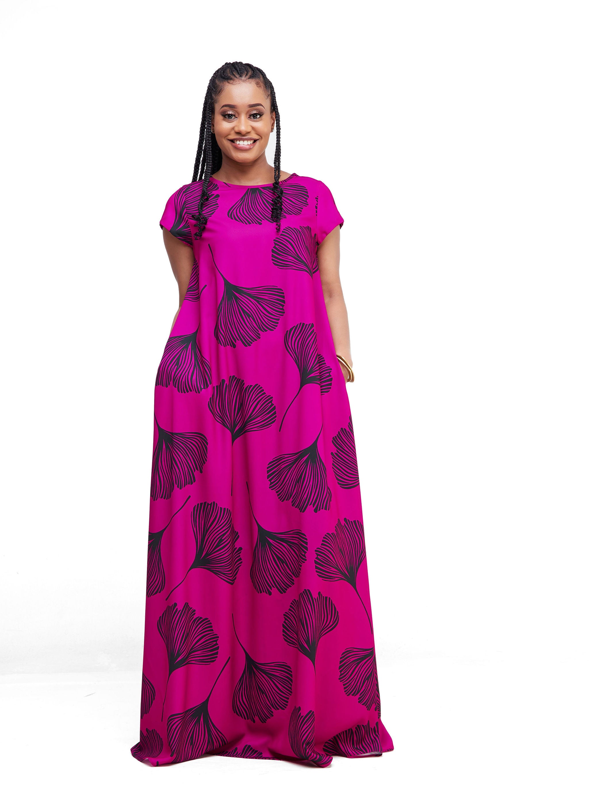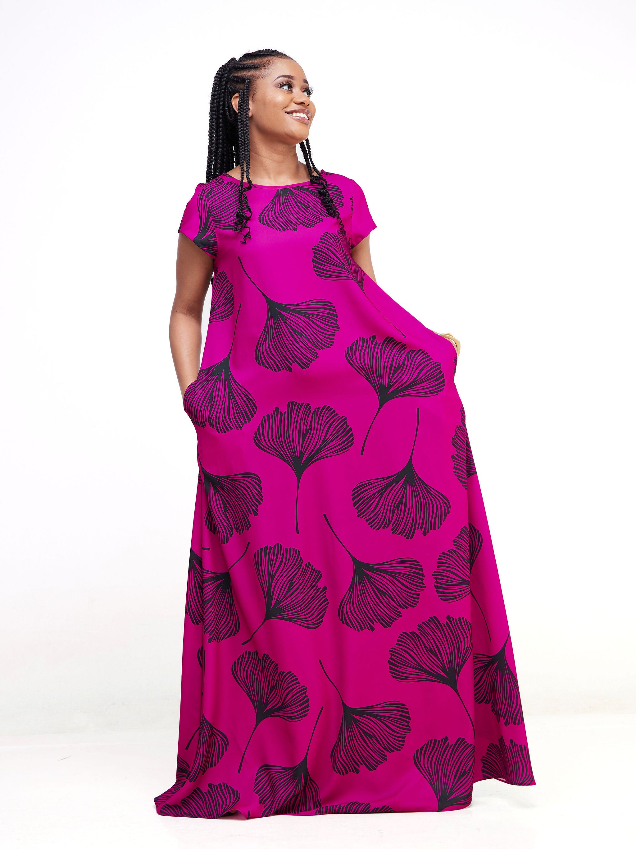 Vivo Basic Cap Sleeved Tent Maxi Dress - Pink / Black Leaf Print