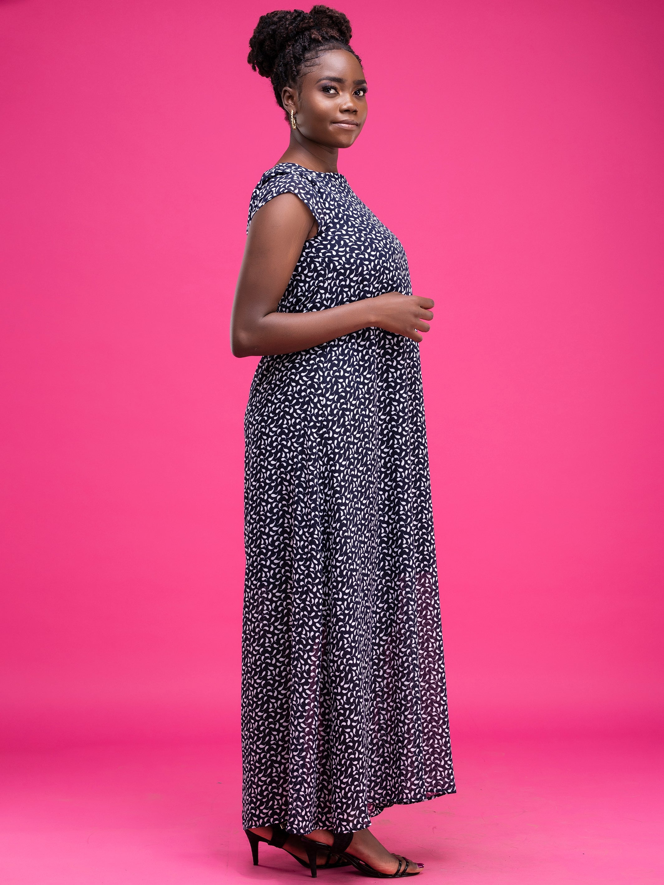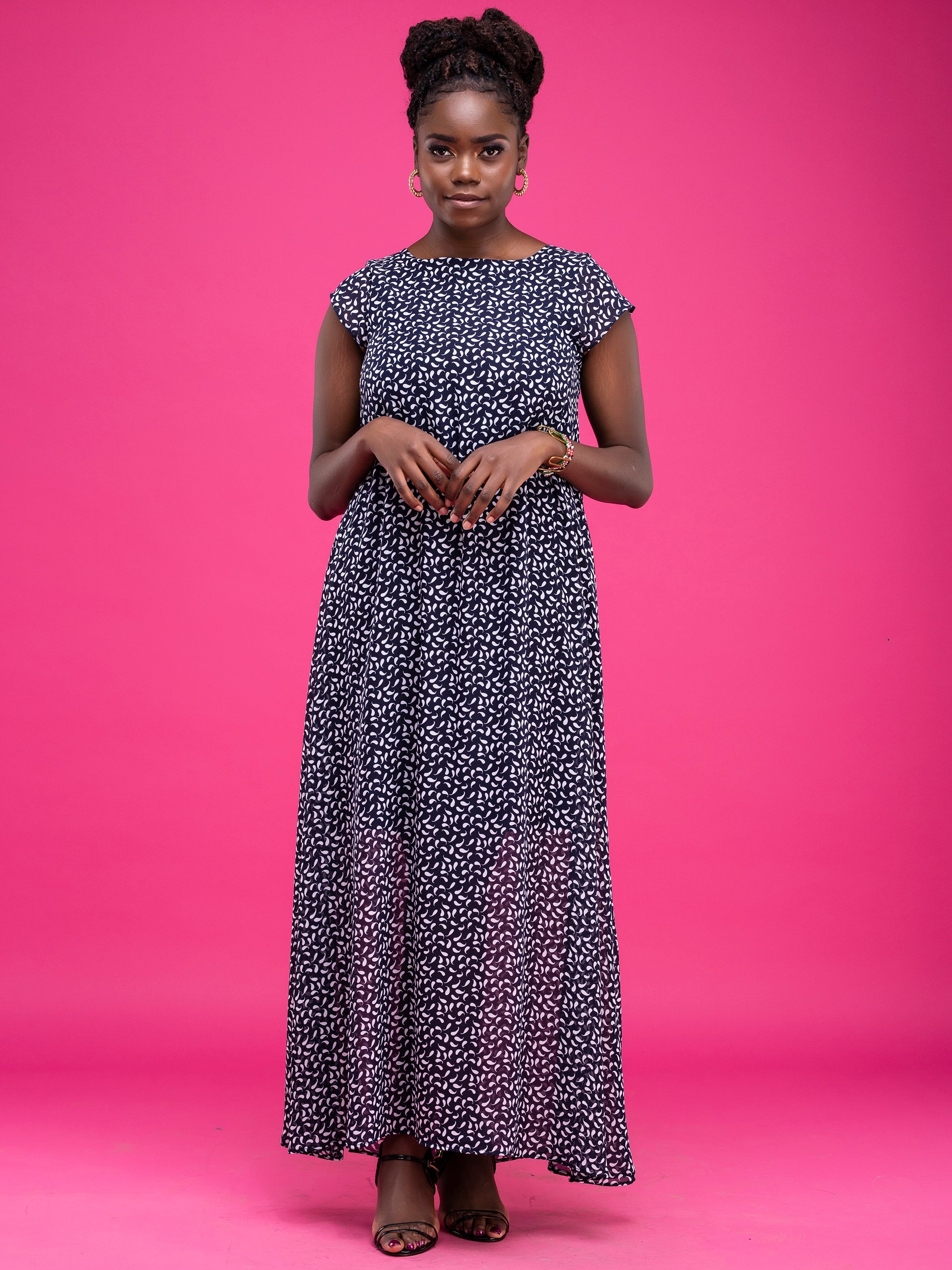 Vivo Basic Cap Sleeved Tent Maxi Dress - Navy Twine Print