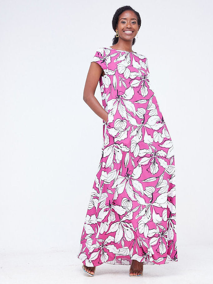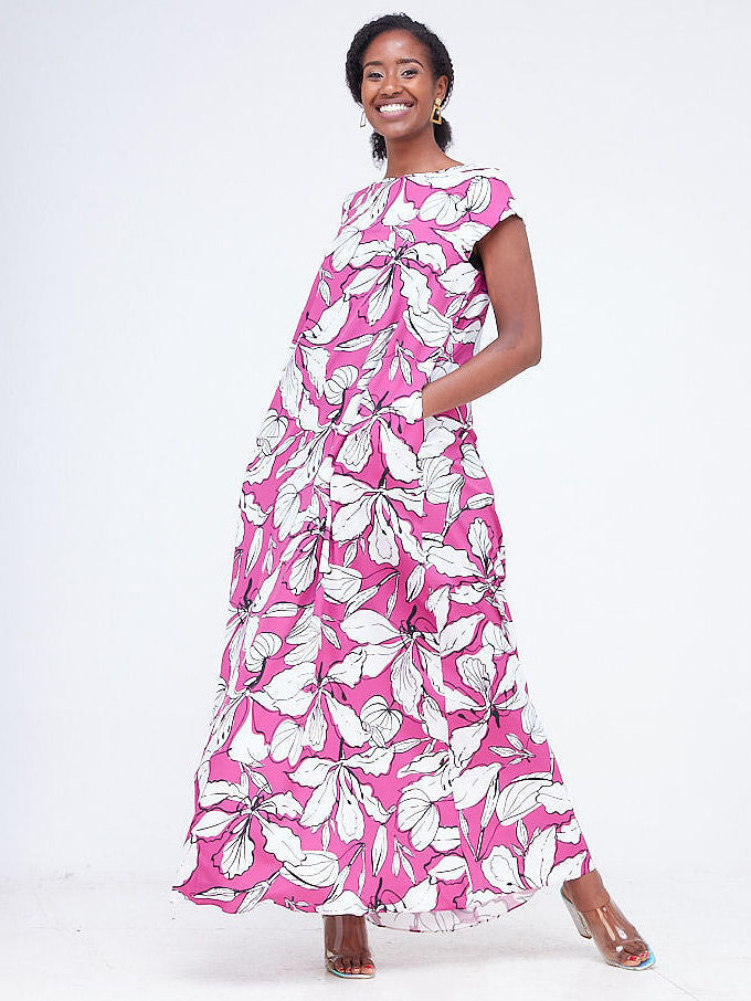 Vivo Basic Cap Sleeved Tent Maxi Dress - Pink / Black Floral Print