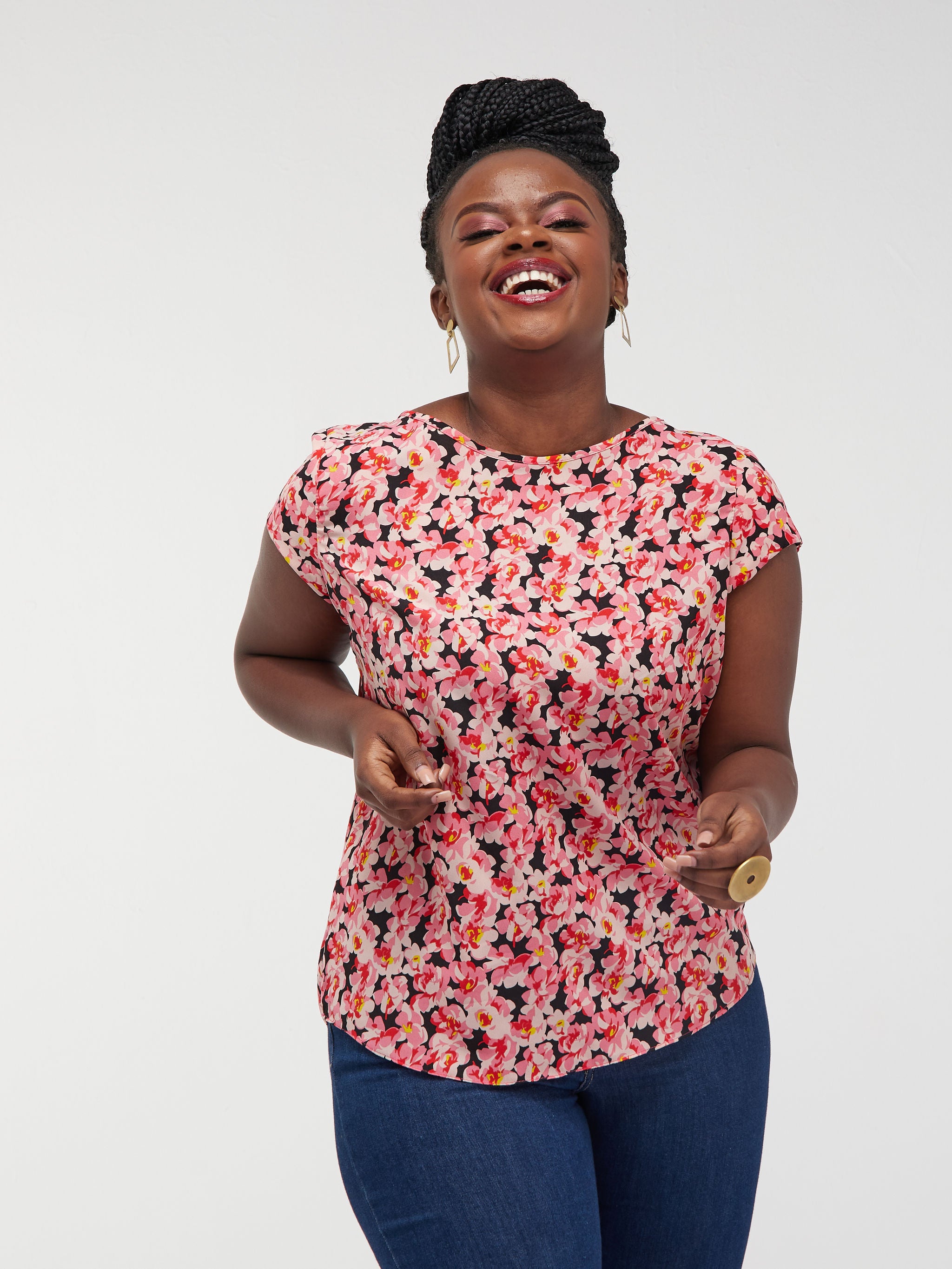 Vivo Basic Crepe Cap Sleeved Top - Pink Rose Print