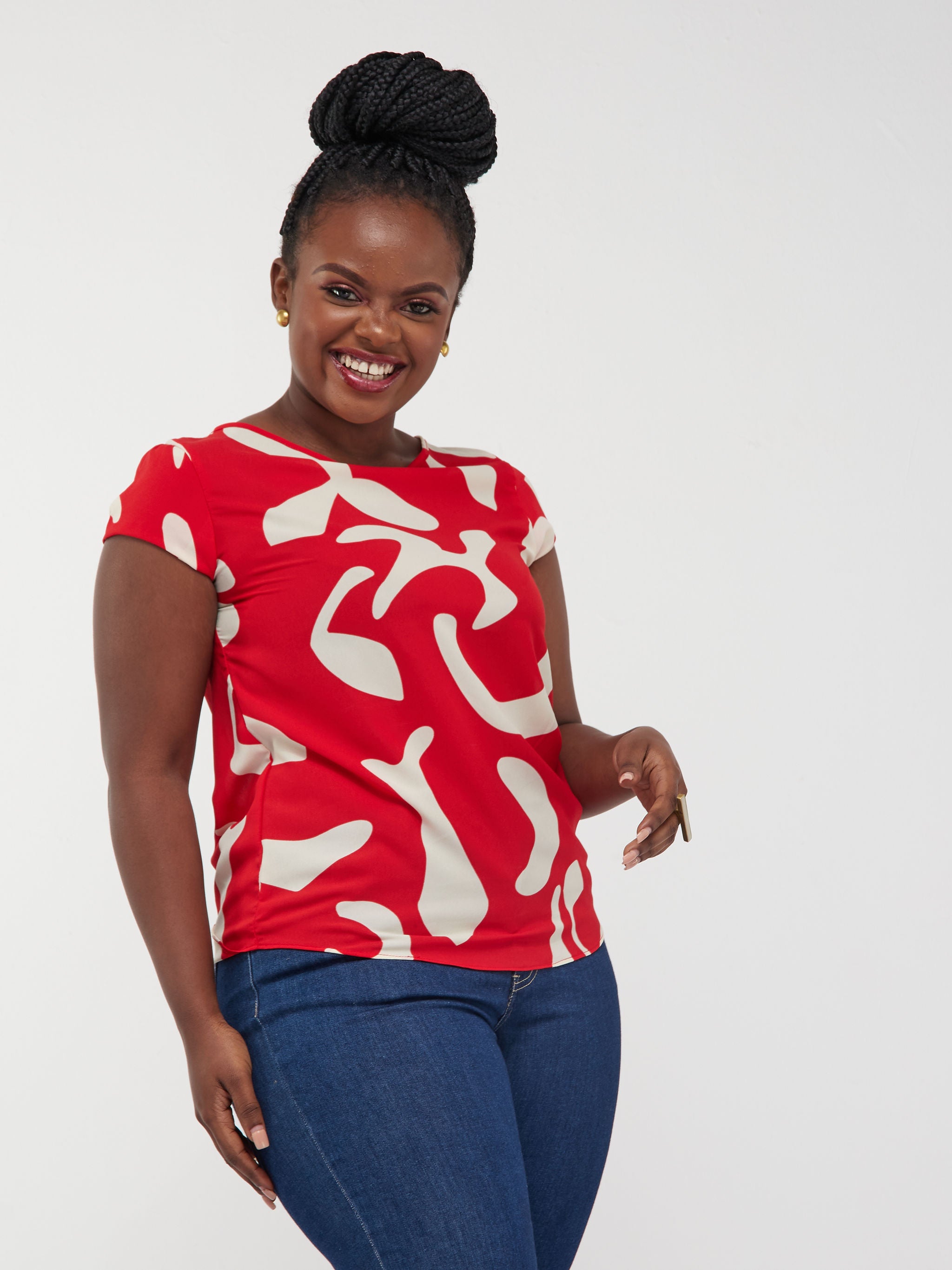 Vivo Basic Crepe Cap Sleeved Top - Red / Black Abstract Print