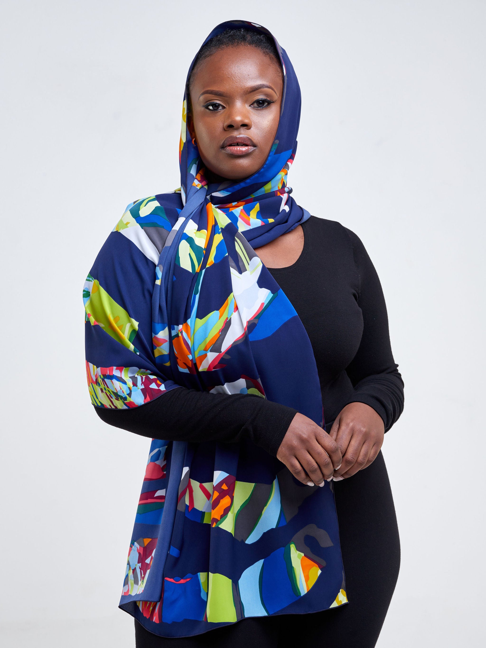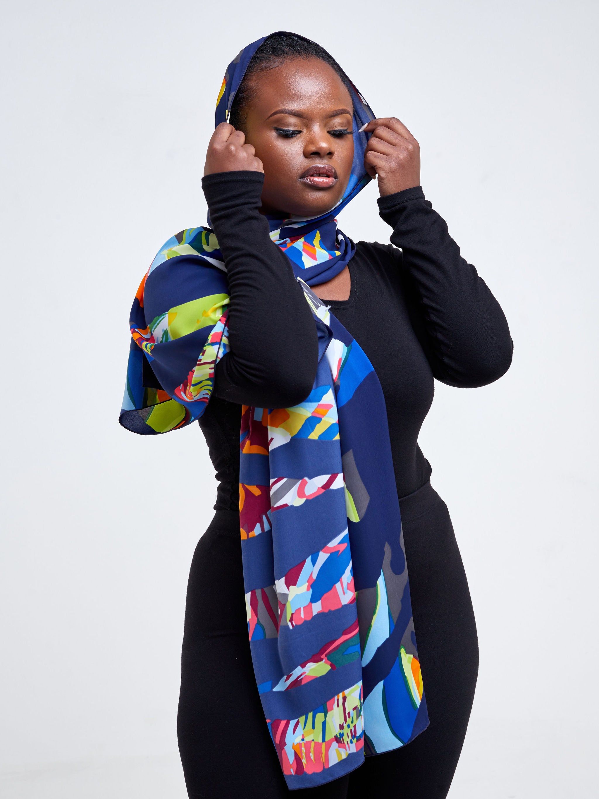 Vivo Basic Crepe Scarf - Navy Blue / Red Multicolour Abstract Print