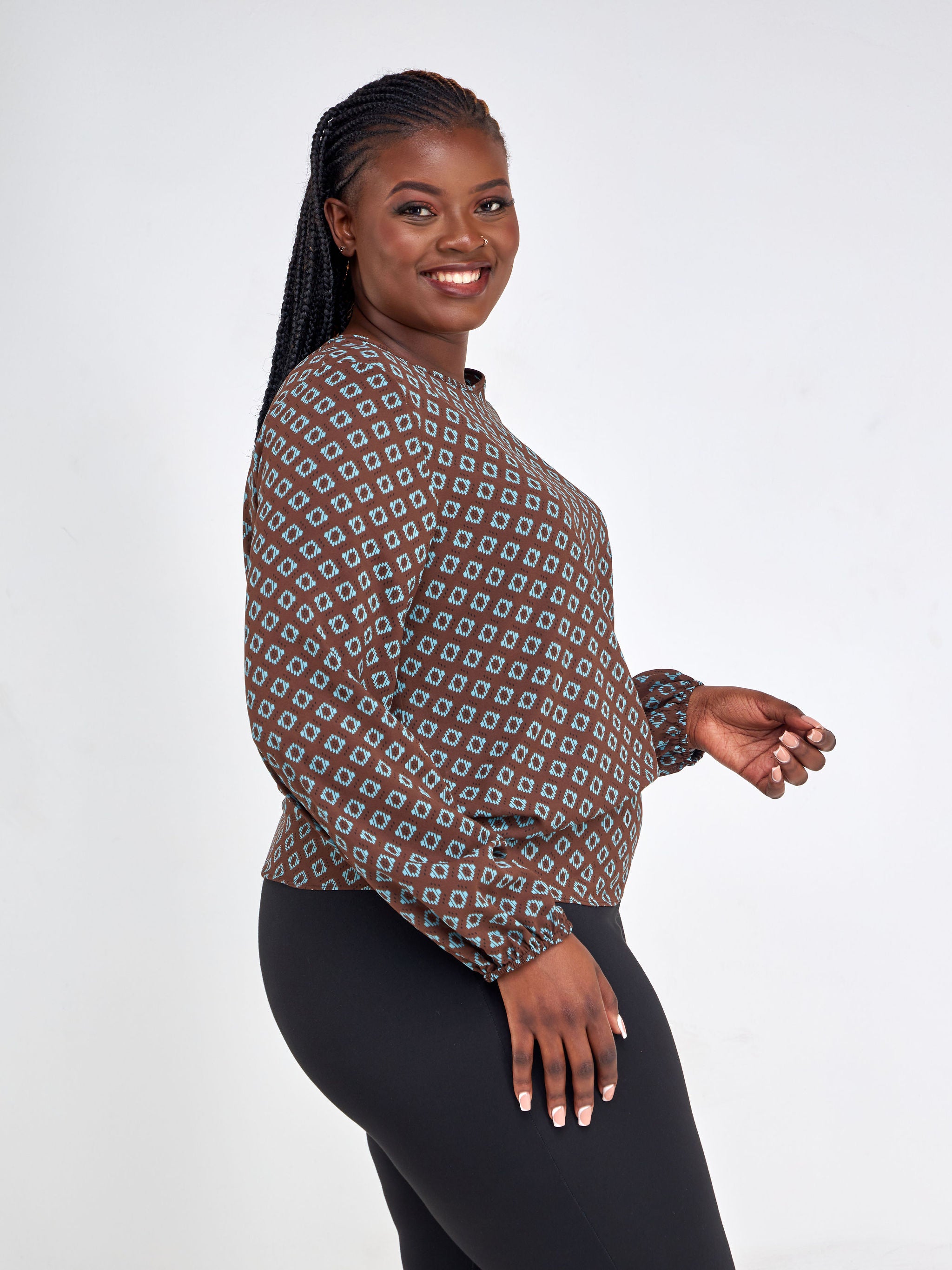 Vivo Basic Long Sleeved Bishop Top - Dark Brown / Blue Abstract Print