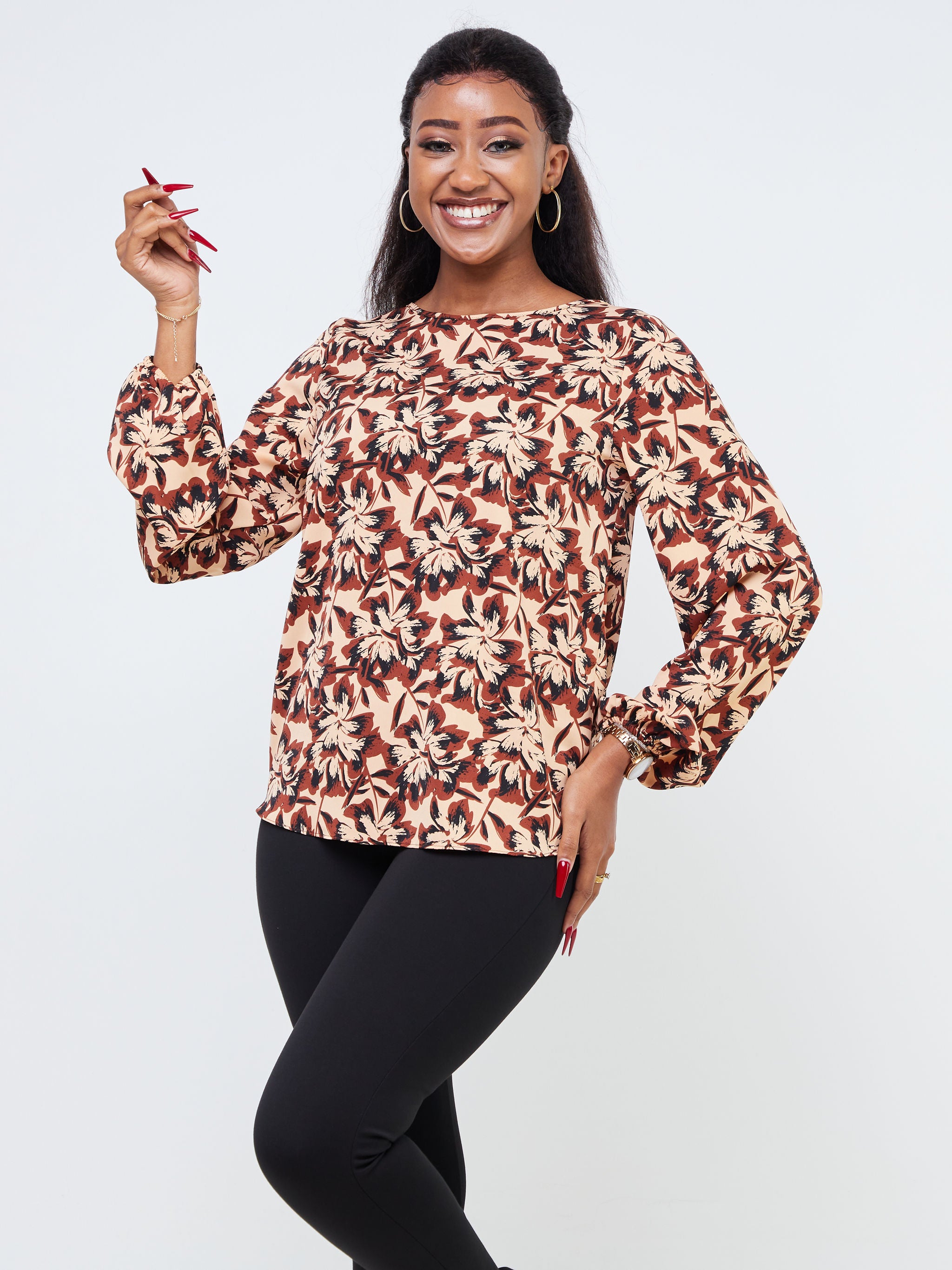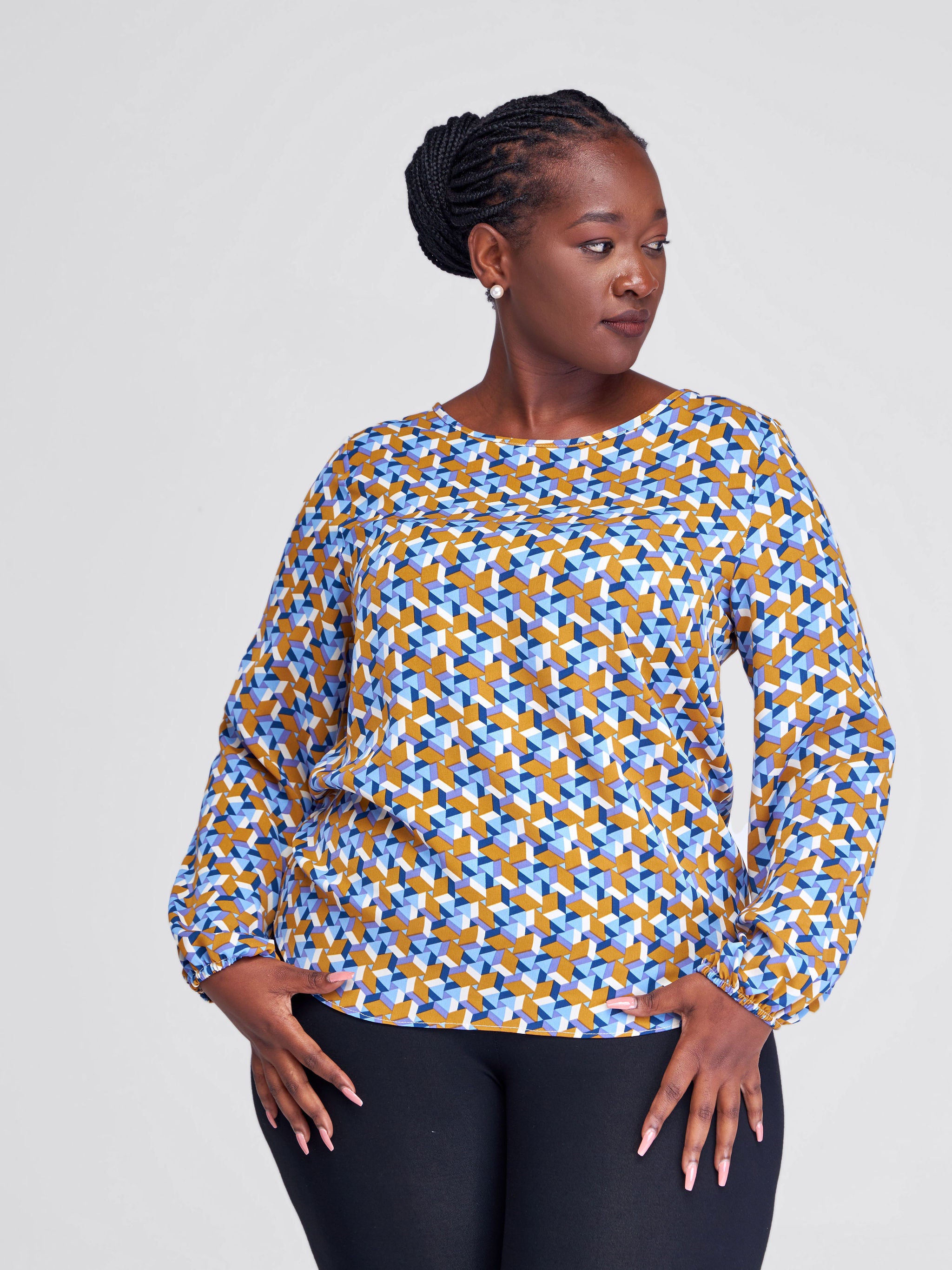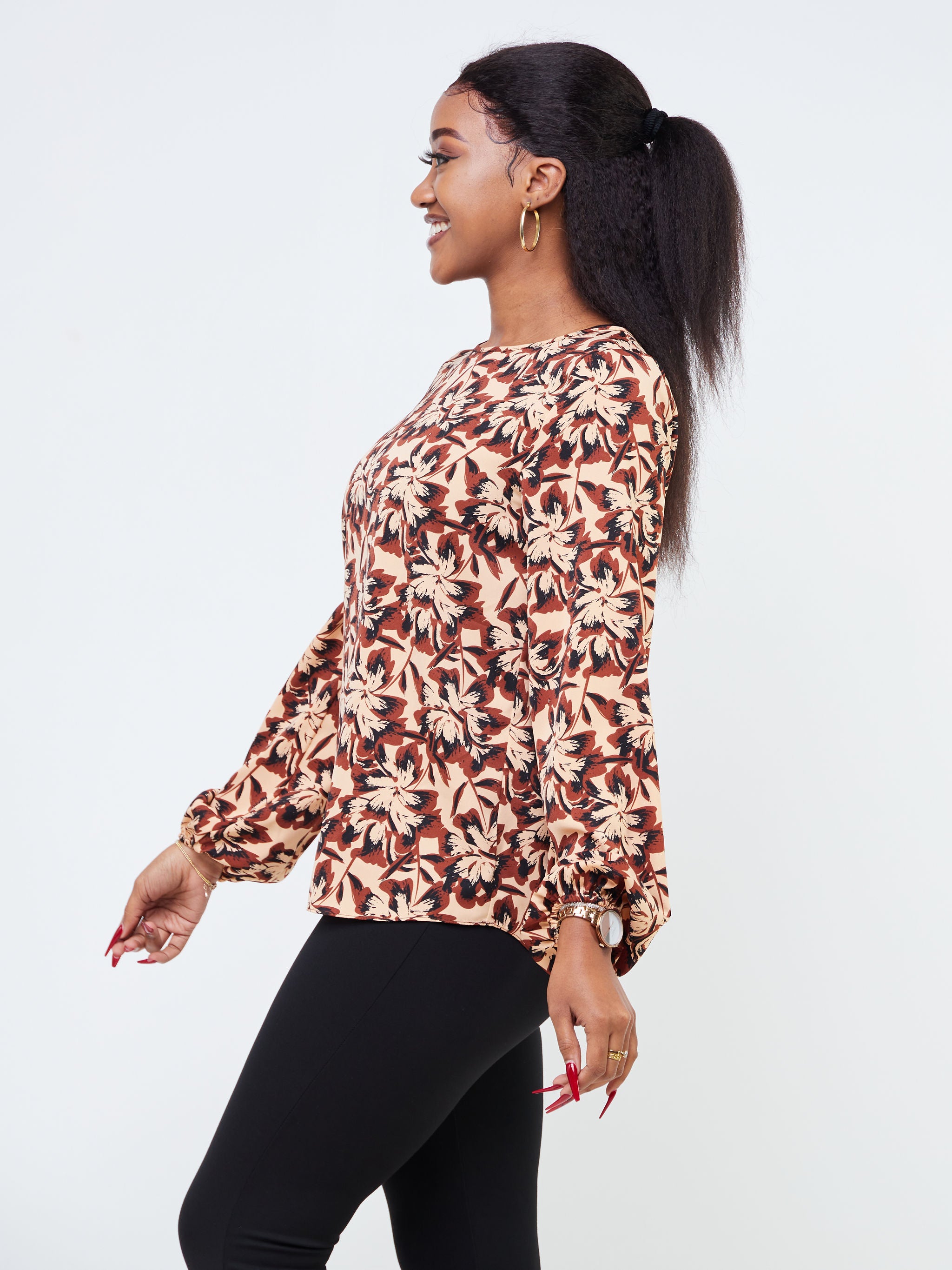 Vivo Basic Long Sleeved Bishop Top - Brown / Blue Multicolour Abstract Print
