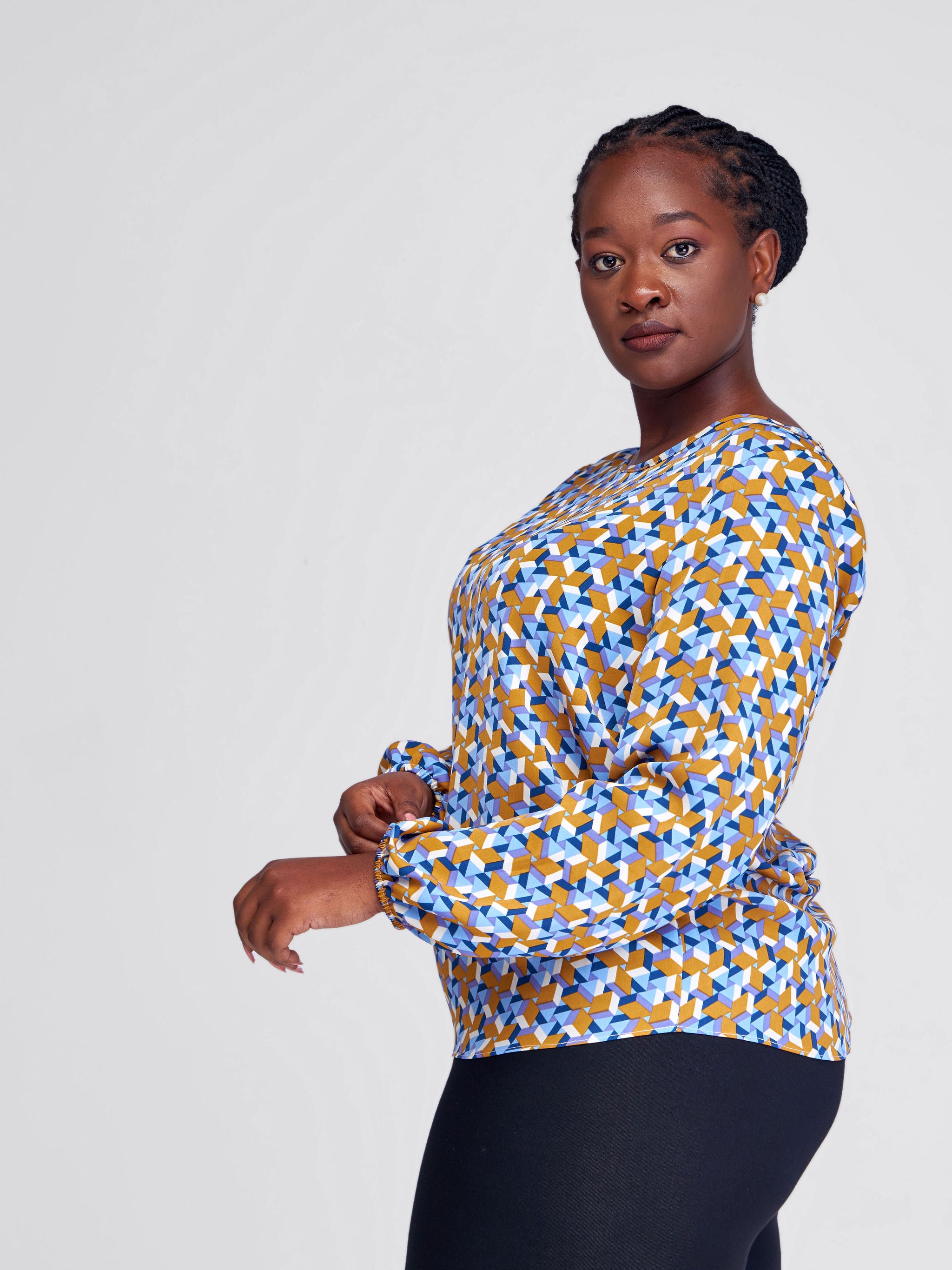 Vivo Basic Long Sleeved Bishop Top - Blue/Yellow Print