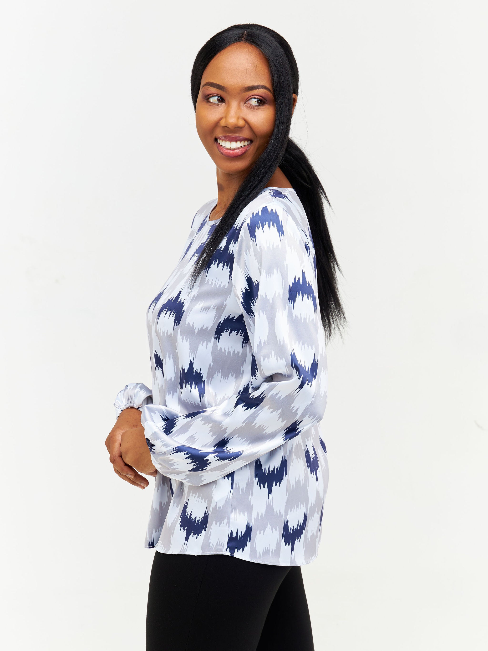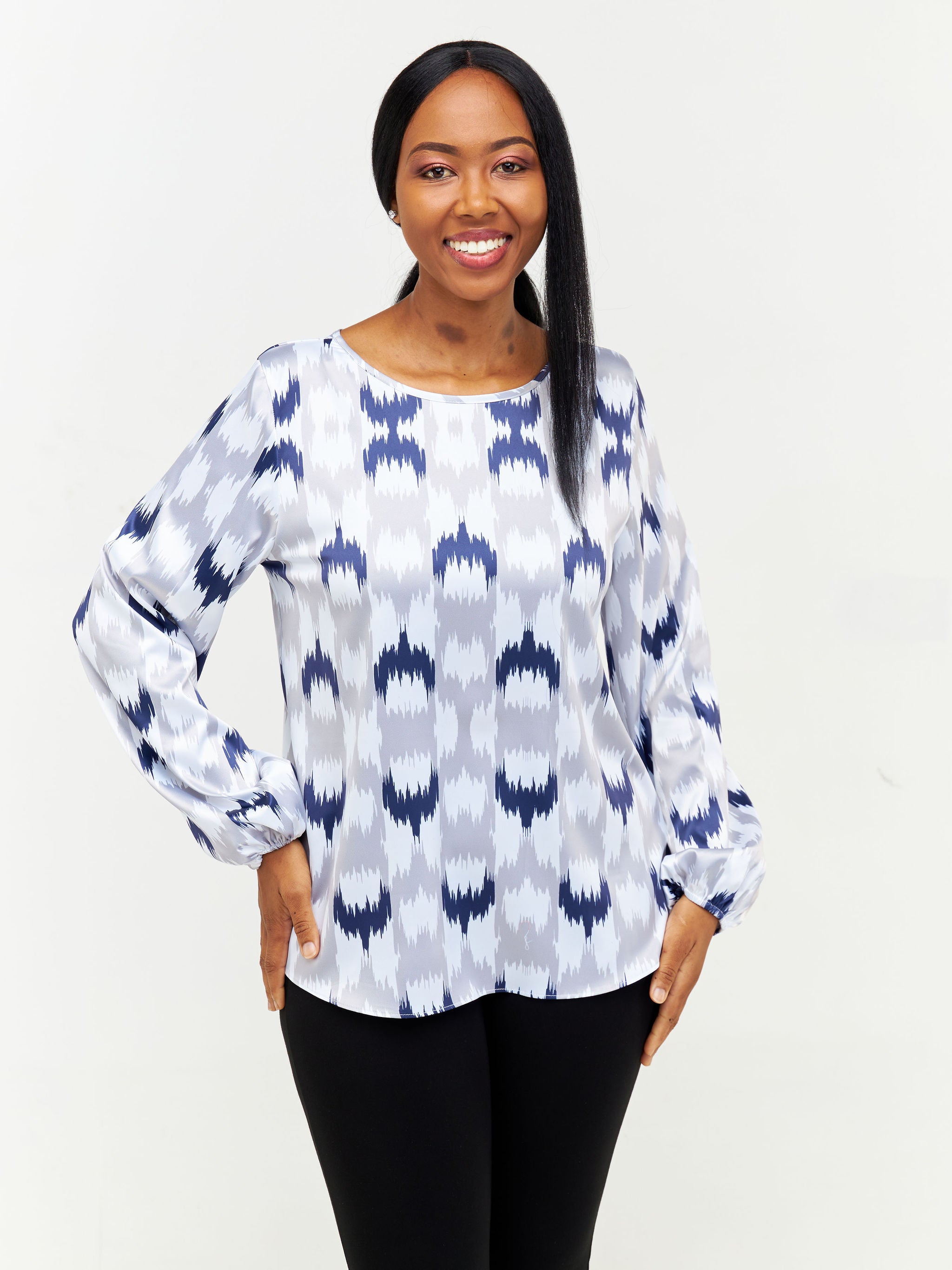 Vivo Basic Long Sleeved Bishop Top - Grey / Navy Blue Abstract Print