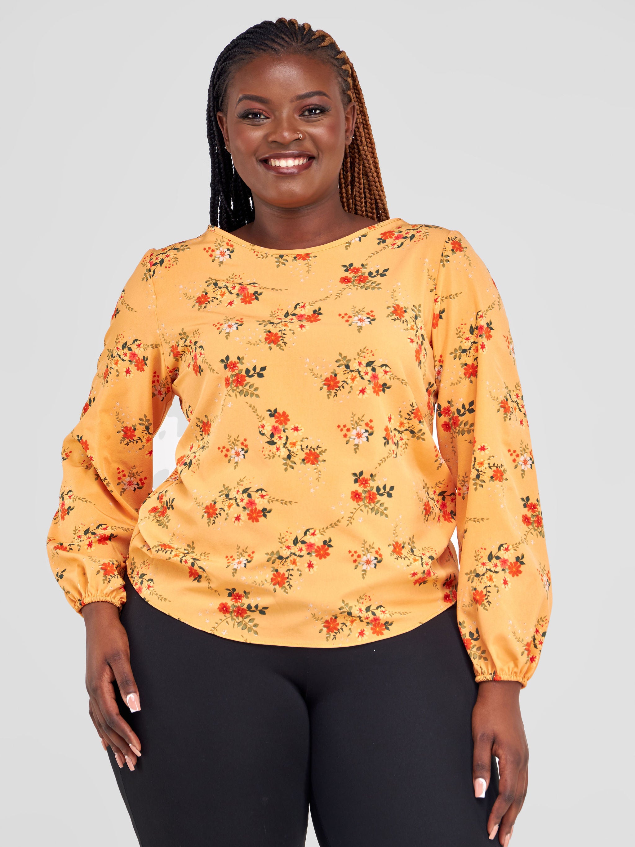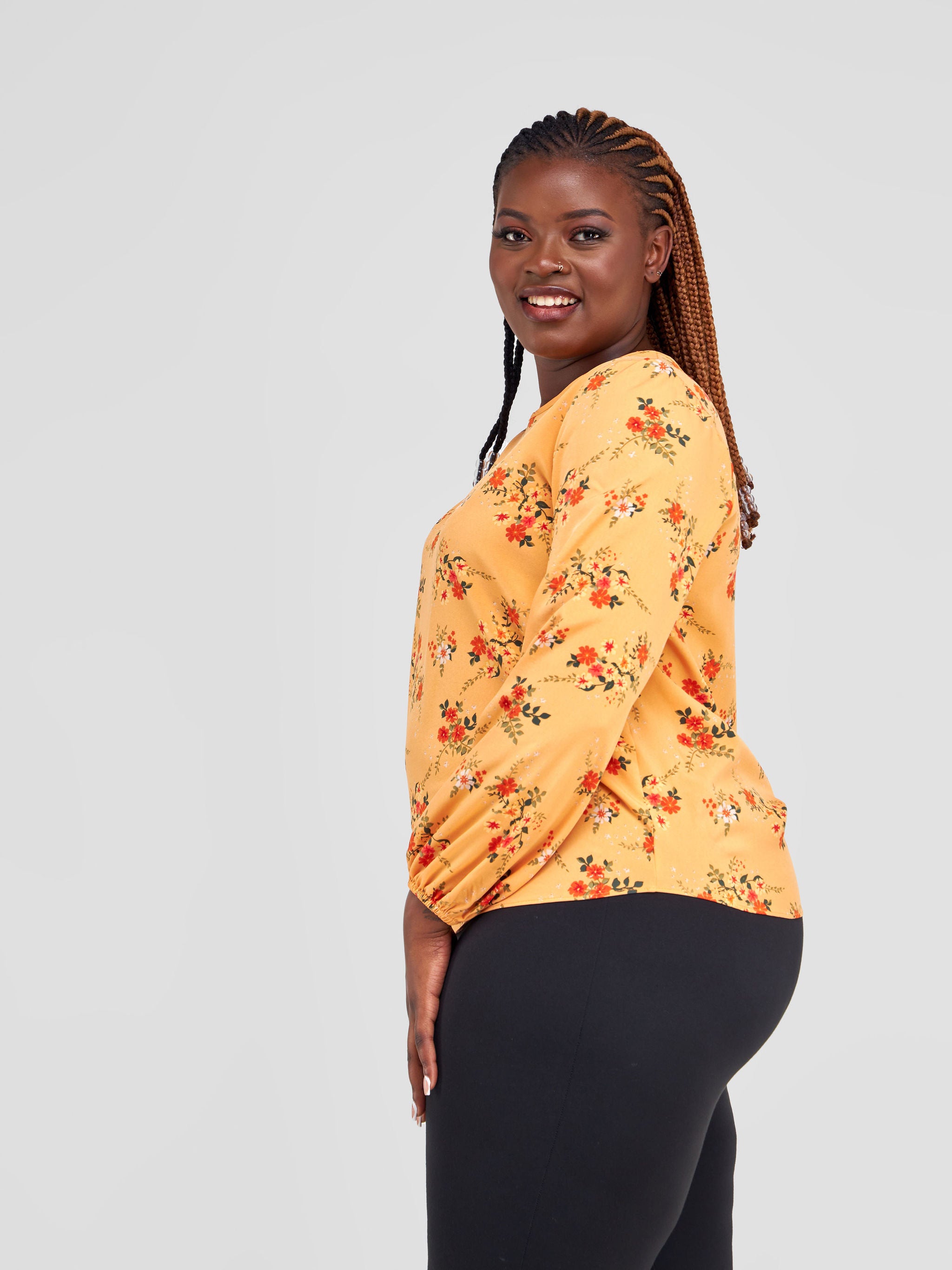 Vivo Basic Long Sleeved Bishop Top - Orange / Green Floral Print