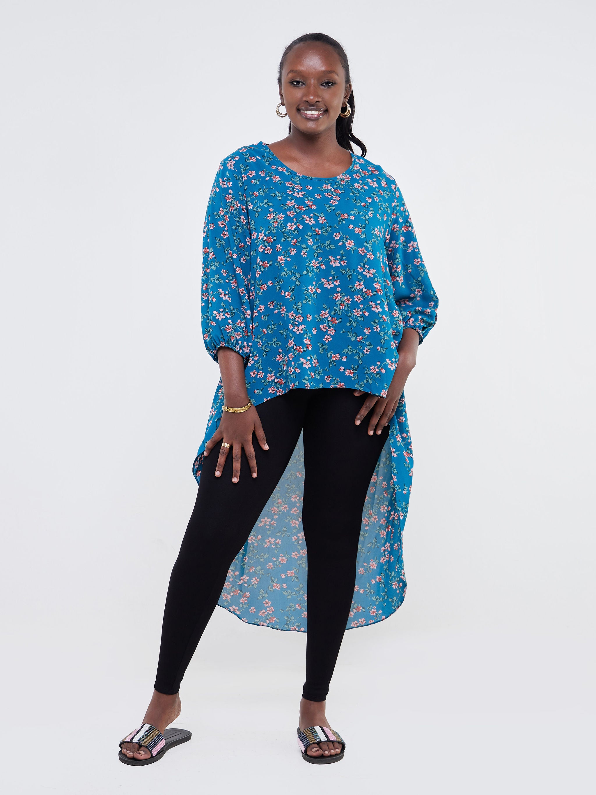 Vivo Basic Nalia High-low Chiffon Top - Teal / Pink Floral Print